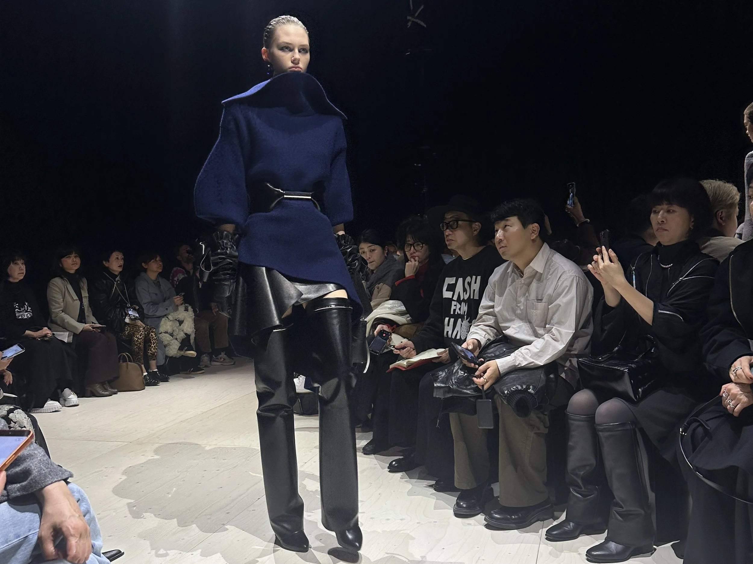 Right after, I walked through the Bois de Vincennes to get to another sophomore show, this time, Jack McCollough and Lazaro Hernandez's Fall/Winter 2026 collection for Loewe. Even though I have a natural proclivity for getting lost, there was no missing the gingham cube sitting inside the Château de Vincennes’ courtyard. Inside the patterned walls were bright yellow lacquered floors, where animal plushies by the artist Cosima von Bonin took up some seats. Thankfully, I wasn’t made to sit next to a deep blue octopus and got to chat with both people I was seated next to. The first of which was a great bouncing board for my frequent “ohs” and “ahs” that latex jumpers and bulbous fur jackets made me vocalise. The second one joined me on my (long) way home, where we sat next to the models that had just walked the show, replaying the livestream to see themselves. The first thing I would do, too, if I had just walked one of the biggest shows of the season.