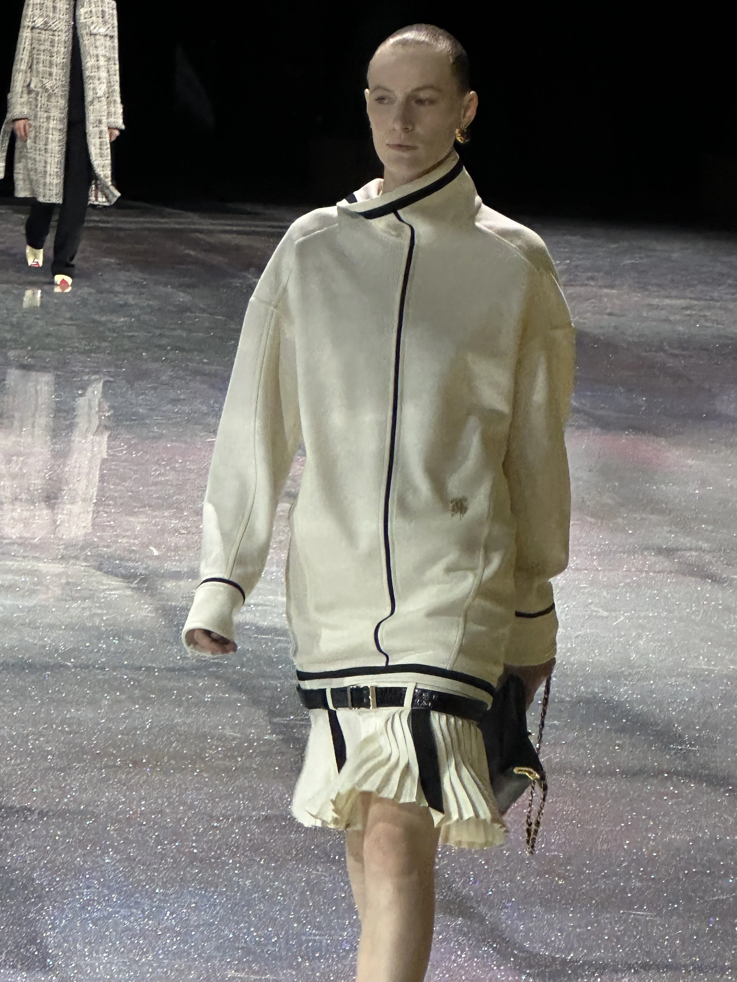 Finally, my carefully planned schedule saved the best for last: Chanel. I can’t quite put into words how excited I was for it. I arrive as soon as the venue’s doors open, one hour before the show, to absorb the set. This season, it was made into a colourful construction zone with twinkling cranes to match. I am in such awe that I think I blacked out. At one point, I started collecting pictures of the rarest bags I saw. As one would imagine, it’s a candy shop for any Chanel lover. Lagerfeld rarities, like the rocket and the slot machine bags, are found among Matthieu Blazy’s recently released debut accessories. Eventually, as I see everyone sit down, I follow suit. The show opens with a wandering spotlight and a song in Portuguese. My self-centred ego immediately makes it about myself. “This is the universe, it was meant to be.”