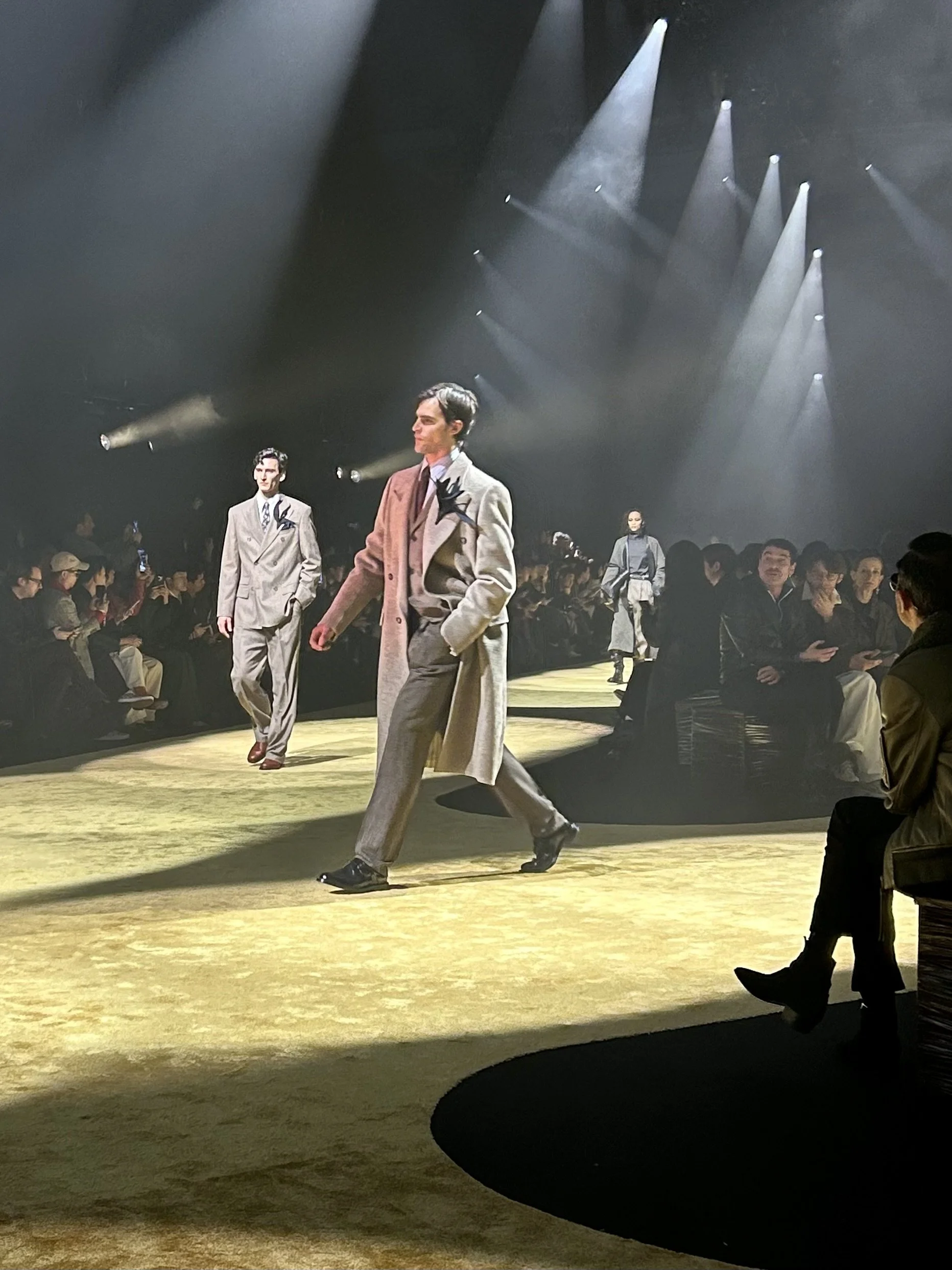 The next morning, I woke up at about 4:45 am – excitement about fashion will do that to you! My first event of the day was the BOSS show, about six hours later. So after two baths (my room had a free-standing bathtub, the dream) and a breakfast in the middle, I was ready to be picked up by the driver (Hugo Boss is fancy like that!) to go to the venue. Thirty minutes later, we arrived at the grand industrial space that was the show’s location. It may have only been something like 11:30 am, but the champagne was flowing. Before even entering the runway space, I already spotted one major star – Sir David Beckham! Well, he was behind a golden rope taking step-and-repeat pics, but still. As for the collection, the show opened with Parker Van Noord (crush alert!) in a roomy wool coat with wide lapels. For the past few seasons, BOSS has been excelling at making tailoring exciting again – this time around, by re-contextualising classic fits from the 1980s and 1990s (a bit American Psycho, a bit cunt) and styling them with loose officer’s boots, leather flowers and silk ties. Gorgeus!