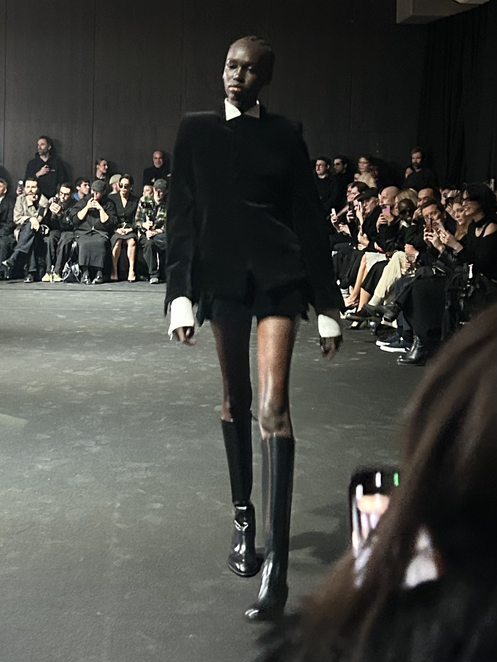 After managing to have lunch at home (not all of my meal prep went to waste, only most of it), I sprinted to Givenchy. There was no way I was going to miss Sarah Burton’s latest collection on the first anniversary of her debut. With each collection, she’s been edifying her vision for the maison, and here the picture was crystal clear: feminine but masculine, elegant but powerful. Reworking the shark boots into thigh-high and silk iterations was beyond genius; the selection of artists among models on the runway was equally brilliant. As a witness to my experience, I have an editor friend of mine, the kind that I unfortunately only manage to see during fashion weeks. We’re doing the most instinctual thing one can do when sitting and waiting to see a show: reciting our schedules. I tell him I’m going to Yohji Yamamoto next; he immediately asks me if I’ve ever been to one of his shows, to which I reply “no.” He lets me know that they’re great, but that I shouldn’t go if I’m in a rush to get somewhere. I don’t quite understand him at first. No show starts on time; everyone takes forever to enter and leave venues – it’s part of the gig. It only takes for a Yohji Yamamoto show to start for me to get what he was saying. It’s a slow-burning show. The music is soft, models walk gently, and there are never more than two models on the runway. It’s a very specific vibe, but one that I’m a big fan of. Maybe it was the soundtrack or the beautiful clothes on the runway, or maybe even slight exhaustion from what, at that point, was already a 12-hour day, but I was extremely emotional by the time the designer came out and took his hat off to bow.