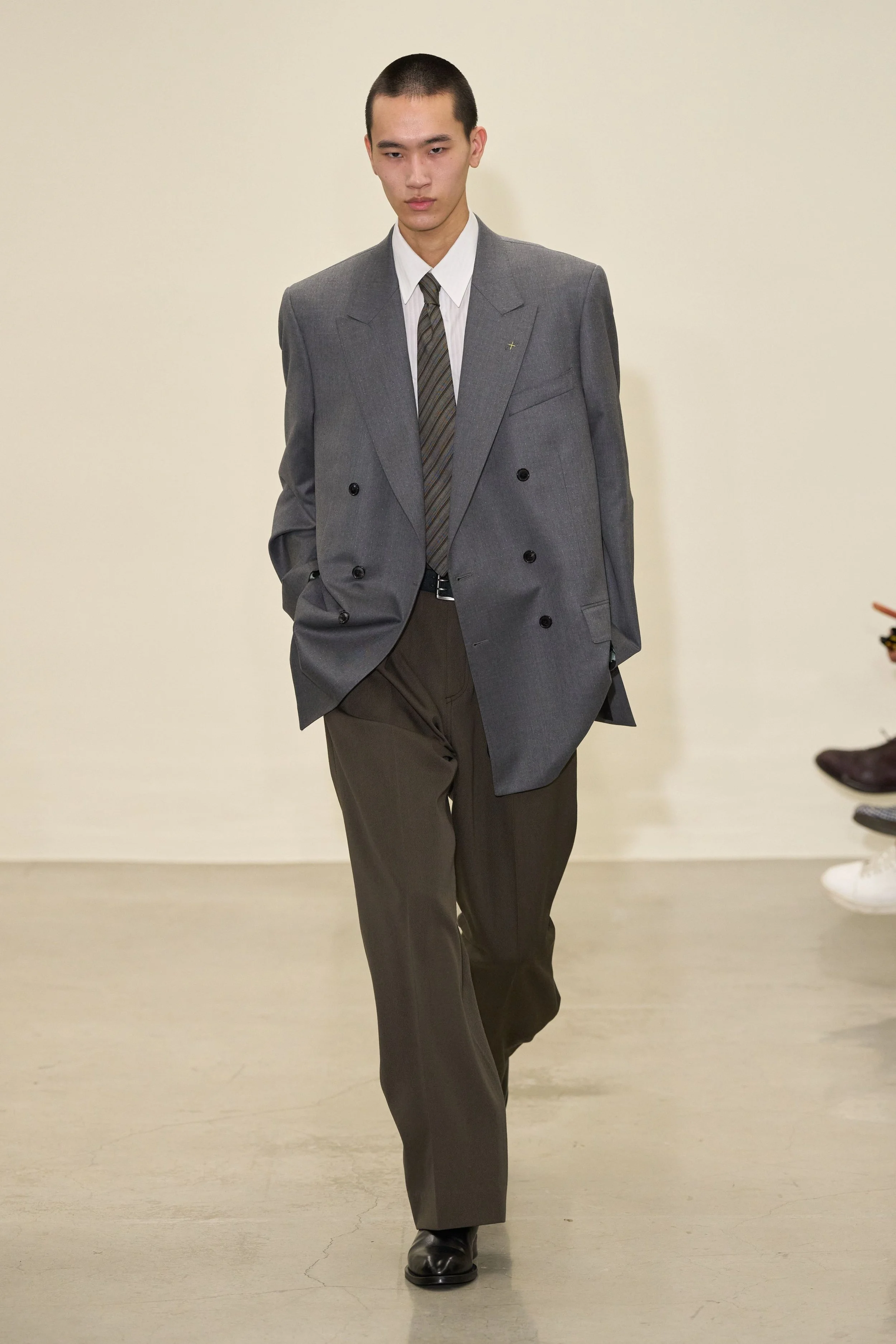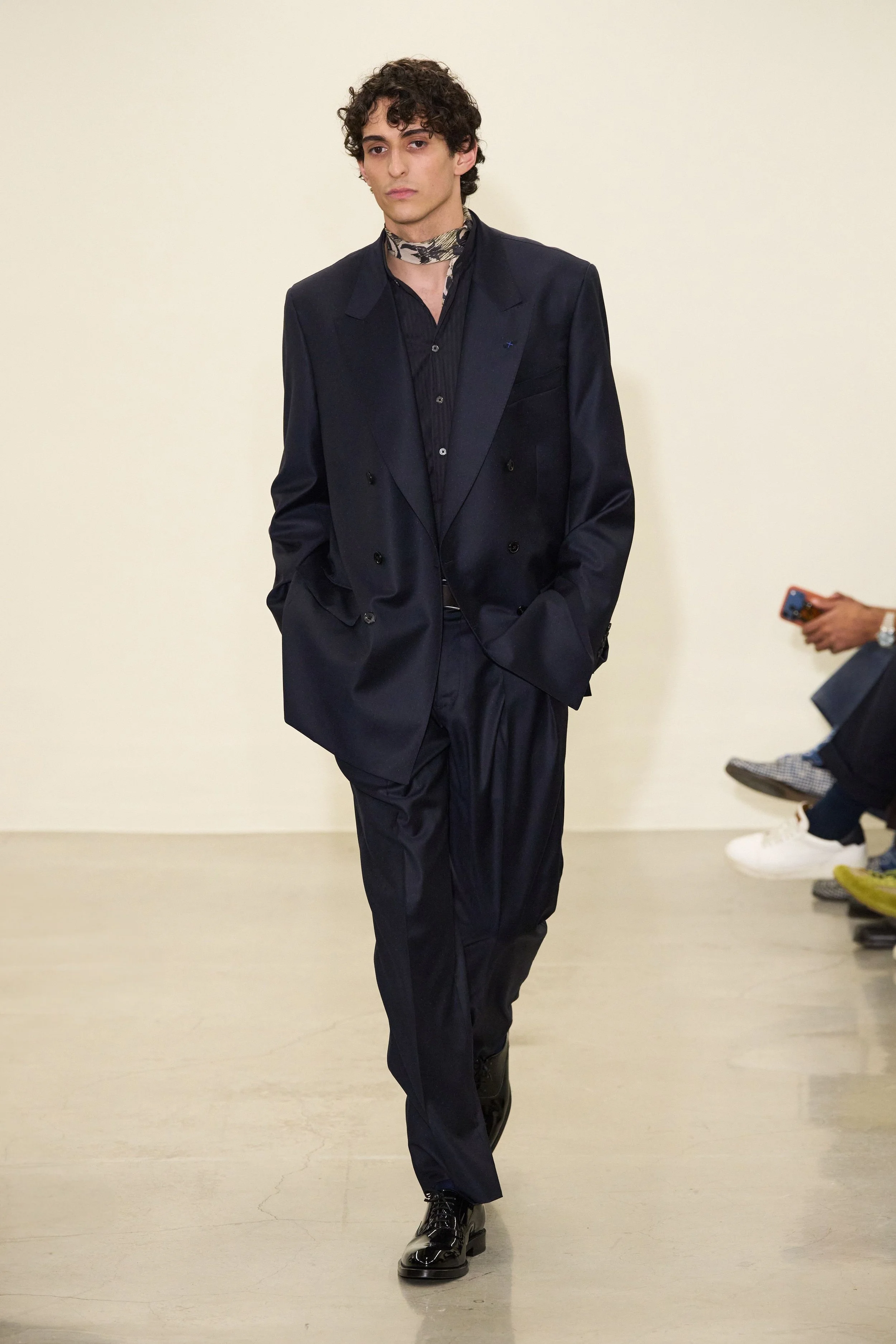 The collection’s rebellious streak carried confidently into eveningwear. A classic three-button suit jacket was reimagined with utilitarian chest pockets, blurring the line between tailoring and function. Elsewhere, a relaxed double-breasted suit in a rich navy hue was softened by a printed necktie, lending ease to an otherwise commanding look.