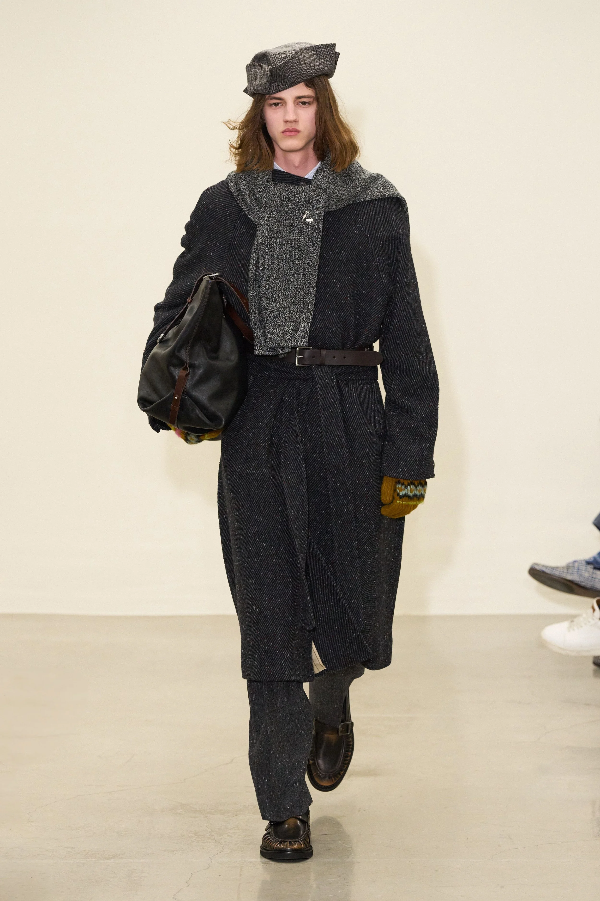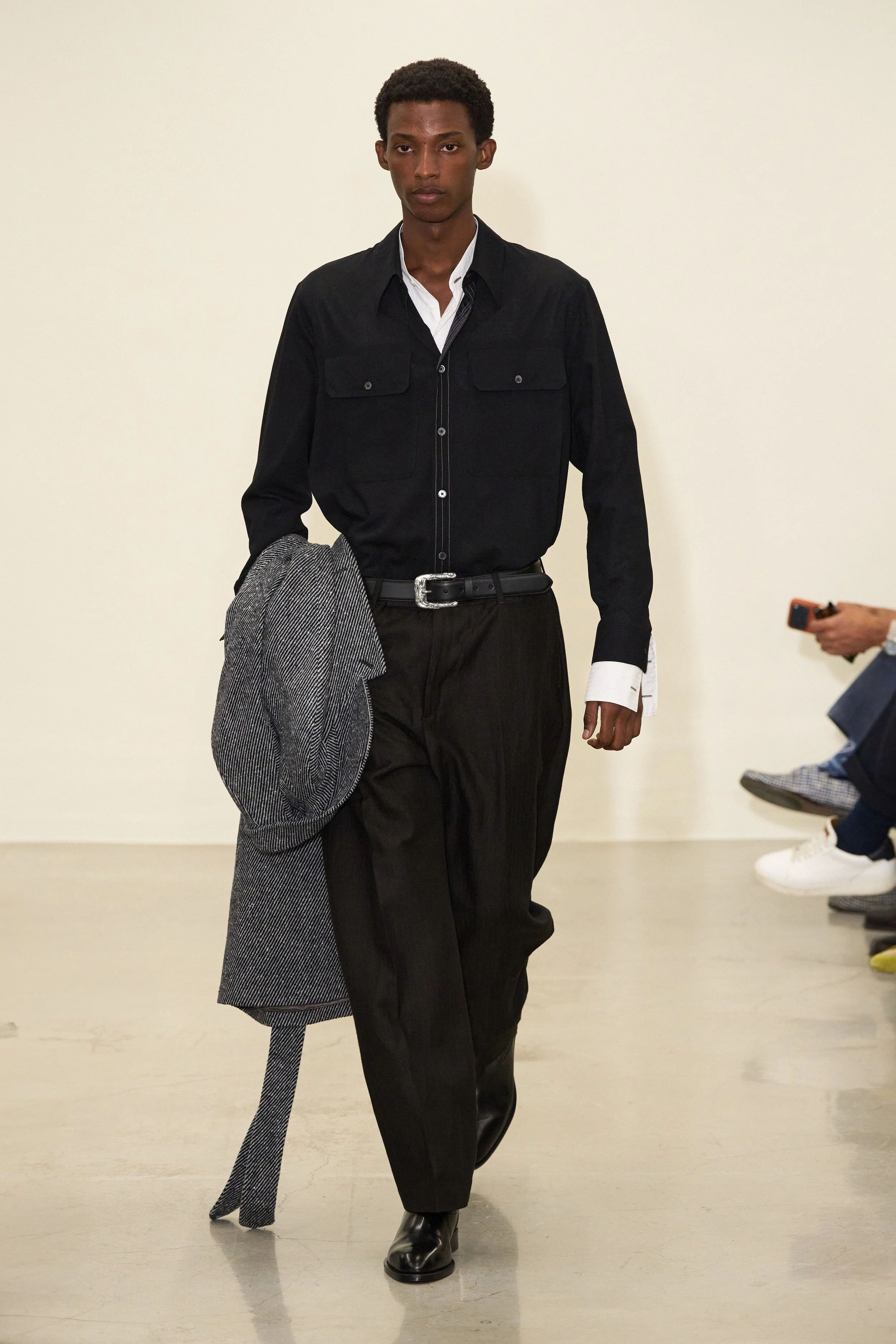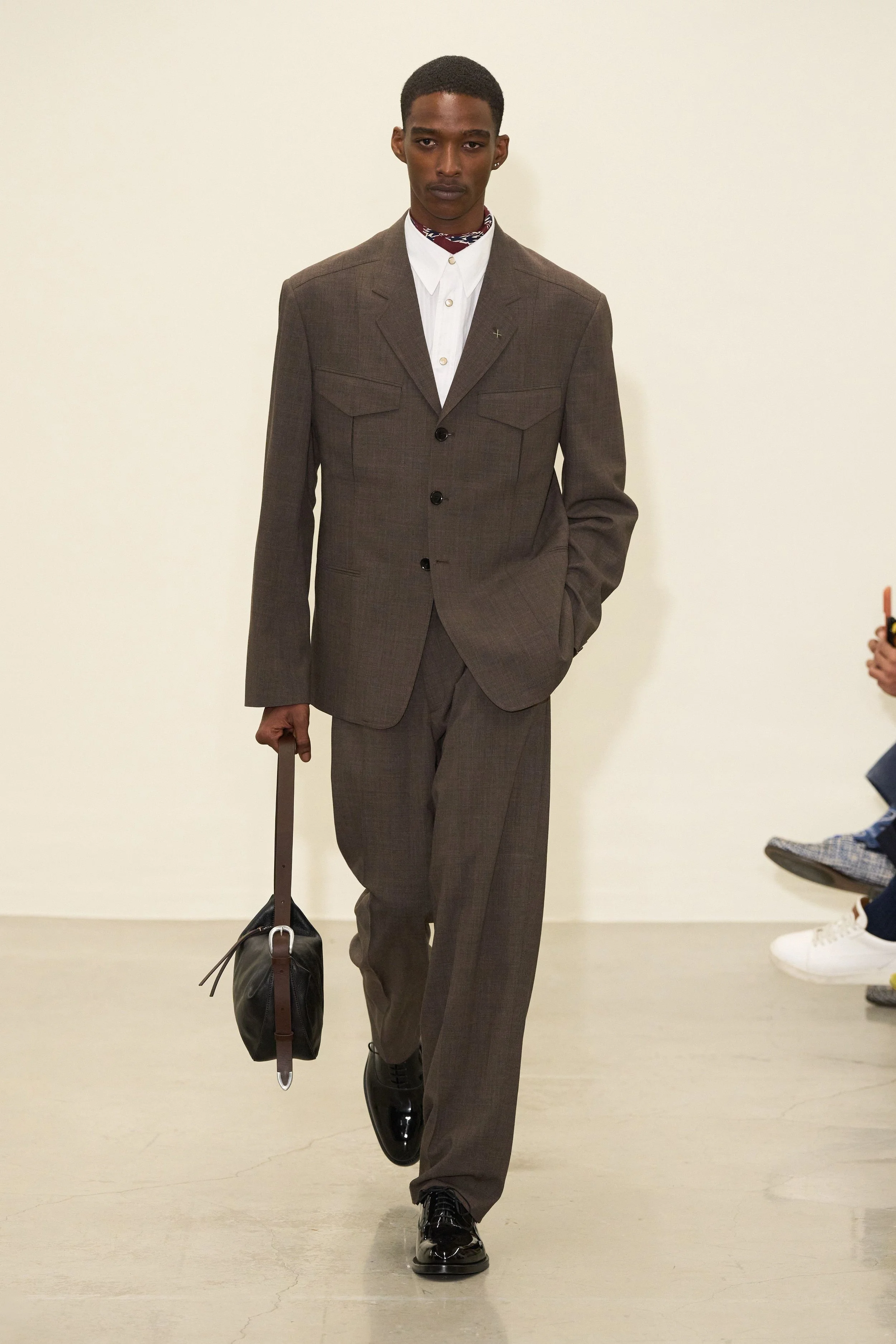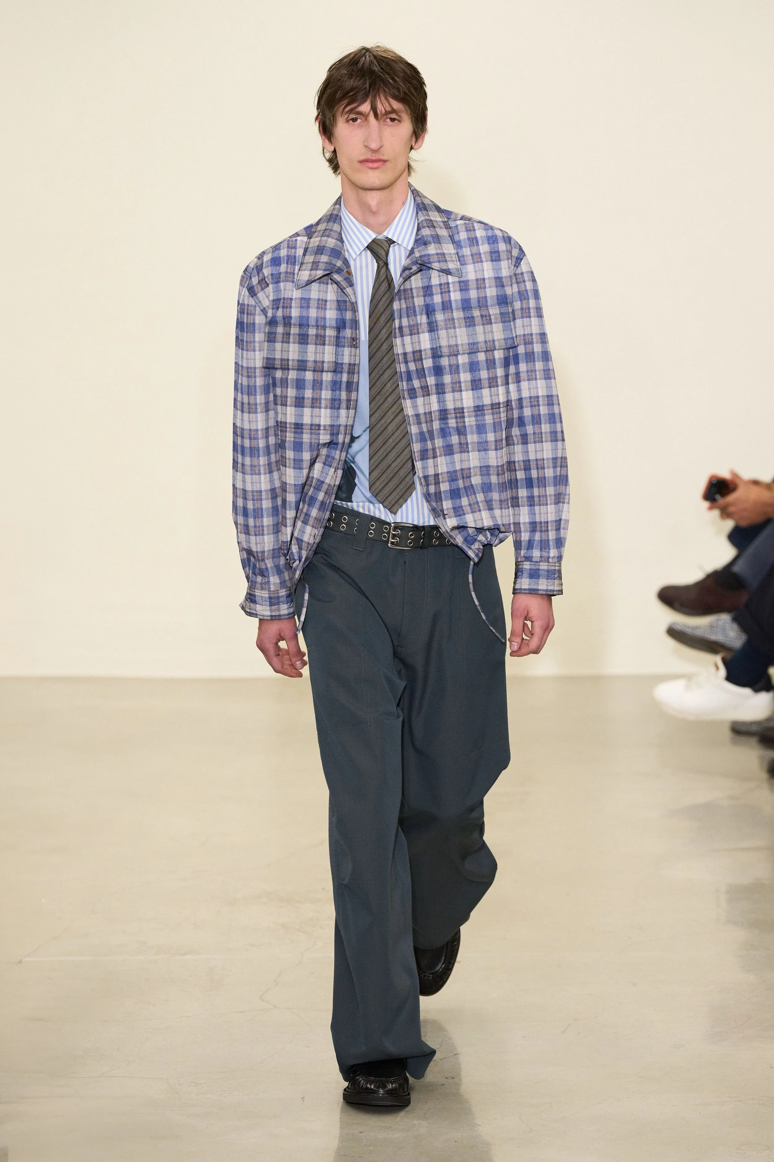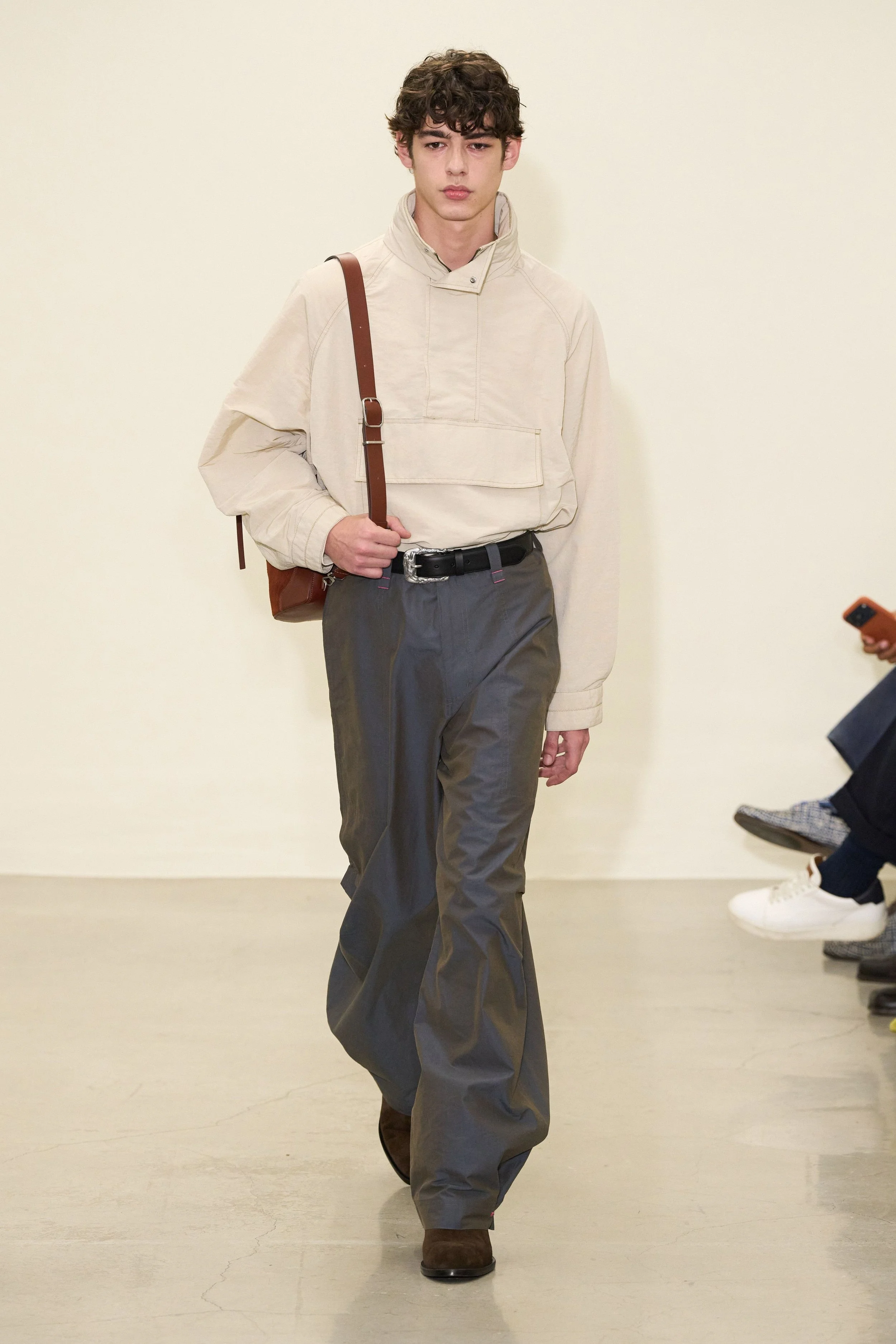 This season, Smith introduced a compelling tension between tradition and edge, layering technical fabrics and leather accents onto familiar wardrobe staples. A light grey nylon coat was styled over a cobalt blue knitted polo, while a black leather overshirt emerged subtly beneath a chocolate-brown blazer. The interplay of texture and colour kept the silhouettes grounded yet charged.