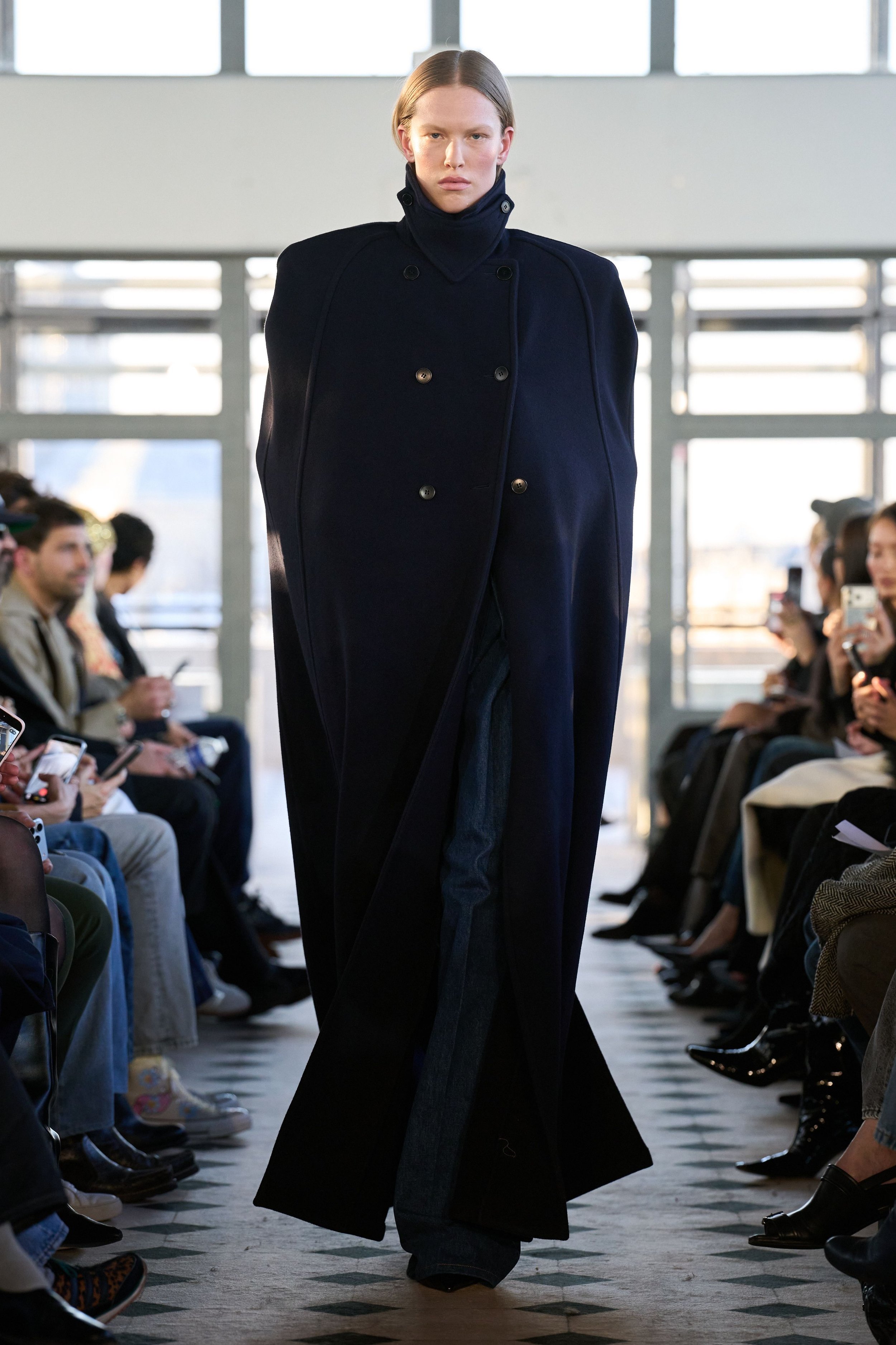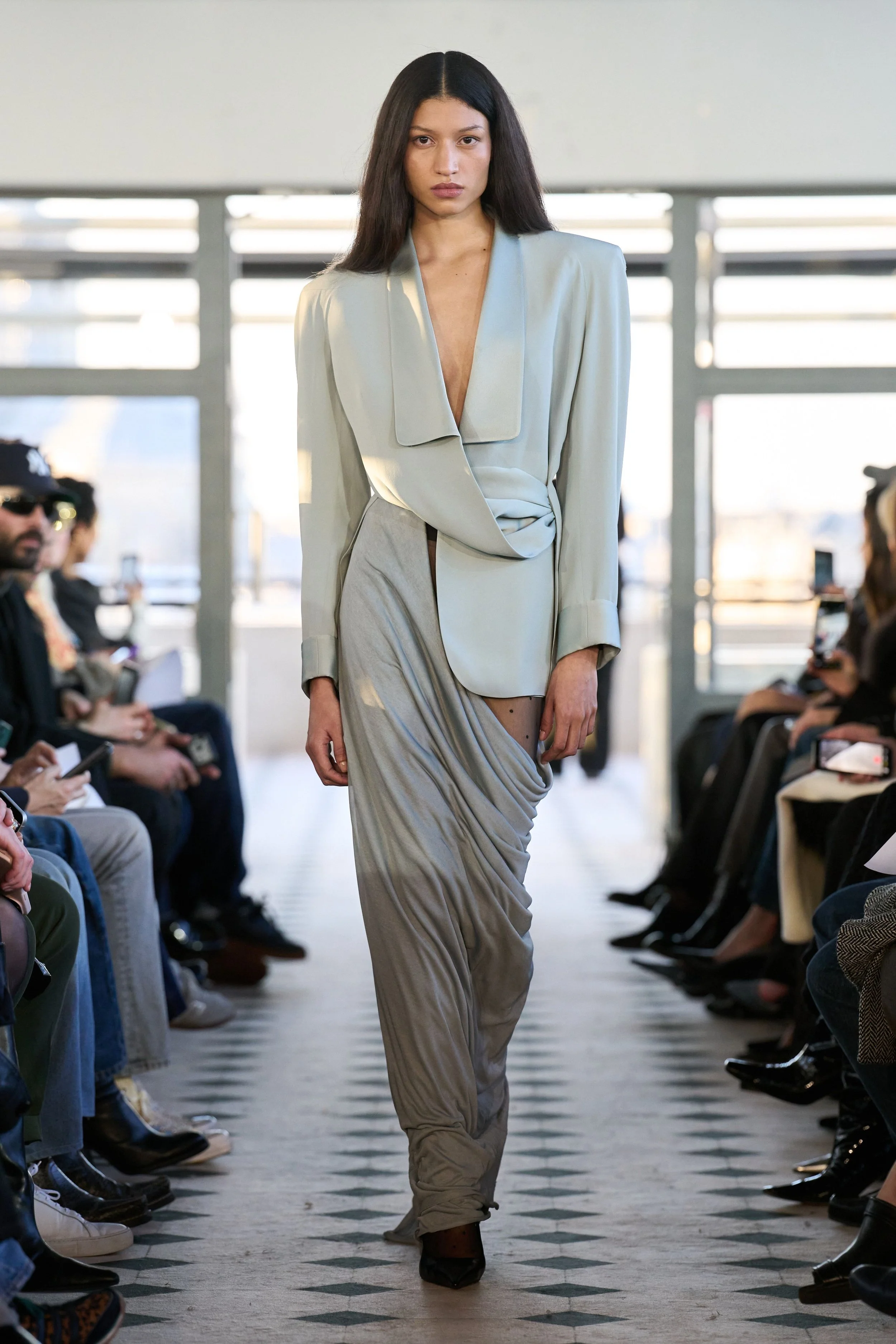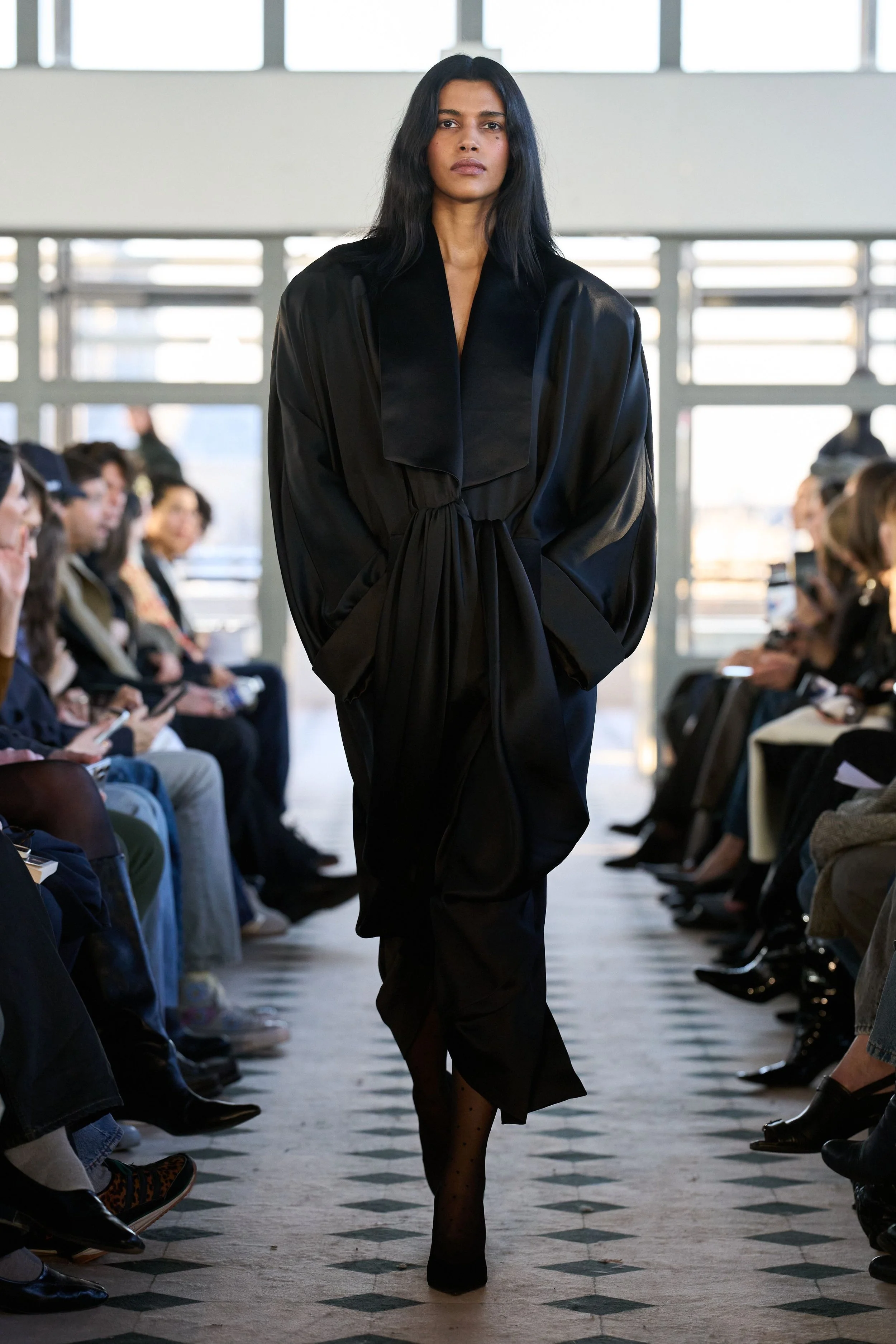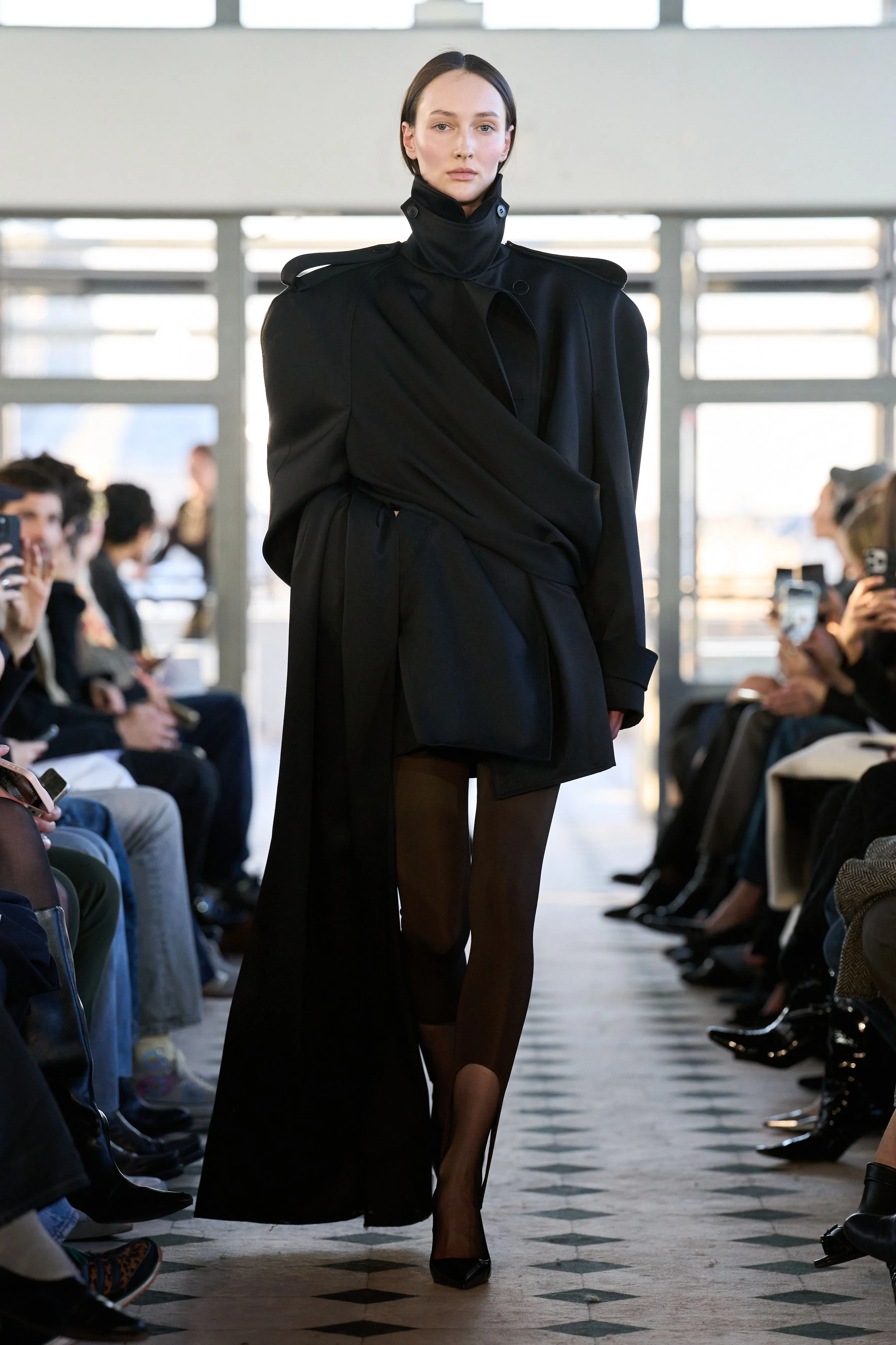 But don’t mistake this romantic sensibility for softness. The offering is a character study in accumulation: of lovers, memories, references, and power. A double-breasted cape in sturdy navy wool demands authority with its wide shoulders and high collar. Later on, its shorter jacket iteration in cream is twisted in the front, showcasing high-waisted jodhpurs paired with ultra-spiky, ultra-high heels. A dress-coat hybrid in black silk creates an equally effective and comfortable uniform for the long night ahead. Each piece feels lived in before it’s worn, as if the fabric already remembers something juicy, scandalous. The eroticism here isn’t obvious – it’s structural, in the tension between restraint and collapse, pocketed hands and barely-held shapes. Cocktail dresses in jersey feature dramatic side openings, showcasing legs clad in sheer tights with black dots – a classic Parisian staple that always creates a moment.