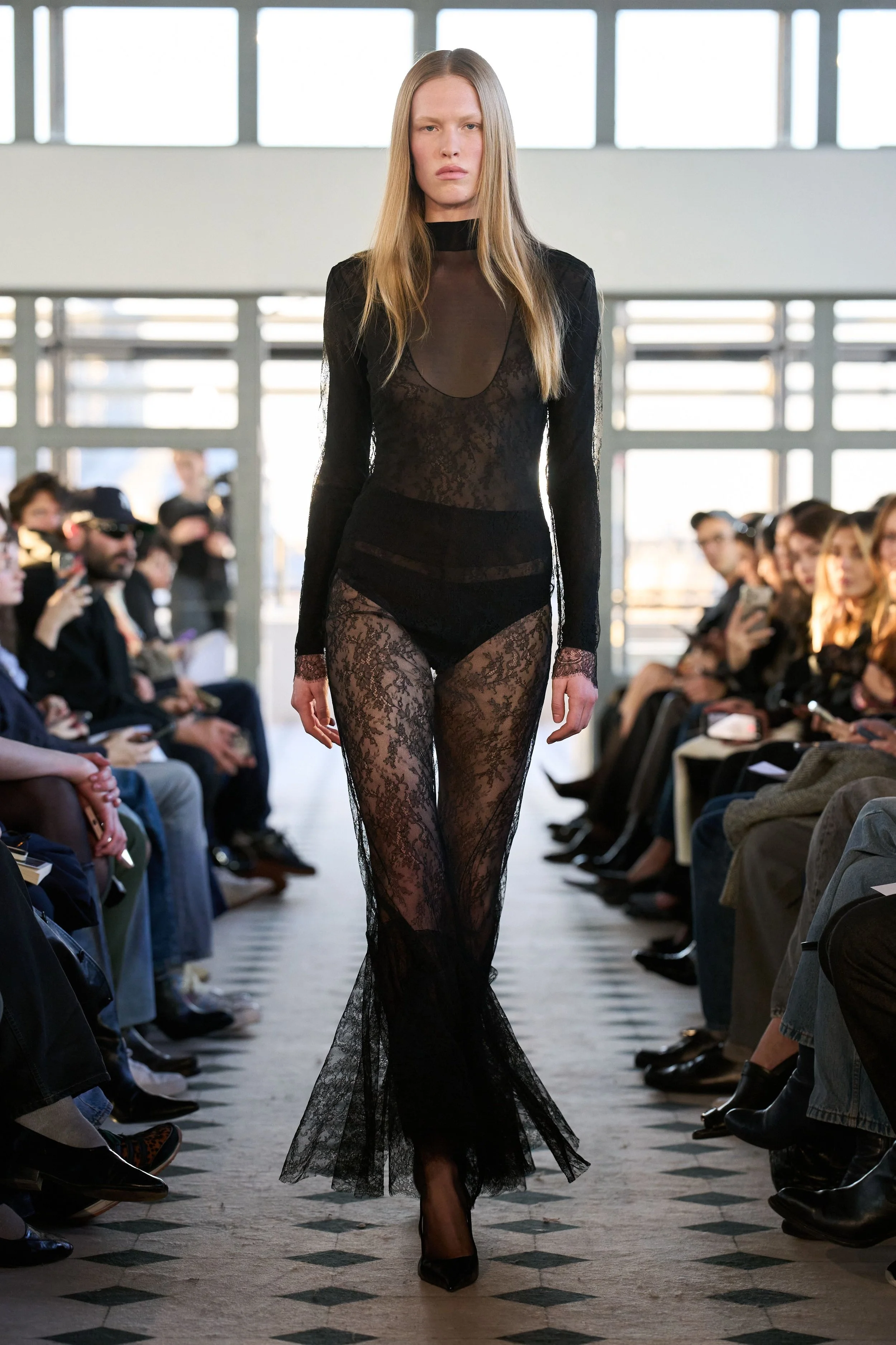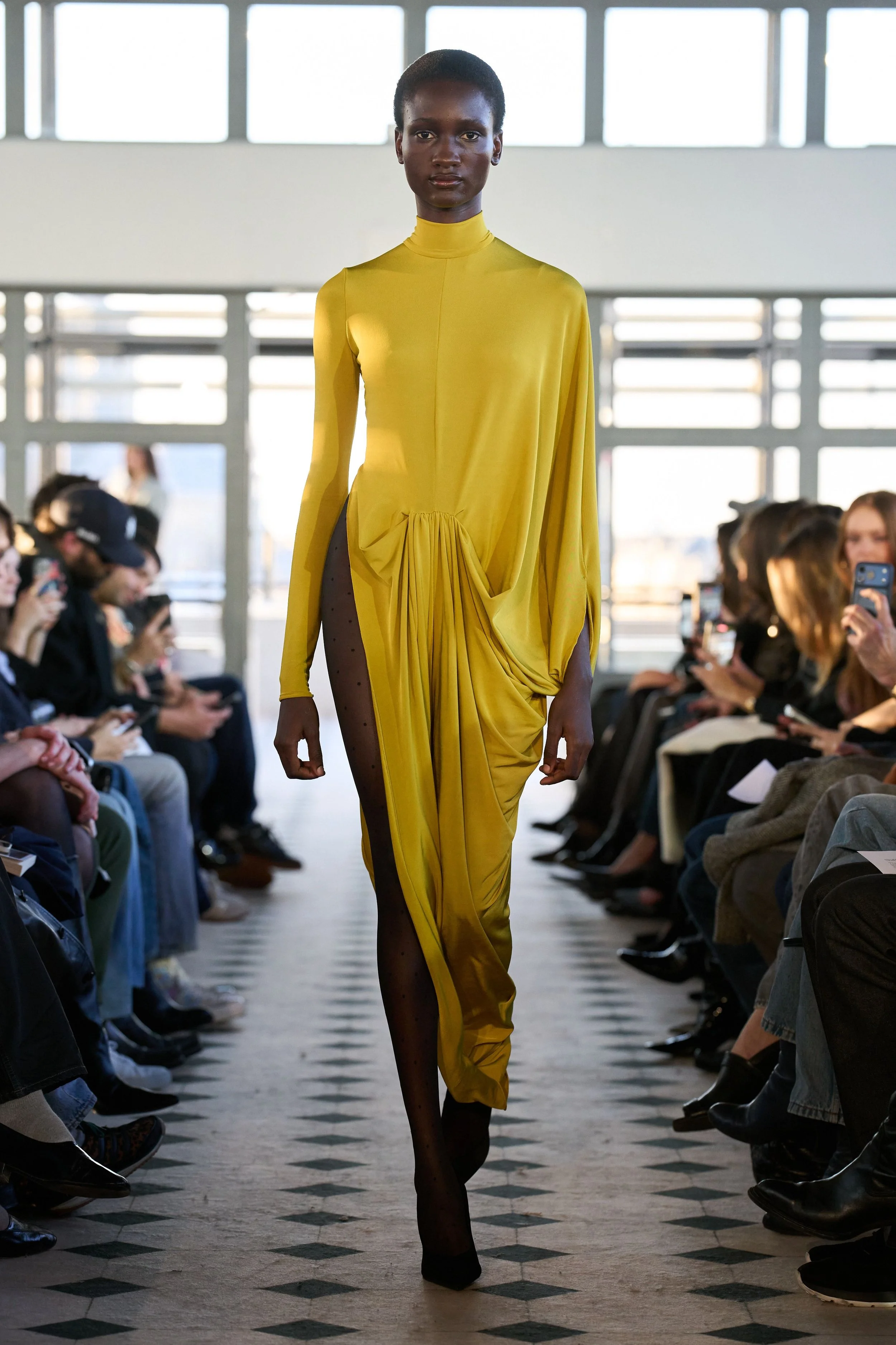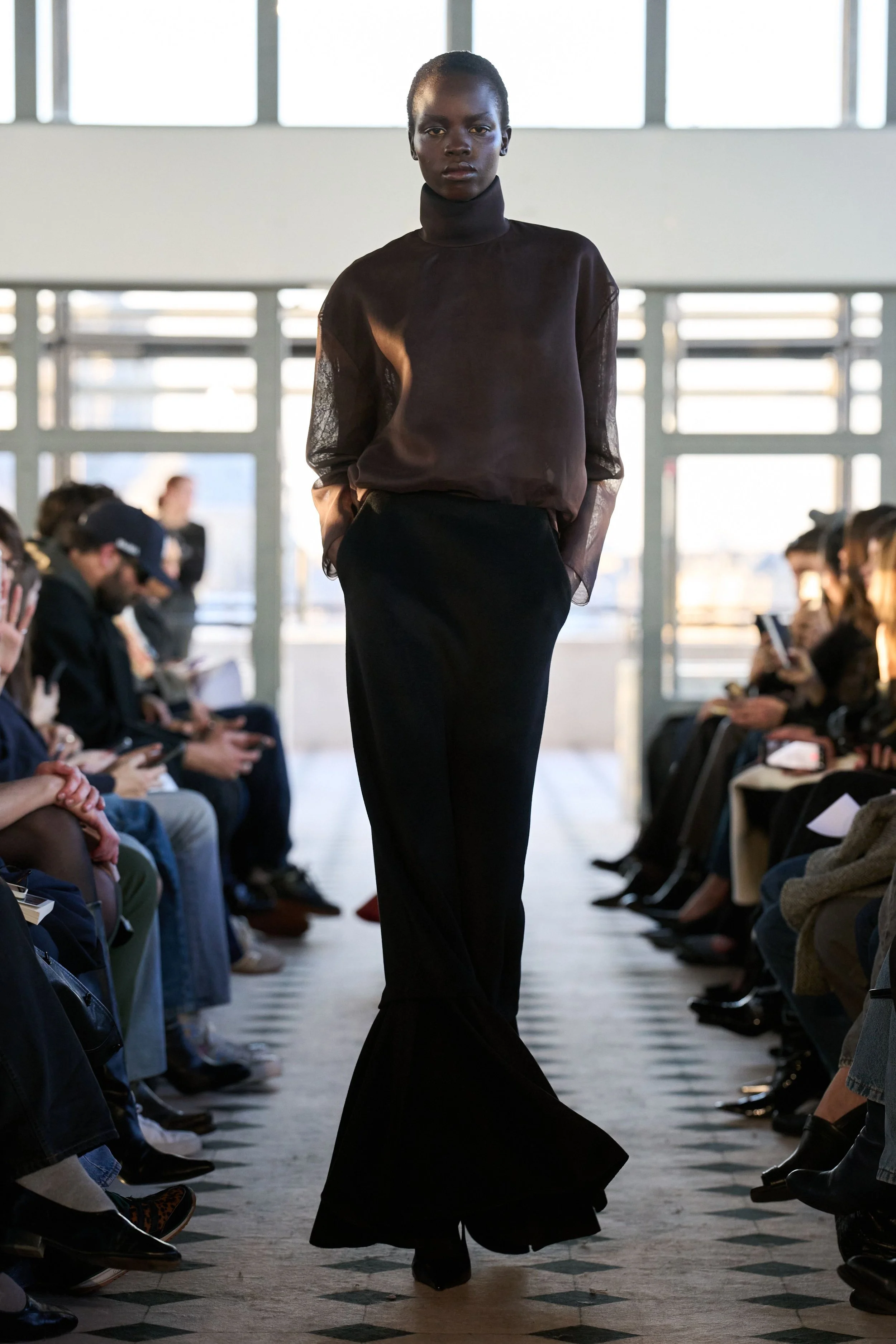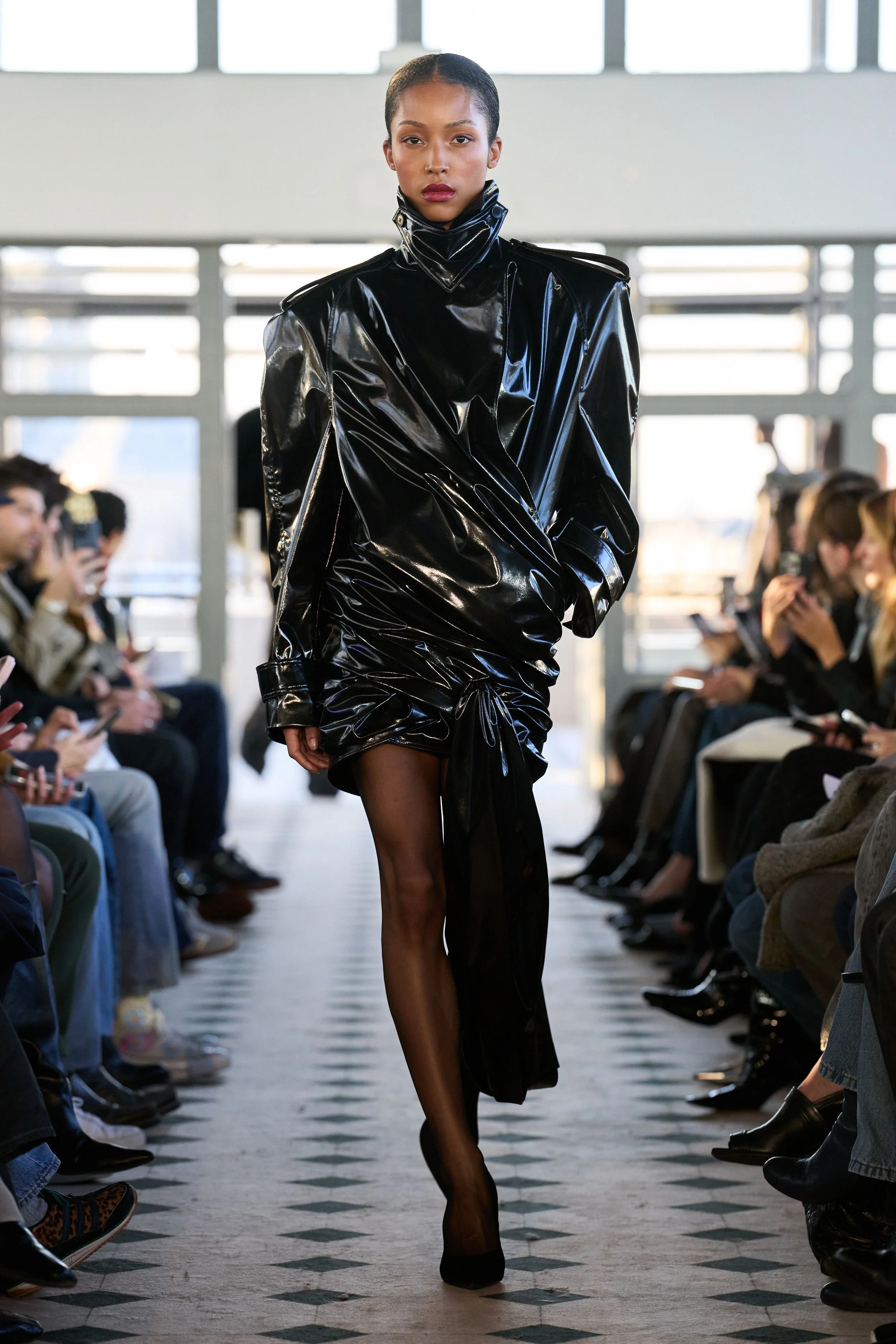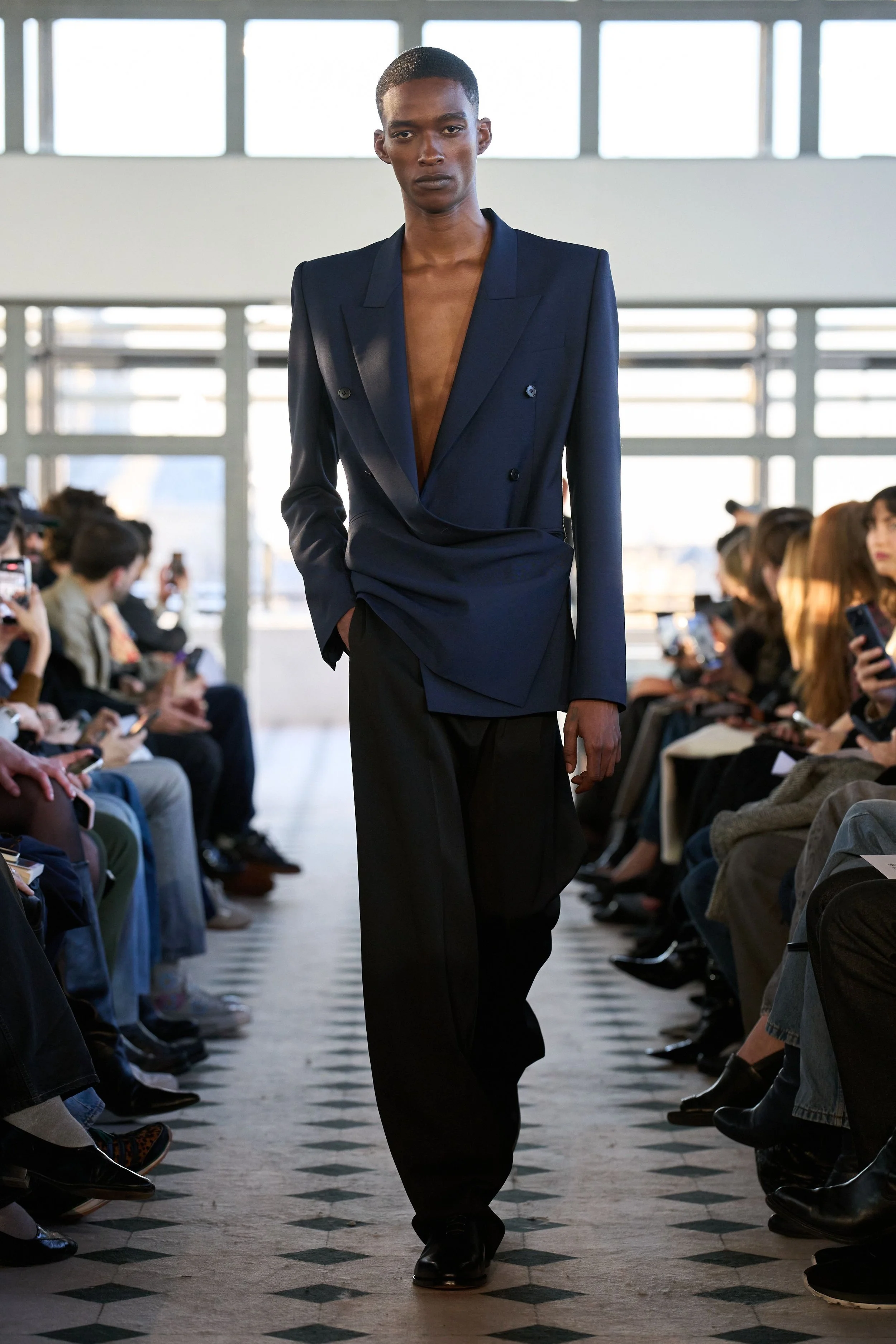 But don’t mistake this romantic sensibility for softness. The offering is a character study in accumulation: of lovers, memories, references, and power. A double-breasted cape in sturdy navy wool demands authority with its wide shoulders and high collar. Later on, its shorter jacket iteration in cream is twisted in the front, showcasing high-waisted jodhpurs paired with ultra-spiky, ultra-high heels. A dress-coat hybrid in black silk creates an equally effective and comfortable uniform for the long night ahead. Each piece feels lived in before it’s worn, as if the fabric already remembers something juicy, scandalous. The eroticism here isn’t obvious – it’s structural, in the tension between restraint and collapse, pocketed hands and barely-held shapes. Cocktail dresses in jersey feature dramatic side openings, showcasing legs clad in sheer tights with black dots – a classic Parisian staple that always creates a moment.