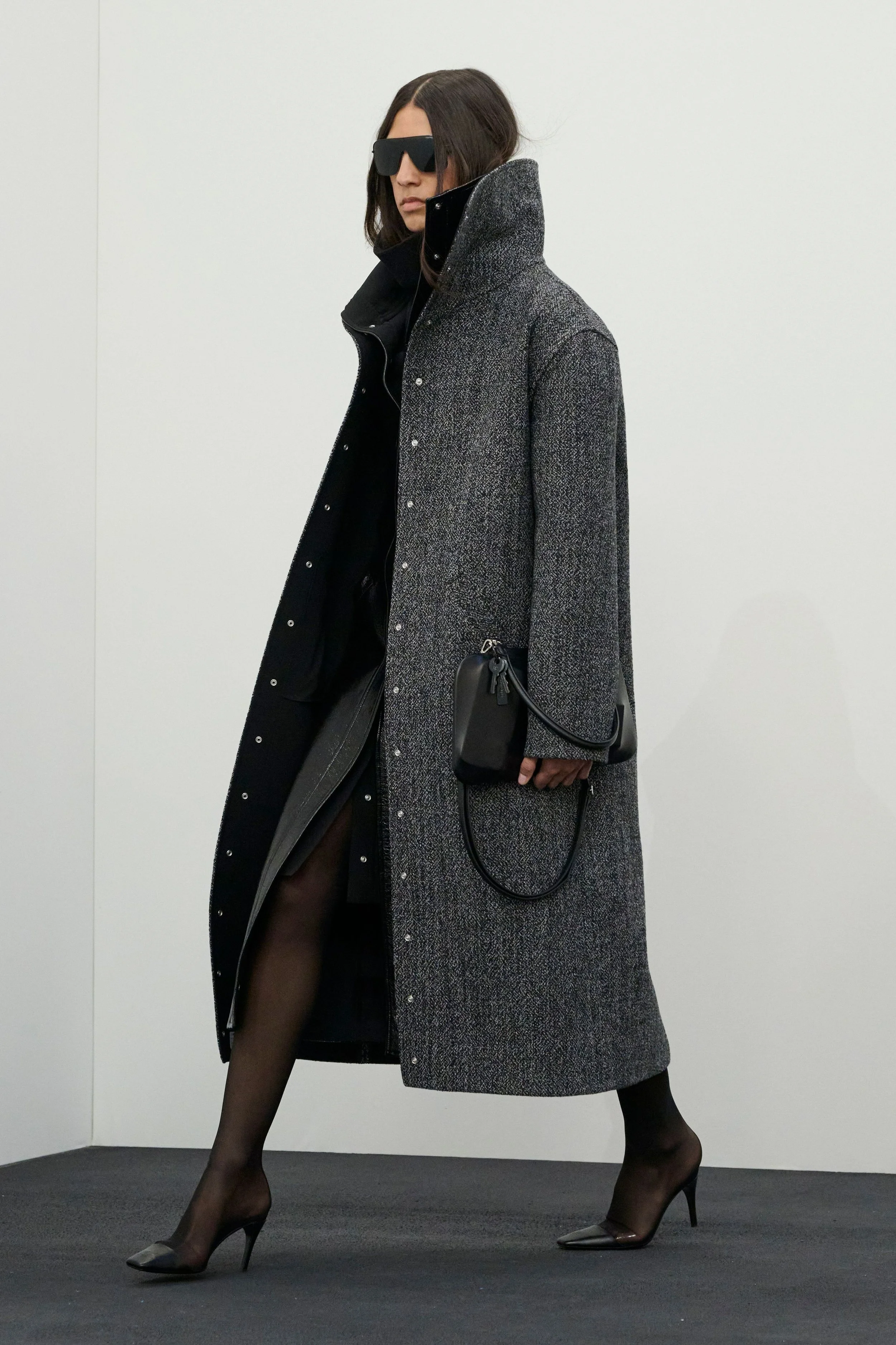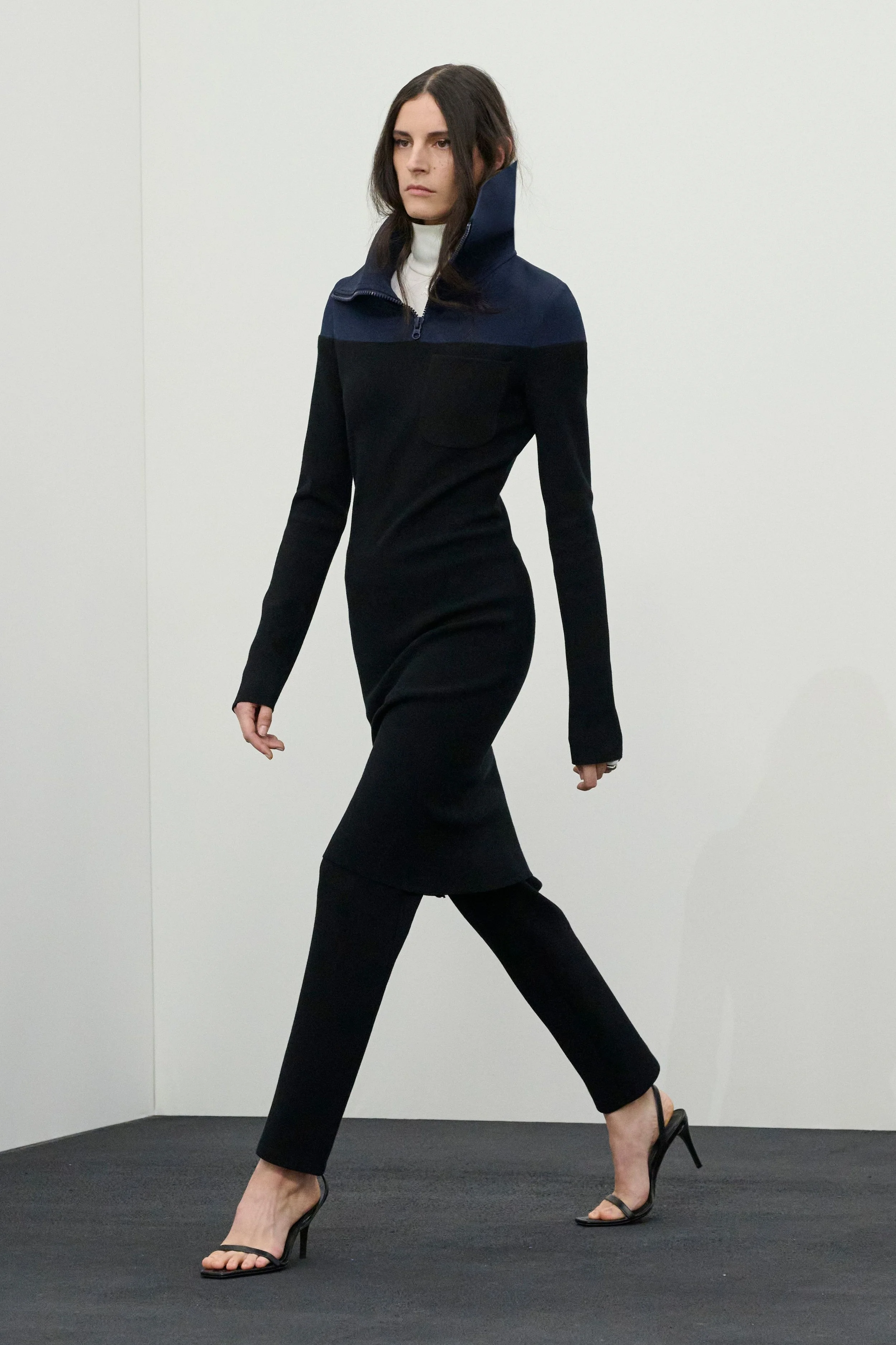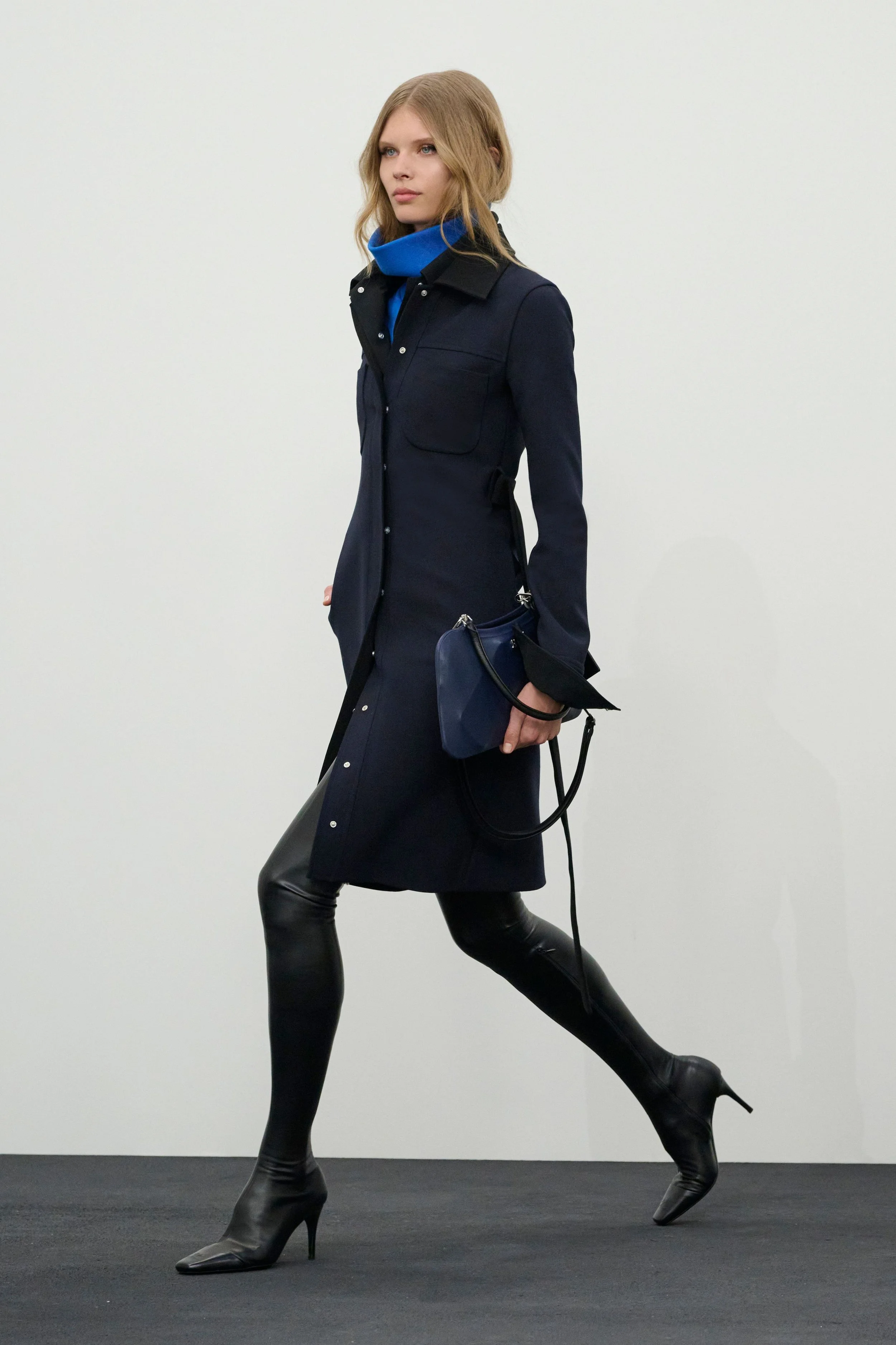 The wardrobe mirrored this sense of constant motion. Technical quarter-zip tops accented with leather, robust wool coats with dramatically popped XL collars, and navy shirt dresses layered over cobalt blue turtlenecks evoked the practicality of daytime dressing. Sets in speckled denim further reinforced the utilitarian mood. Accessories followed suit: bags appeared larger and decidedly more day-appropriate, featuring a clever design detail — the visible outline of the everyday essentials tucked inside.