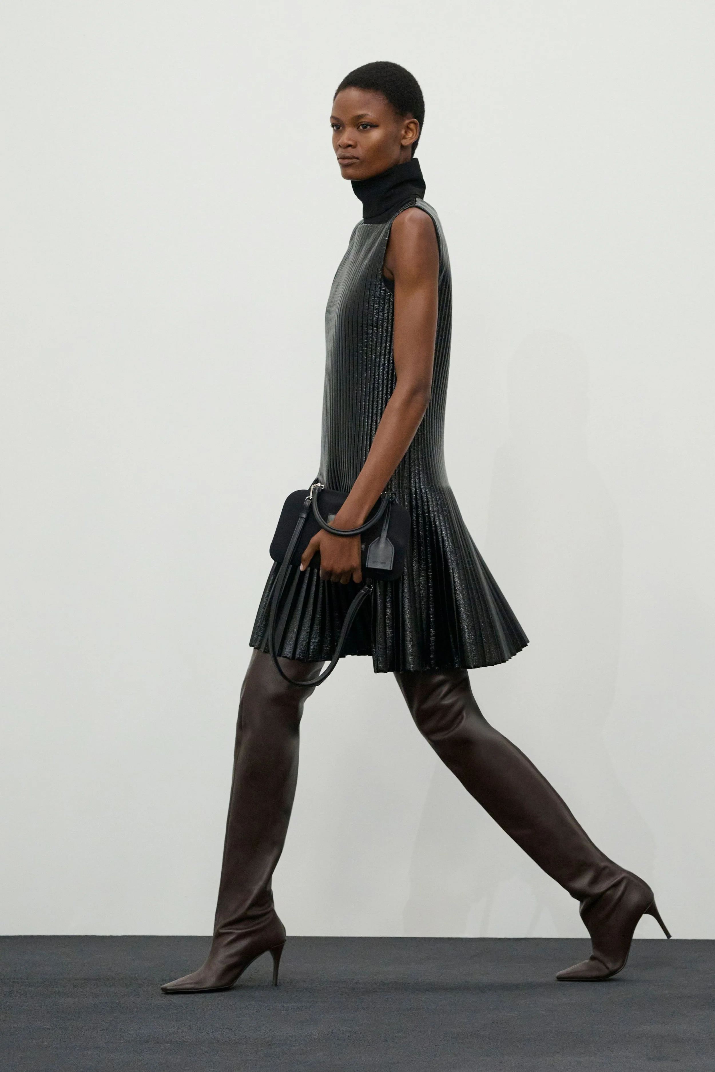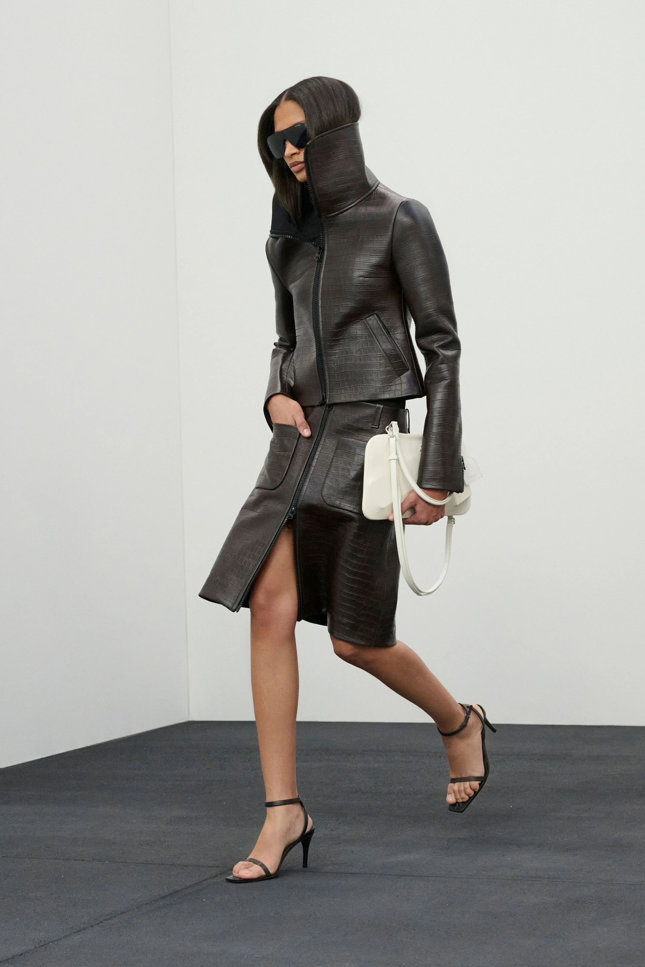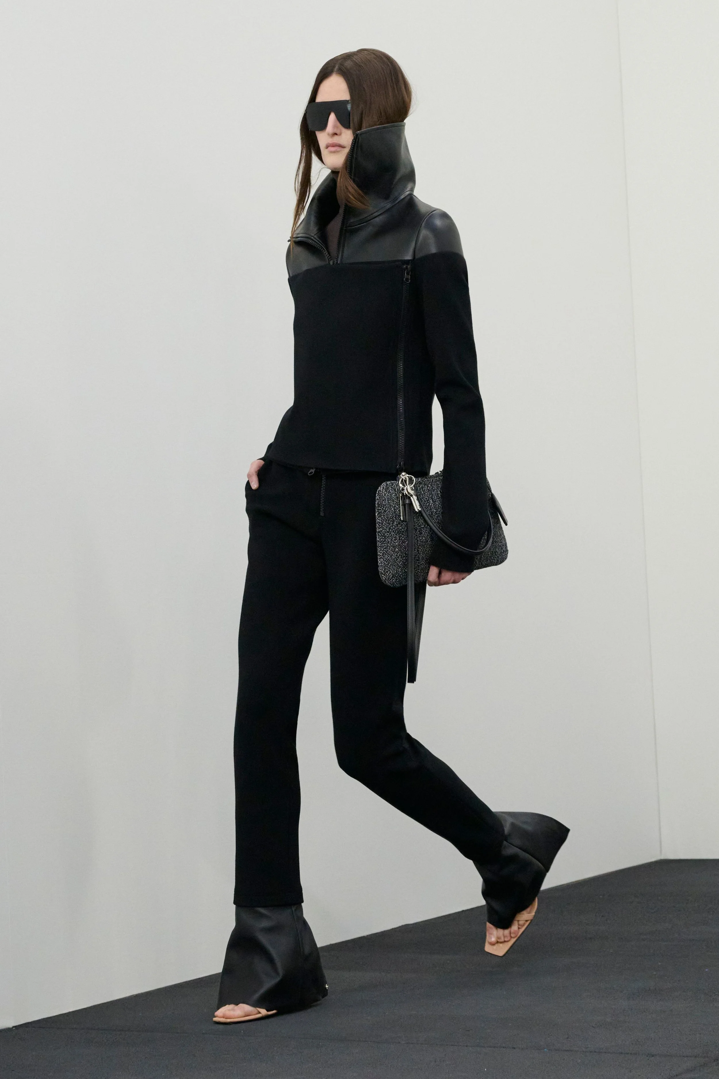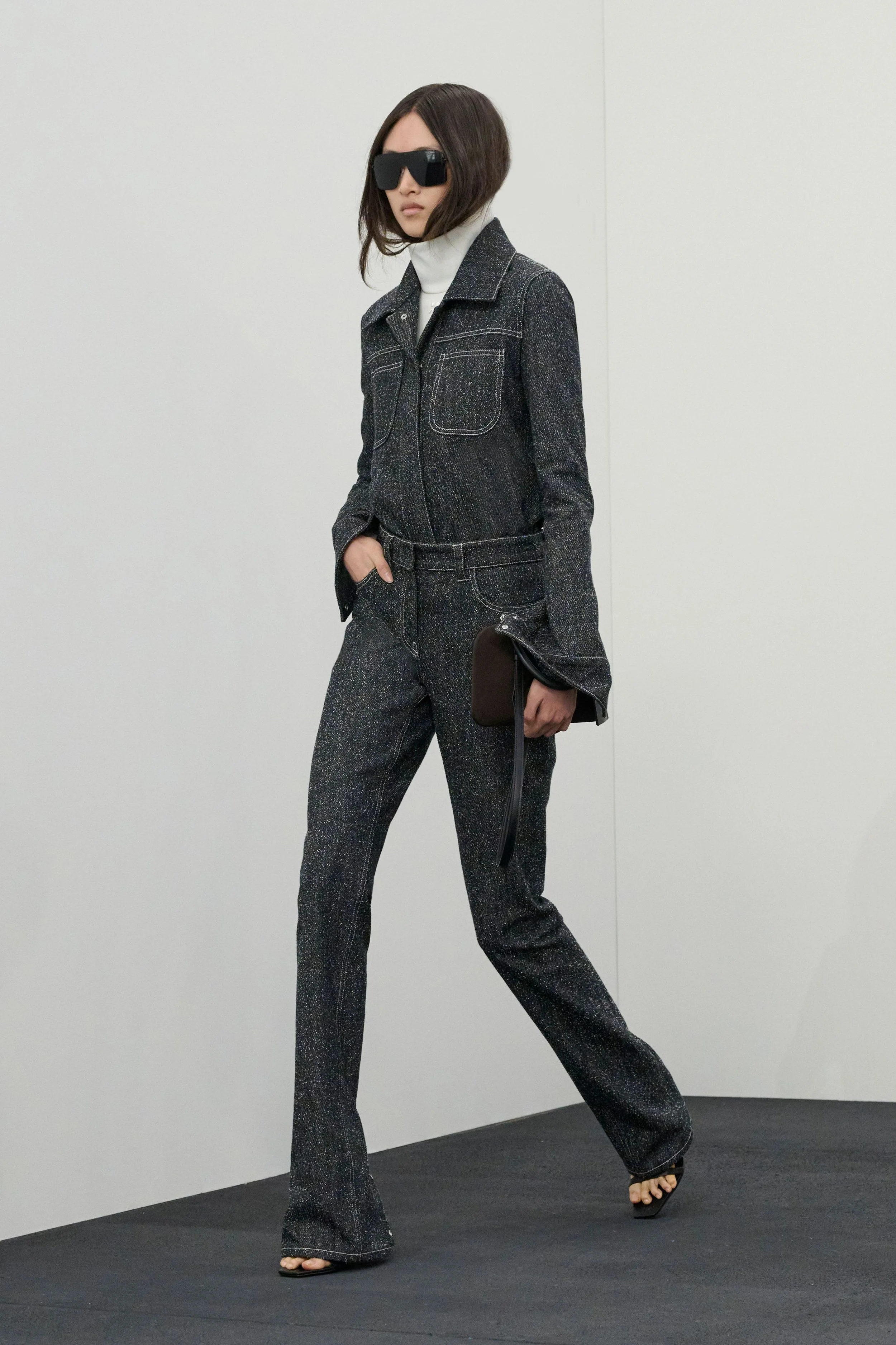 The wardrobe mirrored this sense of constant motion. Technical quarter-zip tops accented with leather, robust wool coats with dramatically popped XL collars, and navy shirt dresses layered over cobalt blue turtlenecks evoked the practicality of daytime dressing. Sets in speckled denim further reinforced the utilitarian mood. Accessories followed suit: bags appeared larger and decidedly more day-appropriate, featuring a clever design detail — the visible outline of the everyday essentials tucked inside.