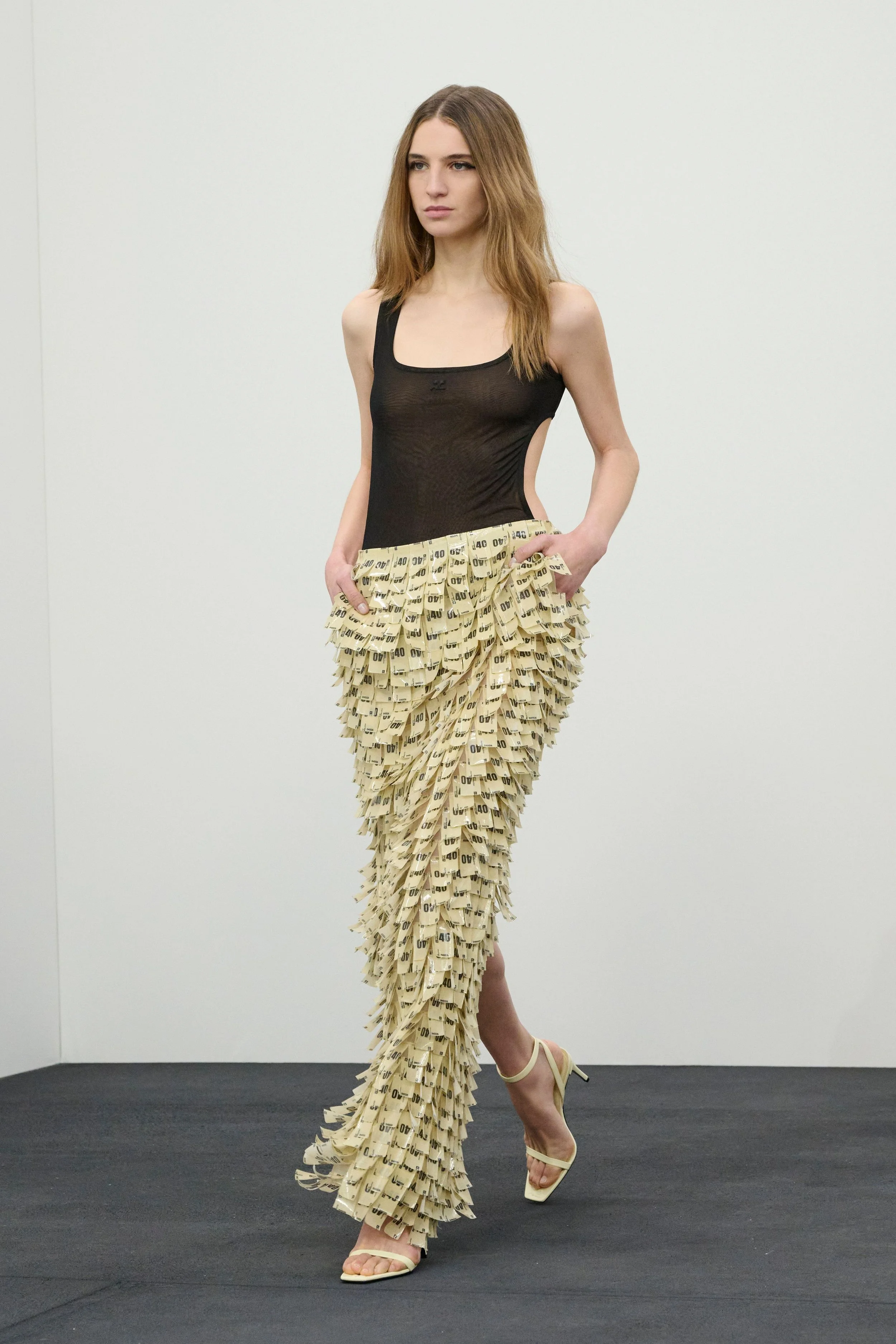 As evening fell, Di Felice returned to the codes that have defined his tenure at Courrèges, but with a renewed twist. On Alex Consani, a sleeveless “turtleneck” top was rendered in the designer’s barely-there translucent fabric, lending a sharp, provocative edge. Sculptural dresses shimmered under the lights, many punctuated by daring slits that hinted at the brand’s signature sensuality.