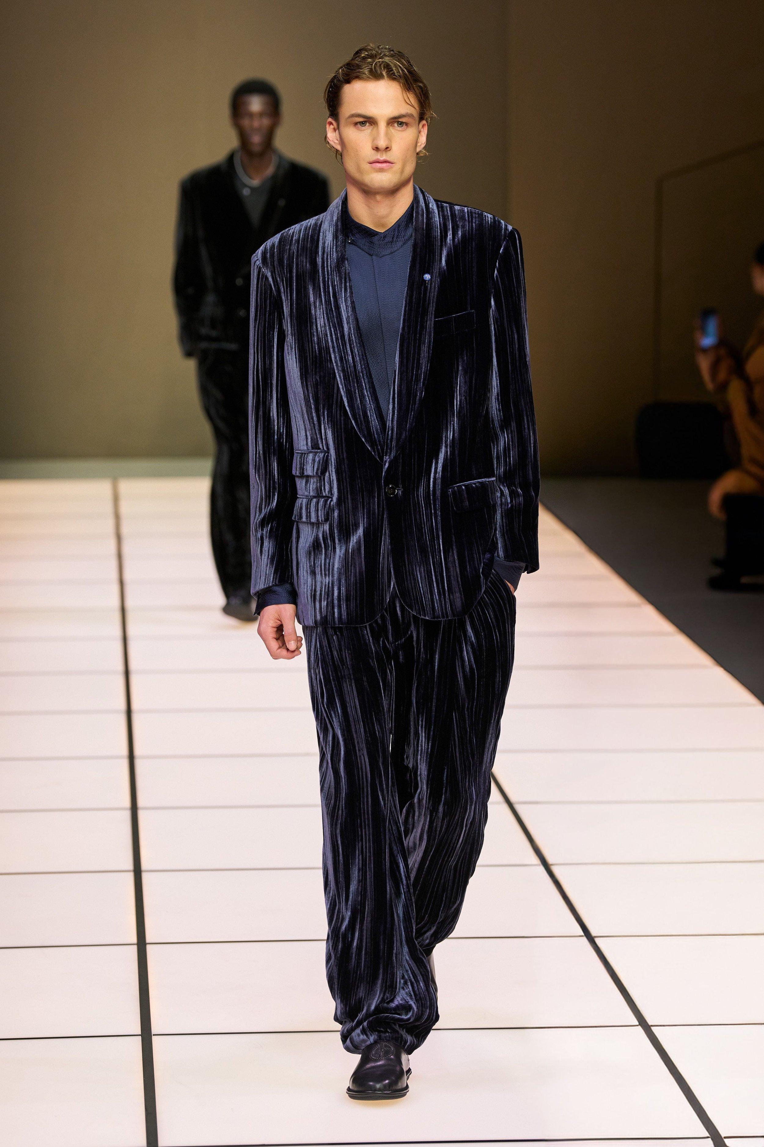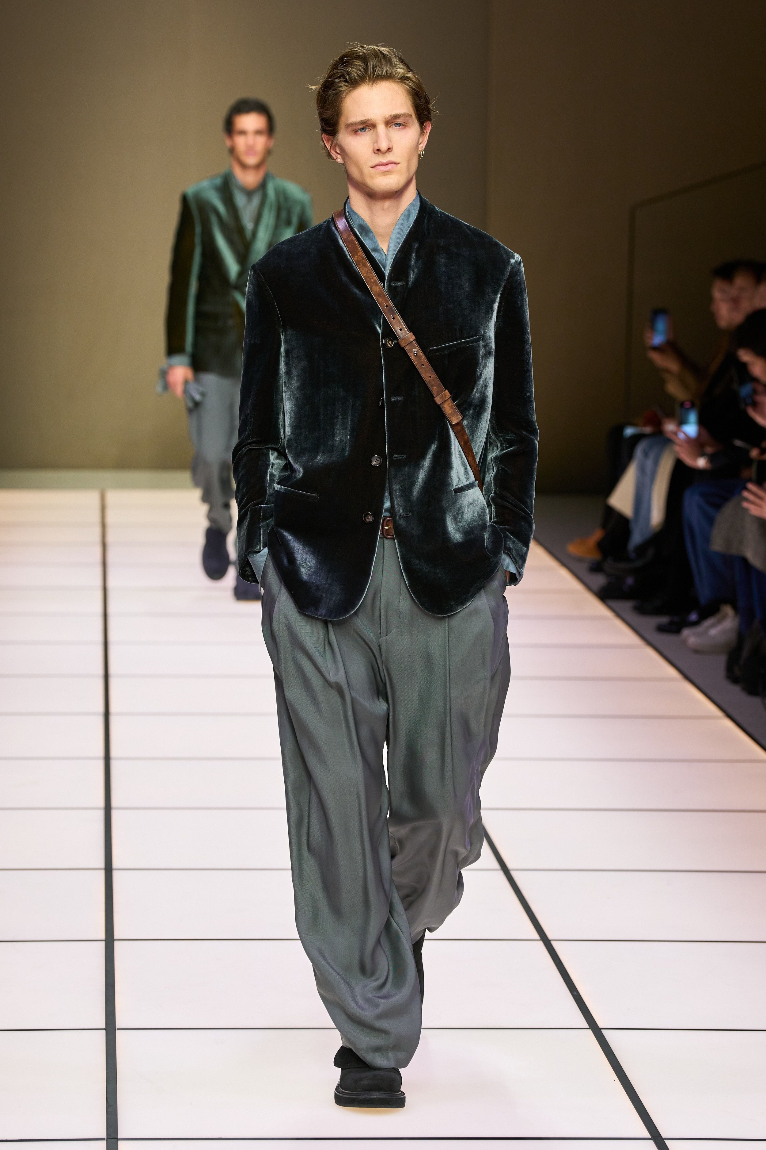Velvet was a big part of the show, breaking the monotony of the looks and giving a luxurious feel. In forest green, navy, graphite, and black, the pieces reflected the light of the runway, creating a sumptuous and lavish mirage. Colours were not contrasting each other; they accompanied each other in a harmonious way, showcasing Armani’s ability to make simplicity and elegance their biggest asset.