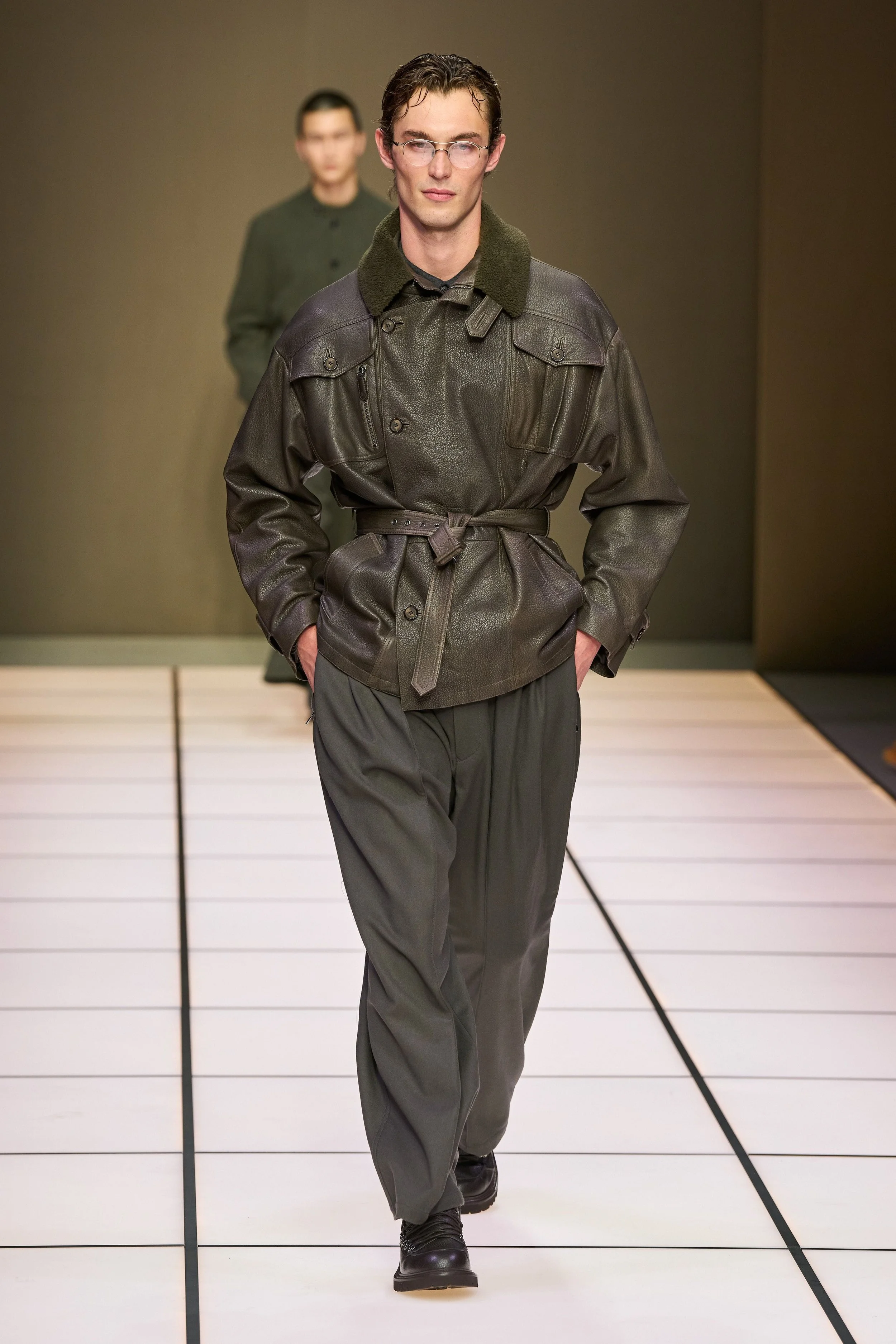 Hands in the pockets, preppy glasses, and loose, structured silhouettes were the centre of the Giorgio Armani Fall/Winter 2026 menswear show. For this season, suits were less tailored than in past collections, giving way to a wardrobe reminiscent of the corporate chic of the ’80s and early ’90s; wide shoulders, loose garments, and distinctly manly silhouettes.