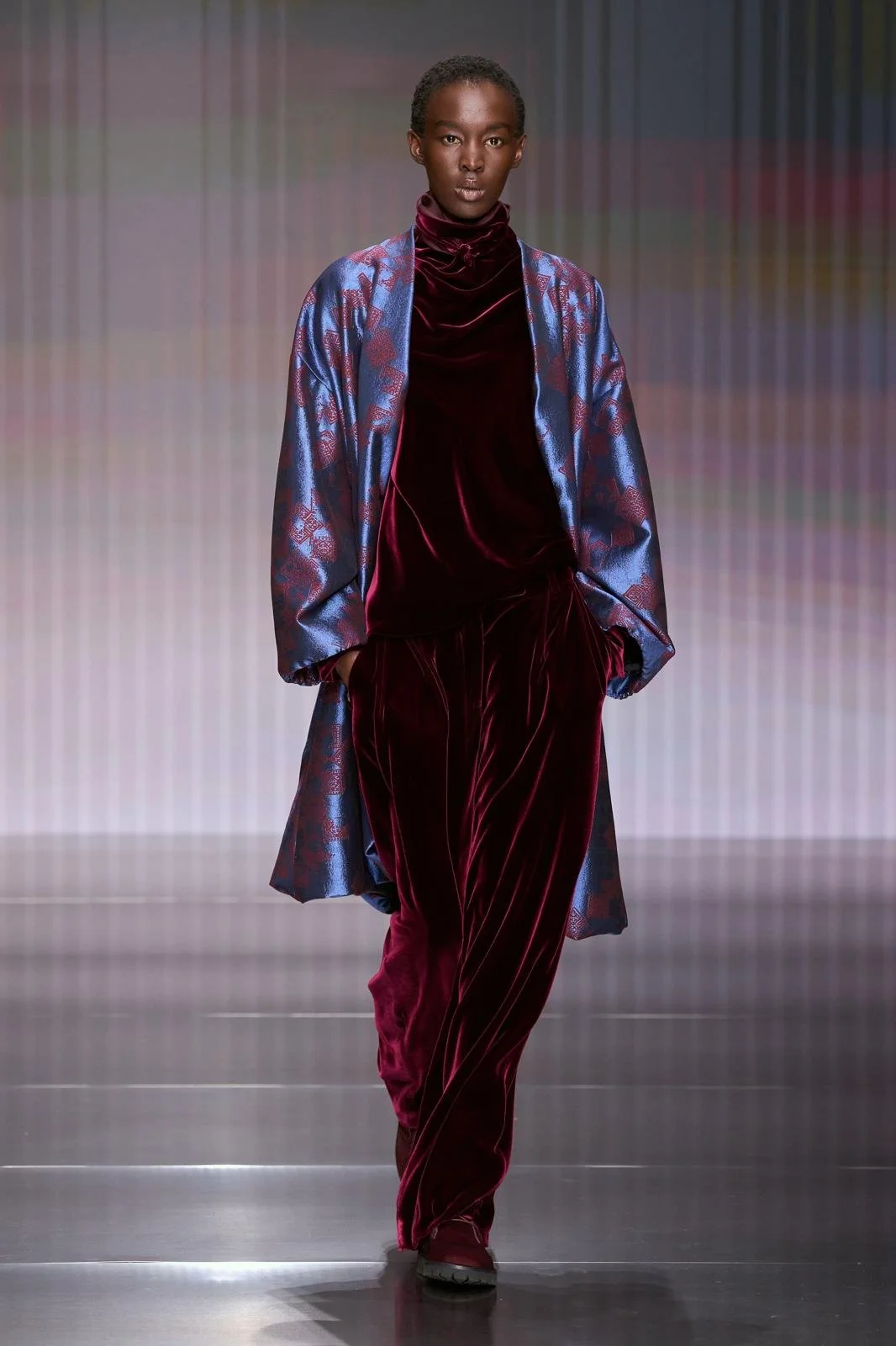 Additional renditions of the same looks, yet in different colours, appeared throughout the show, always presented by a duo of models walking side by side. Mr Armani's signature deep blue shade – the so-called azure tone – materialised in velvet sets, embroidered jumpsuits, kimonos worn over printed trousers, and draped dresses and tops, a reference to the label’s archives and his vigorous use of Eastern Asian motifs.