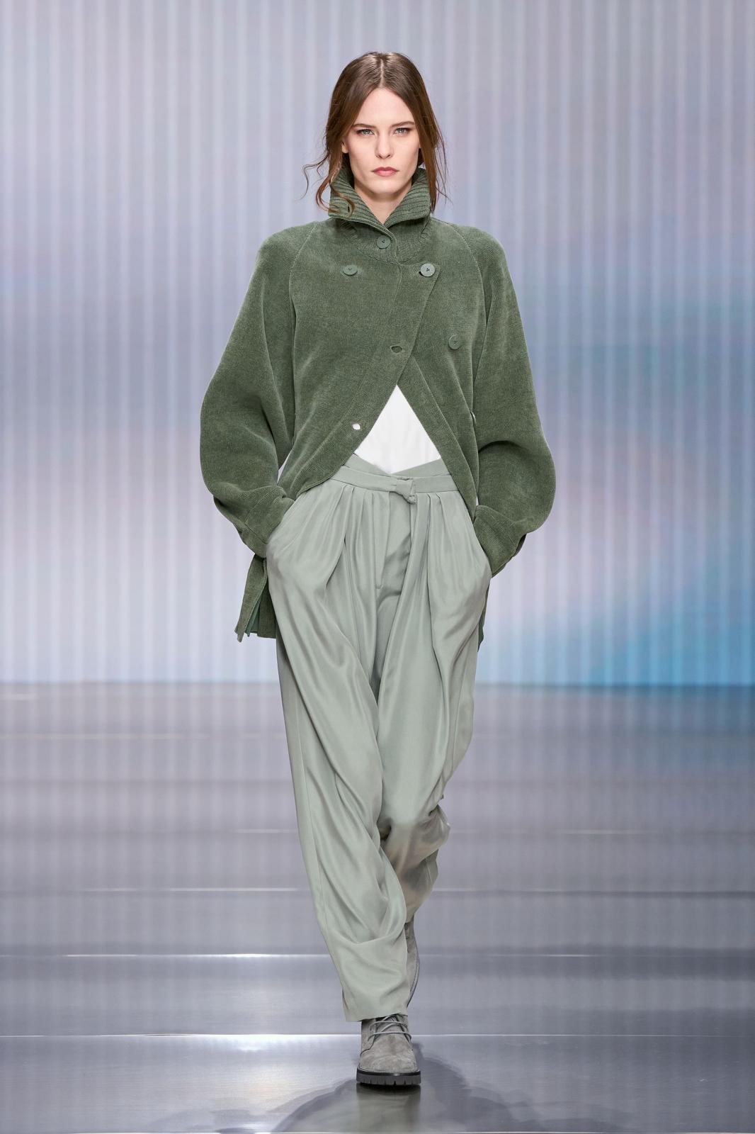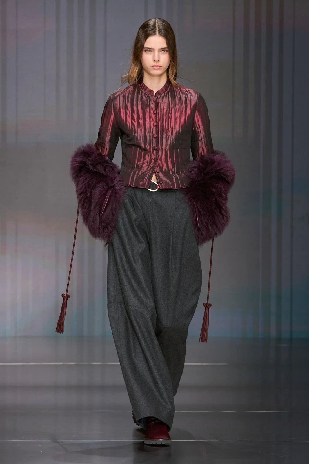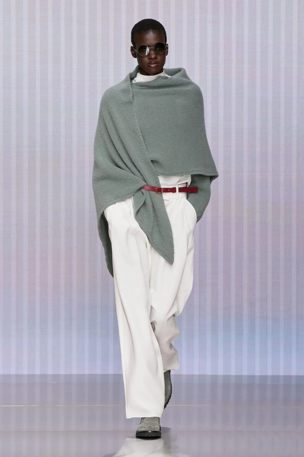 Inspired by the hues of dawn, the colour palette was delicate. Jade and blush tones, previously seen on couture, made a comeback for ready-to-wear, complemented by burgundy, gradient purples and greys. Silvana Armani’s appointment marks a new chapter at the house, the company's first with a female designer as the creative lead, and desired by those who crave clothes to live in.