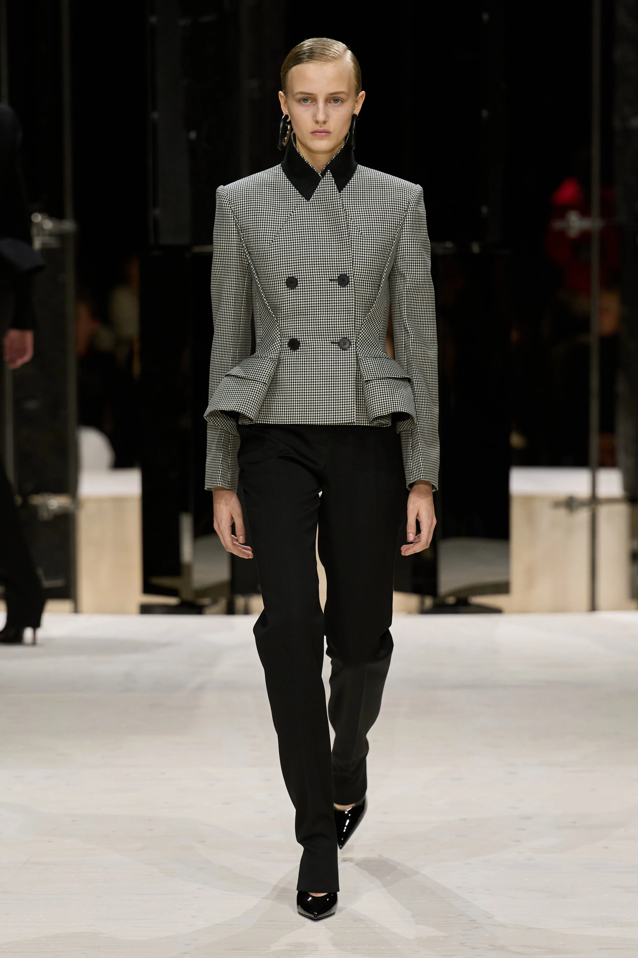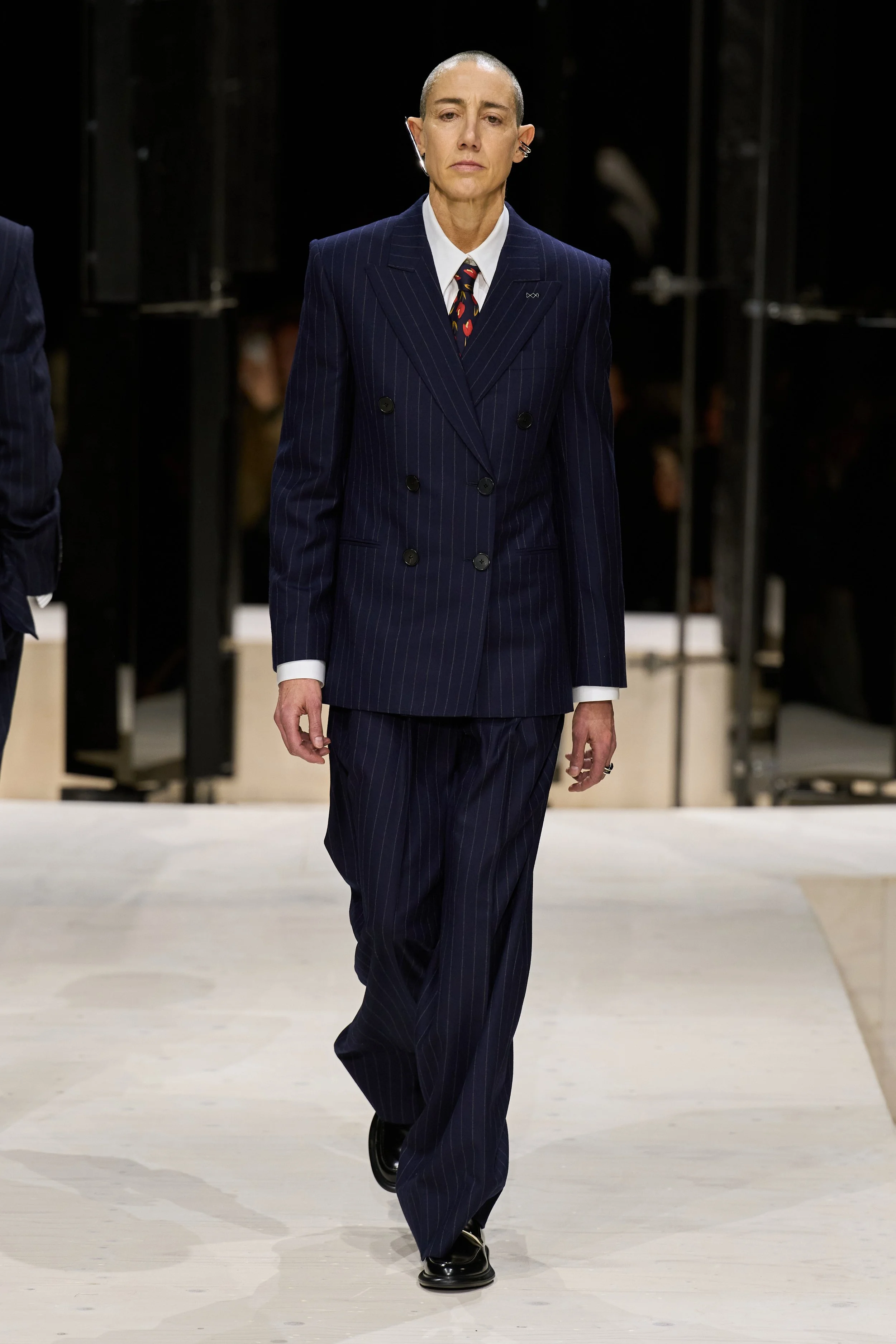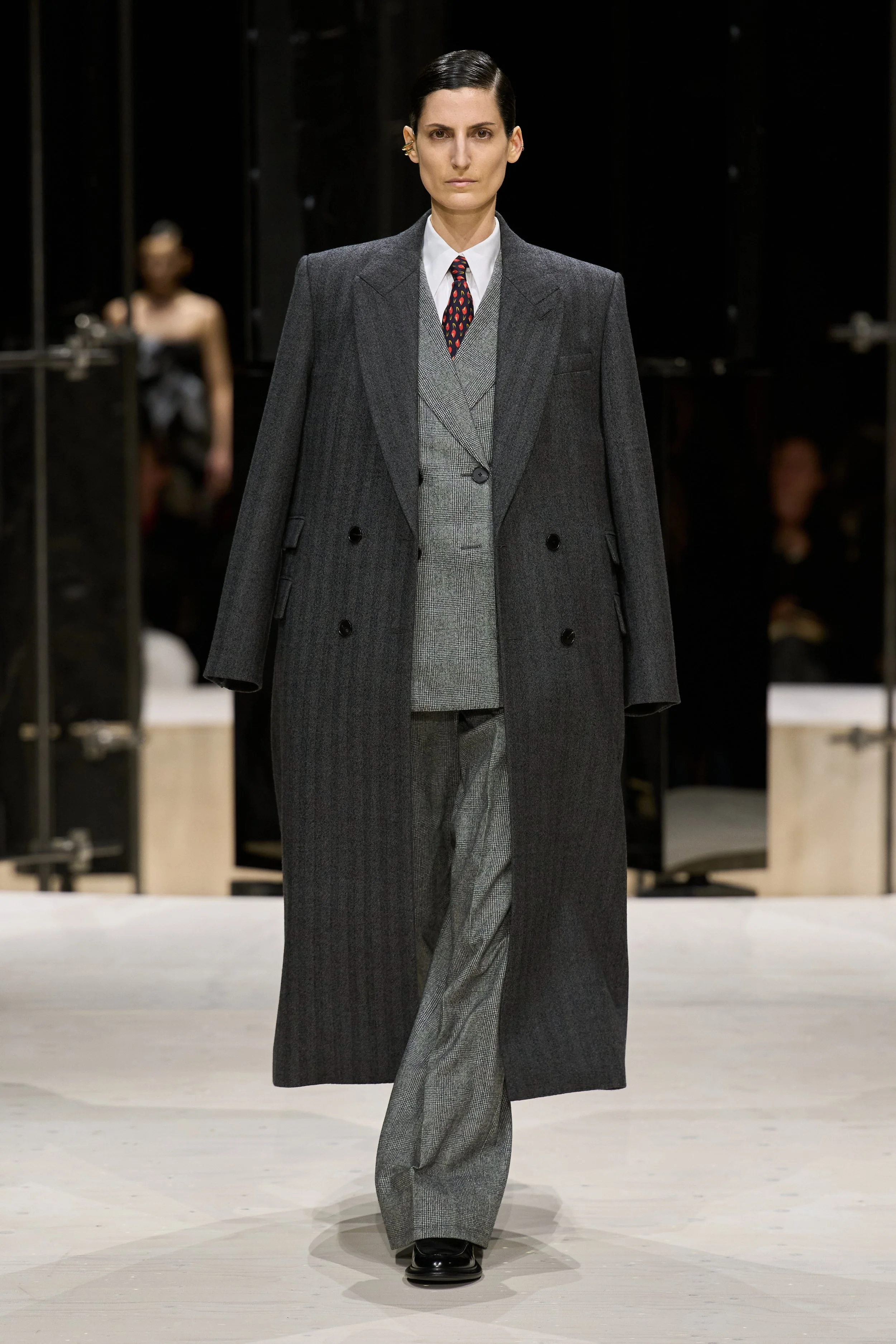 The thirteen years Burton spent as creative director at Alexander McQueen are proof of two things: a) she’s an expert at slowly, respectfully building out a legacy, and b) she’s a master tailor. Here, she flexed her range. Sculptural pieces jolted peplums crisply, tightening around the neck in impeccable collars. Pinstriped suits swayed closer to a classic masculine feel—here they found their muse in writer Constance Debré, in a buzzcut and a sharp ear cuff.