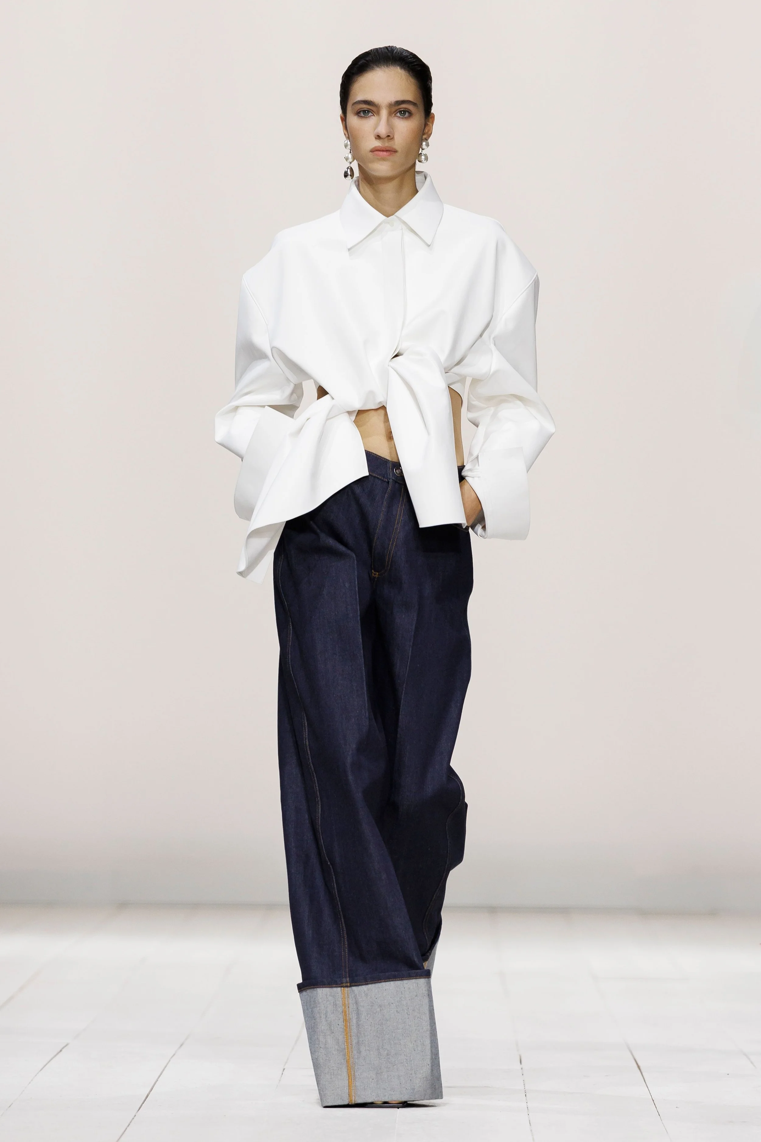 At the centre of the collection was the bodice, reimagined as a versatile anchor. Bodysuits with plunging V-necklines and voluminous sleeves appeared styled with squared-toe ballet flats, or layered beneath a cropped leather bomber whose collar featured a striking double-zip detail. Lingerie codes translated seamlessly into eveningwear: bra tops slipped under tailored jackets or paired with silk and leather skirts, draped with a deliberate fragility, as if they might tumble away at any moment.