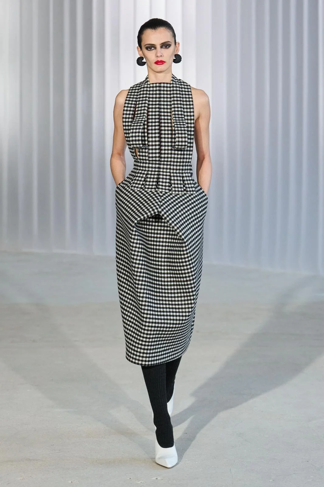 Honouring the essence of Jean Paul Gaultier as a house that thrives in complementary opposites, Lantik developed more characters to play a fundamental role during his offering – all born from the cinematic juxtaposition of past and future, masculine and feminine. Western motifs, sportswear, lingerie and boudoir elements were combined, with a greater focus on sharper and more experimentally tailored pieces, mostly in black and white.
