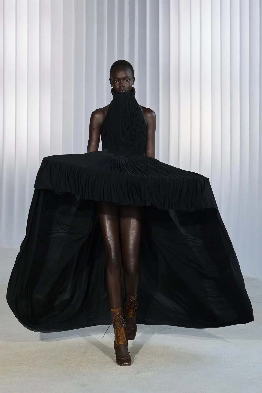 Challenging body proportions, round-shaped details resembling car tyres cinched waists, hugged necks and were placed as bracelets, while eveningwear carried flowy, rounded, and bouncy jersey forms, created with pleating. Futuristic hoods with a helmet look and a waterproof feel were styled with classic neckties, while shirt collars were maximally stretched until covering the head. Later on, Dietrich’s image returned to the catwalk, more literally, with a photograph of the actor smoking printed on a long-sleeved, turtleneck, midi-length dress, and real smoke coming out of its back – steamy!