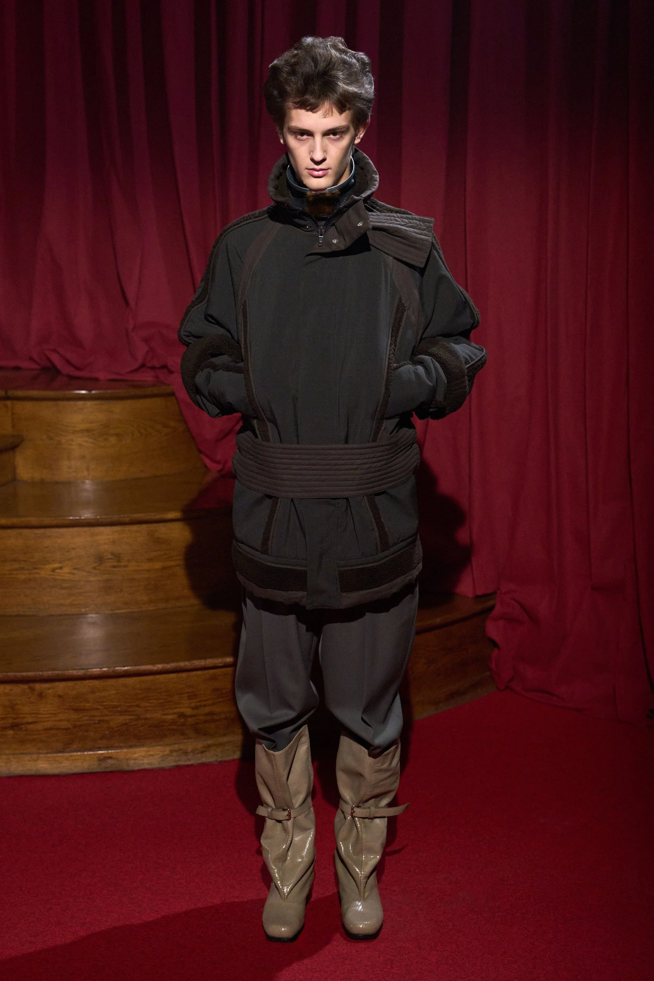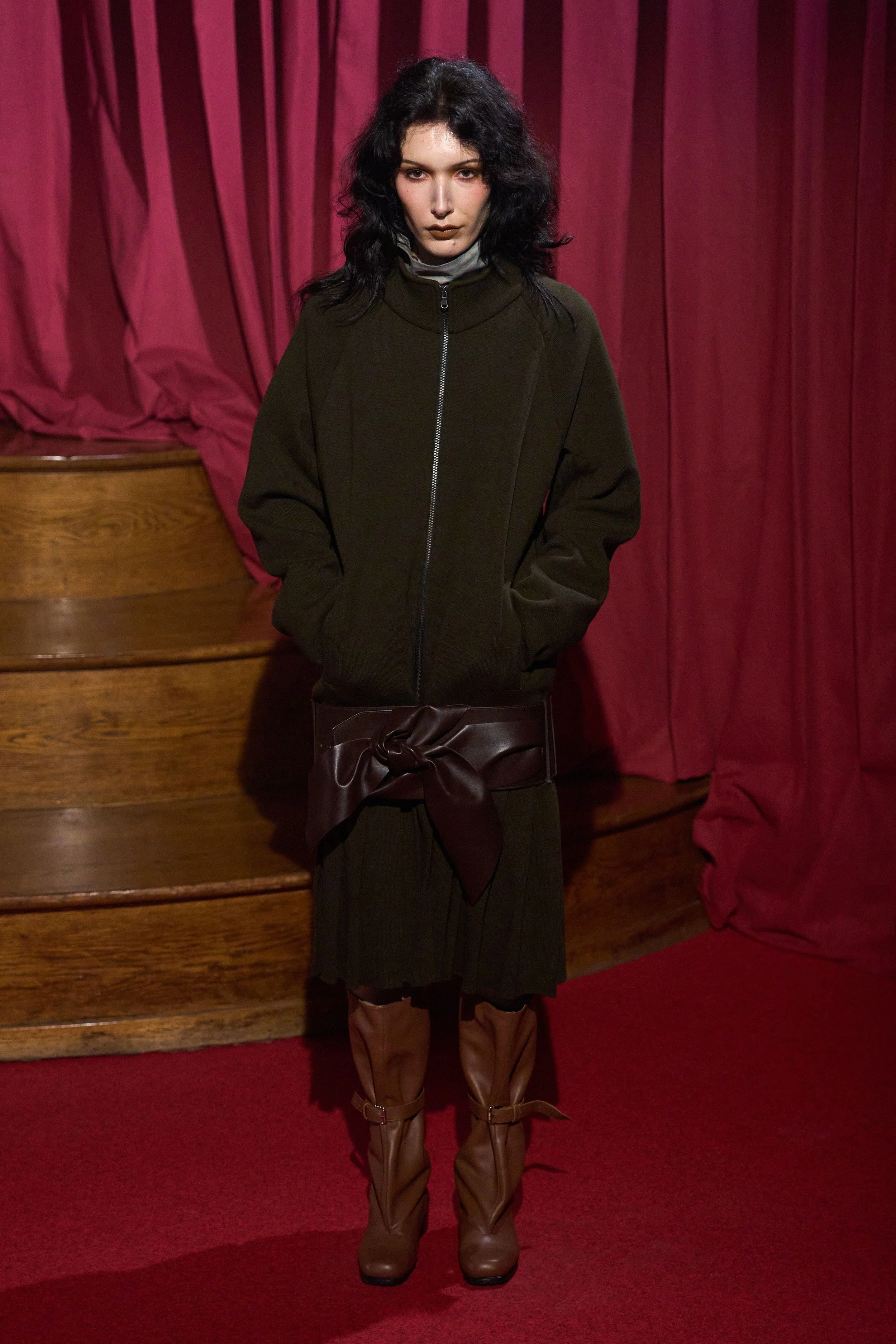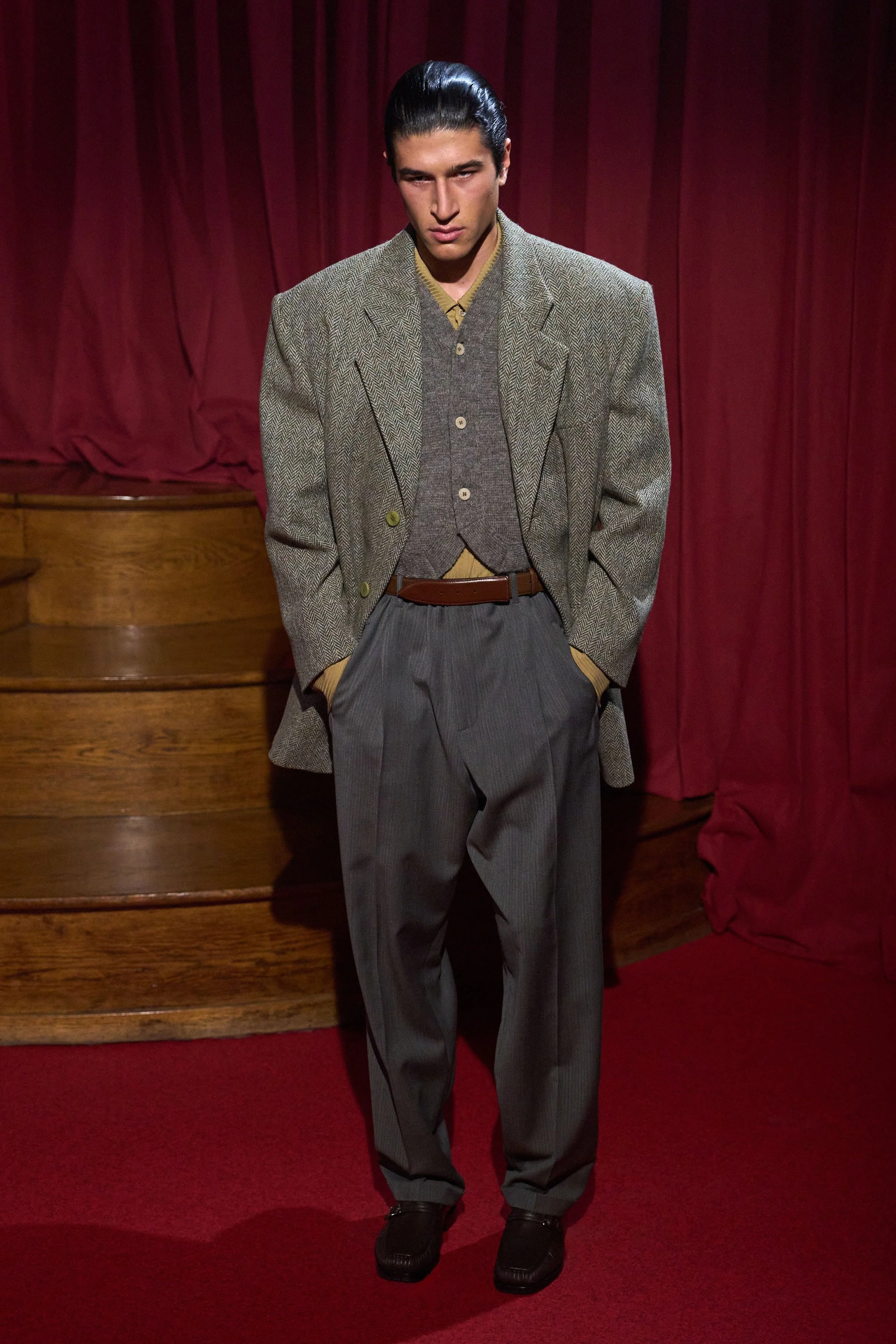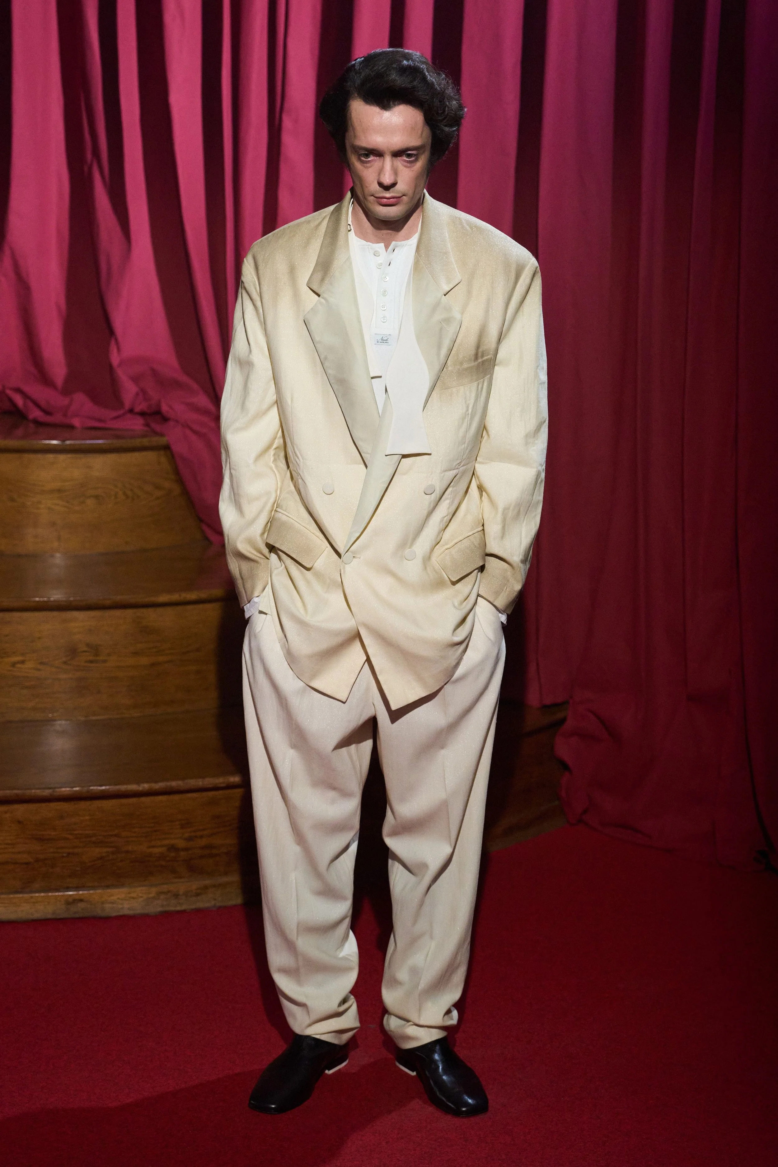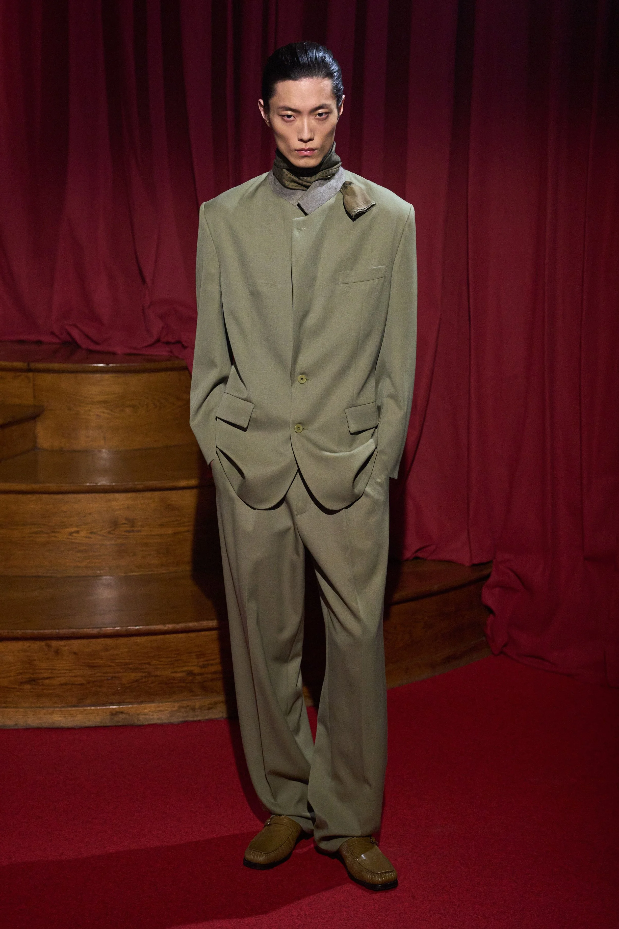 Elsewhere, refinement came deliberately undone: scarves emerged through slits in jacket collars, and the final look — a mismatched, oversized double-breasted suit — was punctuated by an untied bow tie, left hanging as a final gesture of dishevelled elegance.