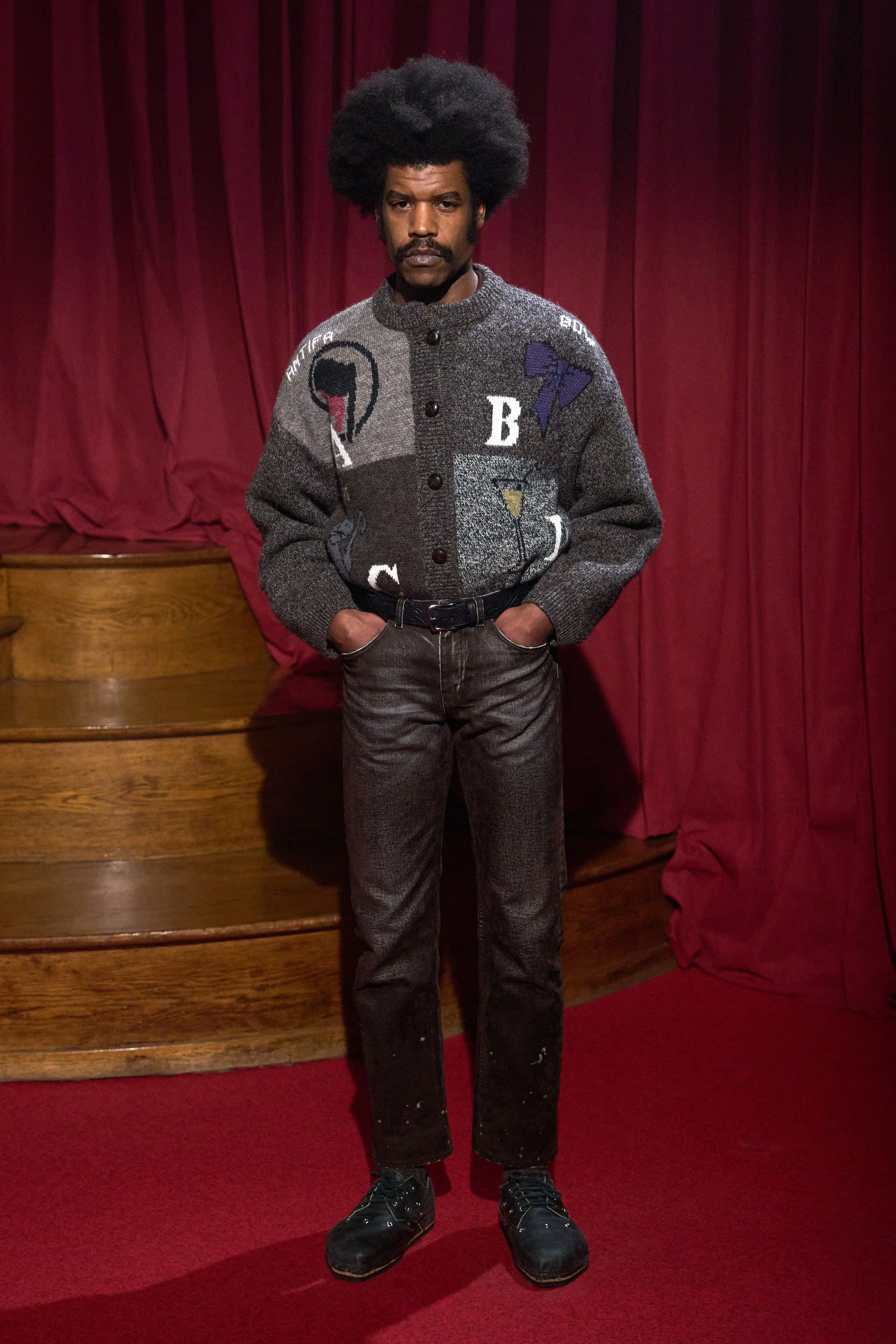 Magliano’s signature humour and social commentary surfaced throughout. A red silk shirt printed with tangled bunches of keys shared space with a chunky wool cardigan adorned with “ABCD” lettering — the “A” standing for Antifa, complete with the movement’s logo.