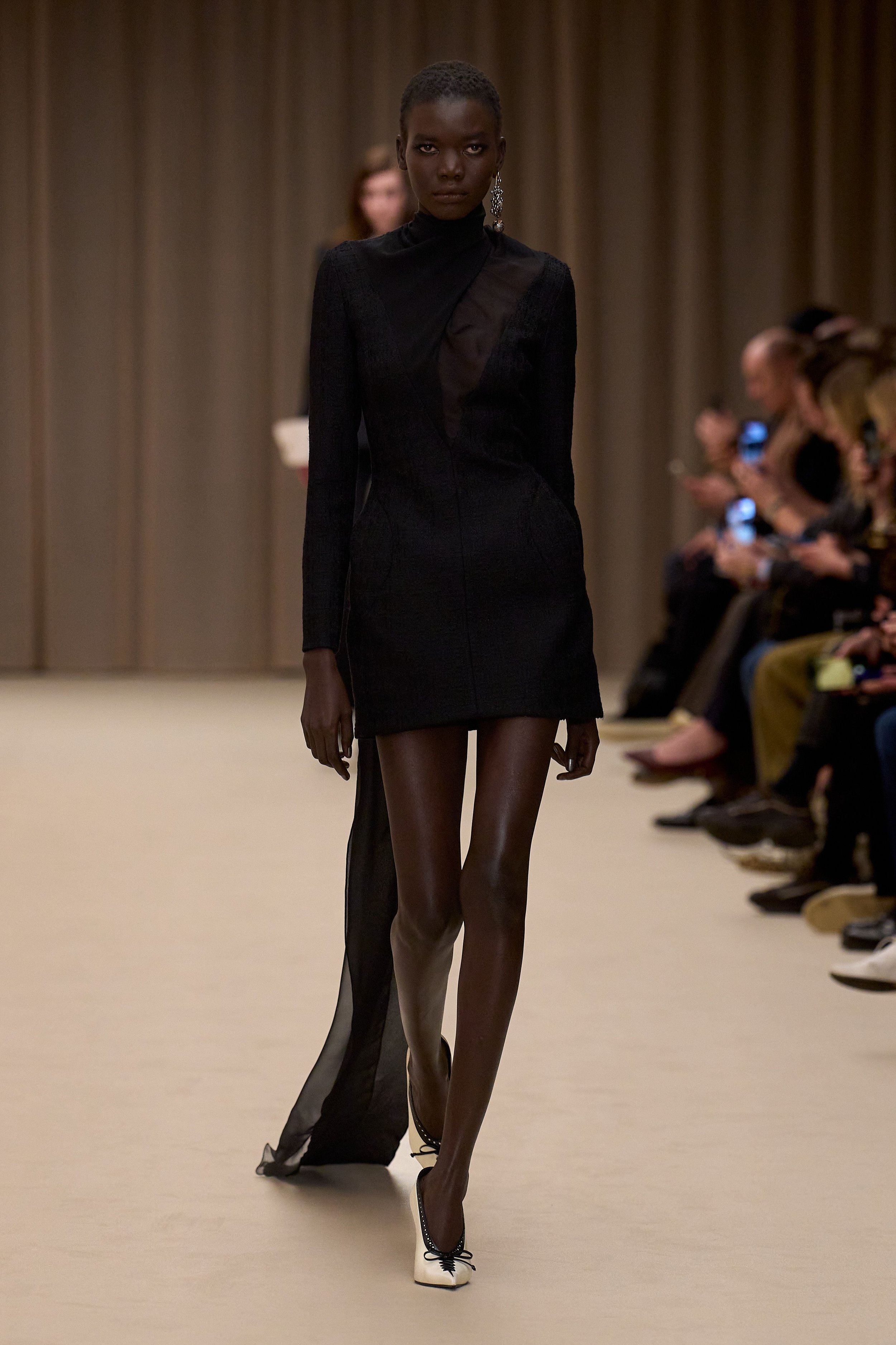 Femininity was expressed through high collars, bows, ruffles, and deconstructed tailoring. Pants sat low, and skirts were mini, while blazers remained sharply structured, creating a seamless bridge between past and present. Black military-inspired peplum dresses gave the collection a commanding presence.