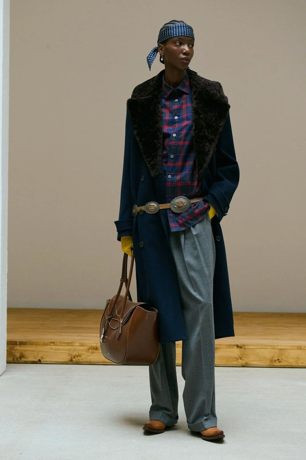 Accessories played a key role this season and were co-created with Native American artists who participated in the Ralph Lauren Artist in Residence (AiR) and Authentic Makers partnership programmes. Honouring craftsmanship and Indigenous heritage, artists and silversmiths Neil Zarama and Jimmy Begay were responsible for designing handmade belts and jewellery pieces, while wife-and-husband designer duo Jocy and Trae Little Sky, from Indigenous-led clothing brand TÓPA, worked along with Lauren to create a suede-fringed jacket.
