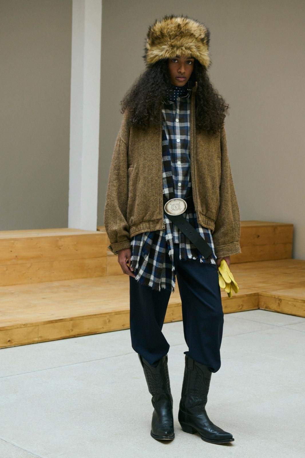 There was a clear influence of Western and Americana cultures, more specifically, the American Southwest. Hence, the myriad of cowboy hats and boots, fringed detailing, checkered shirts, and double denim. Juxtaposed and masterfully paired were baseball caps, long wool coats, leather and sporty bomber jackets, and contrasting gloves in bright yellow and green.