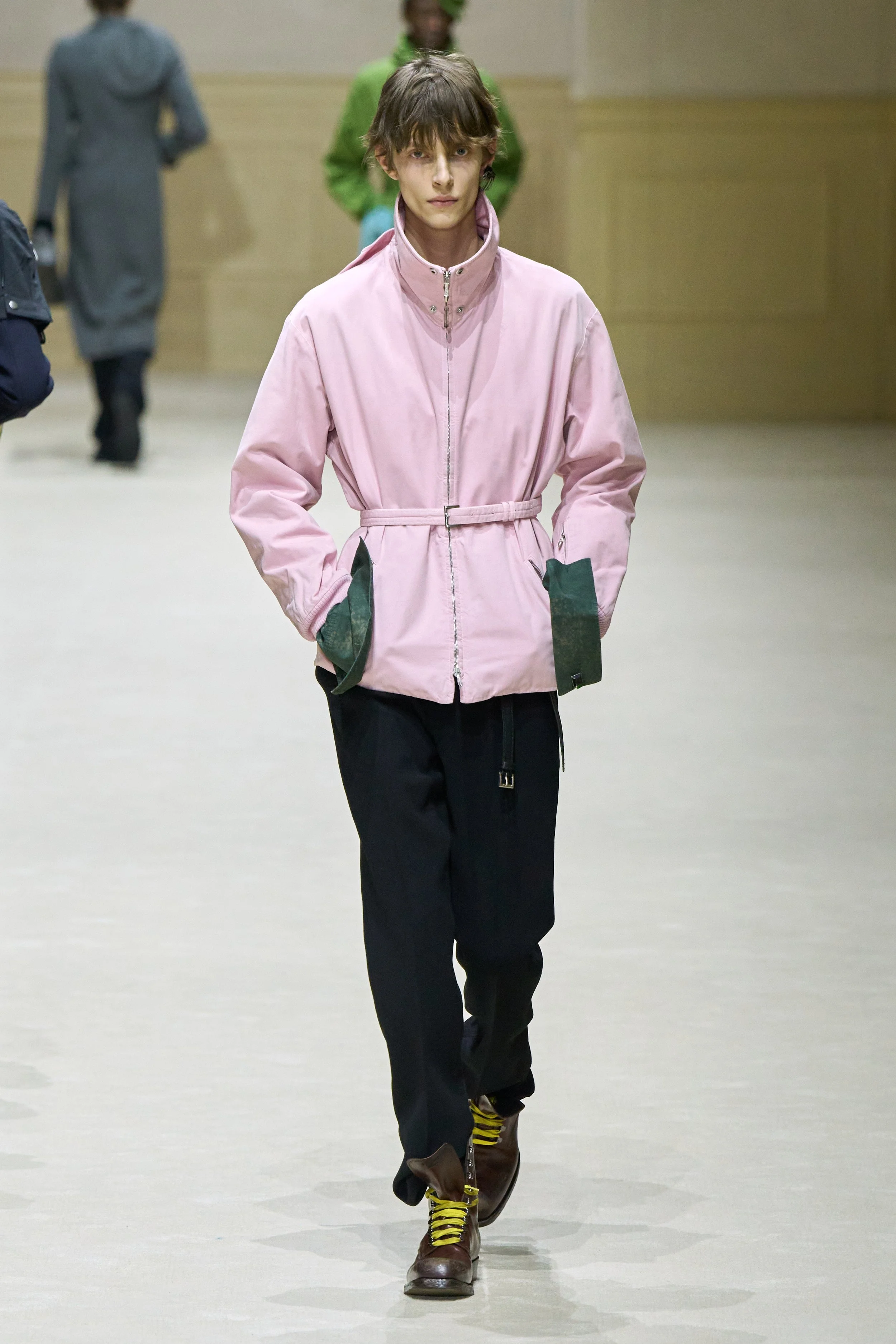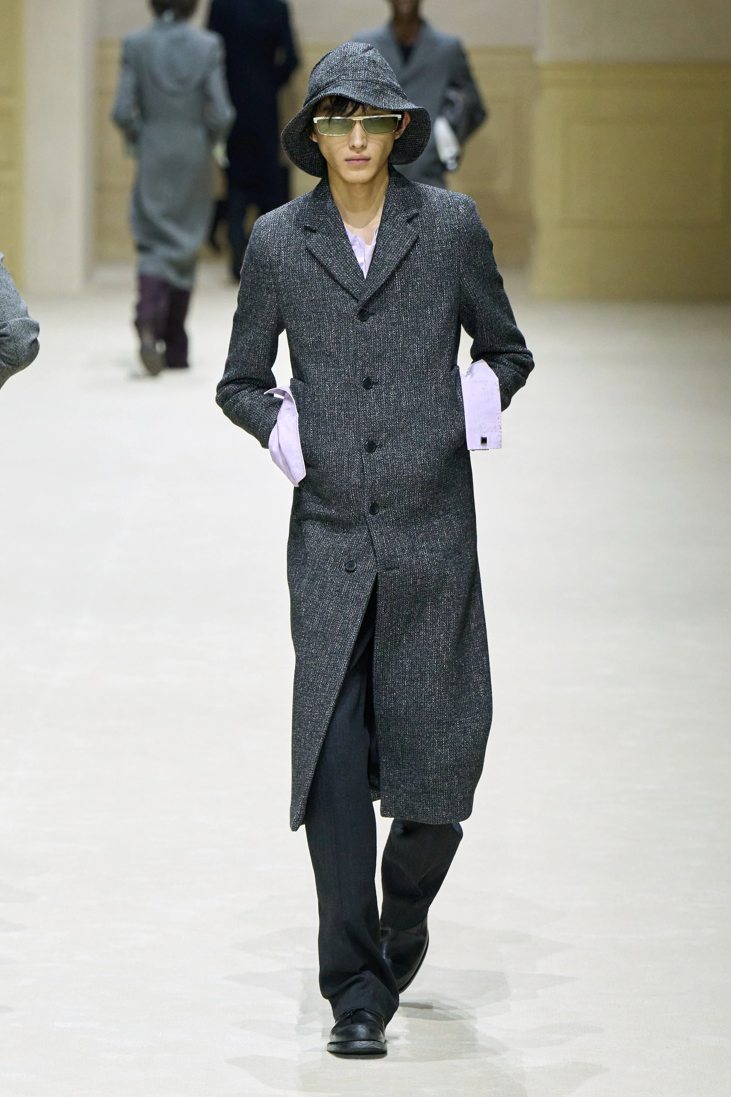 The most effective – and shareable – of the garments this idea was communicated in single-breasted coats, the back of which revealed a previous shell, in houndstooth, slowly chipping away to uncover the back seam and the triangular logo in the nape of the model's neck. Trench coats were creased, as if just taken out of the closet where they had been folded. Parkas had the imprint of matching hats.