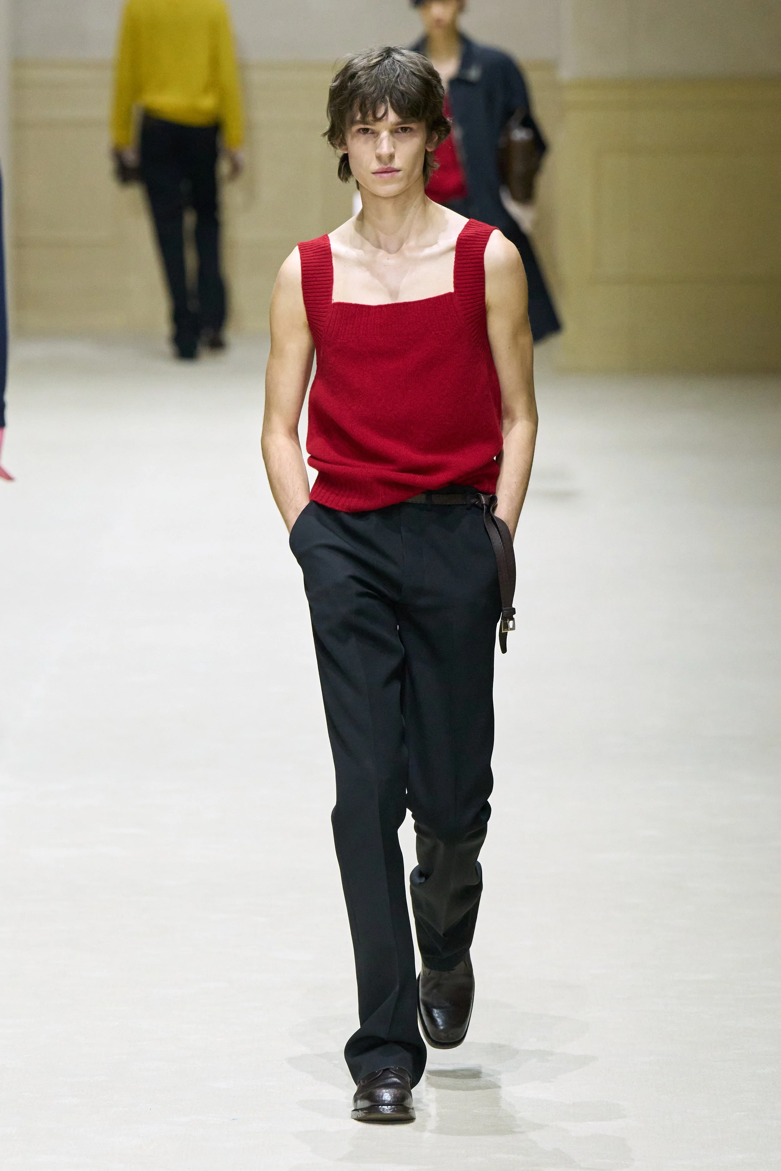 Here, knit vests were made boxy, almost awkwardly homemade. On a yellow knit jumper, the collar was loose, as if extended by use or being improperly hung. Signs of wear were elevated to the highest regard. In the age of mass consumption, patina is privilege.