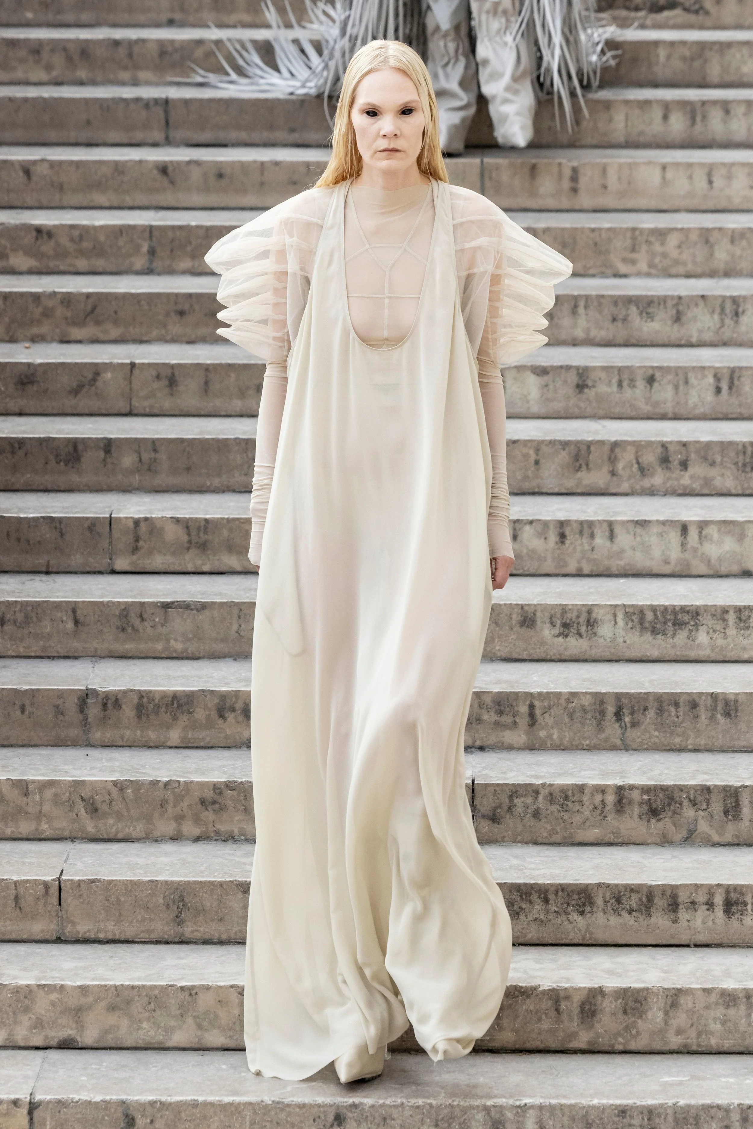 Movement appears in slim, elongated lines with floor-length gowns, contrasting with rigid, sculptural details such as sharp shoulders. As always, Rick Owens’ constructions are eclectic, sculptural, and architectural, creating a sense of monumentalism in each look. Fringe and cutwork details on jackets add both fantasy and raw deconstruction.