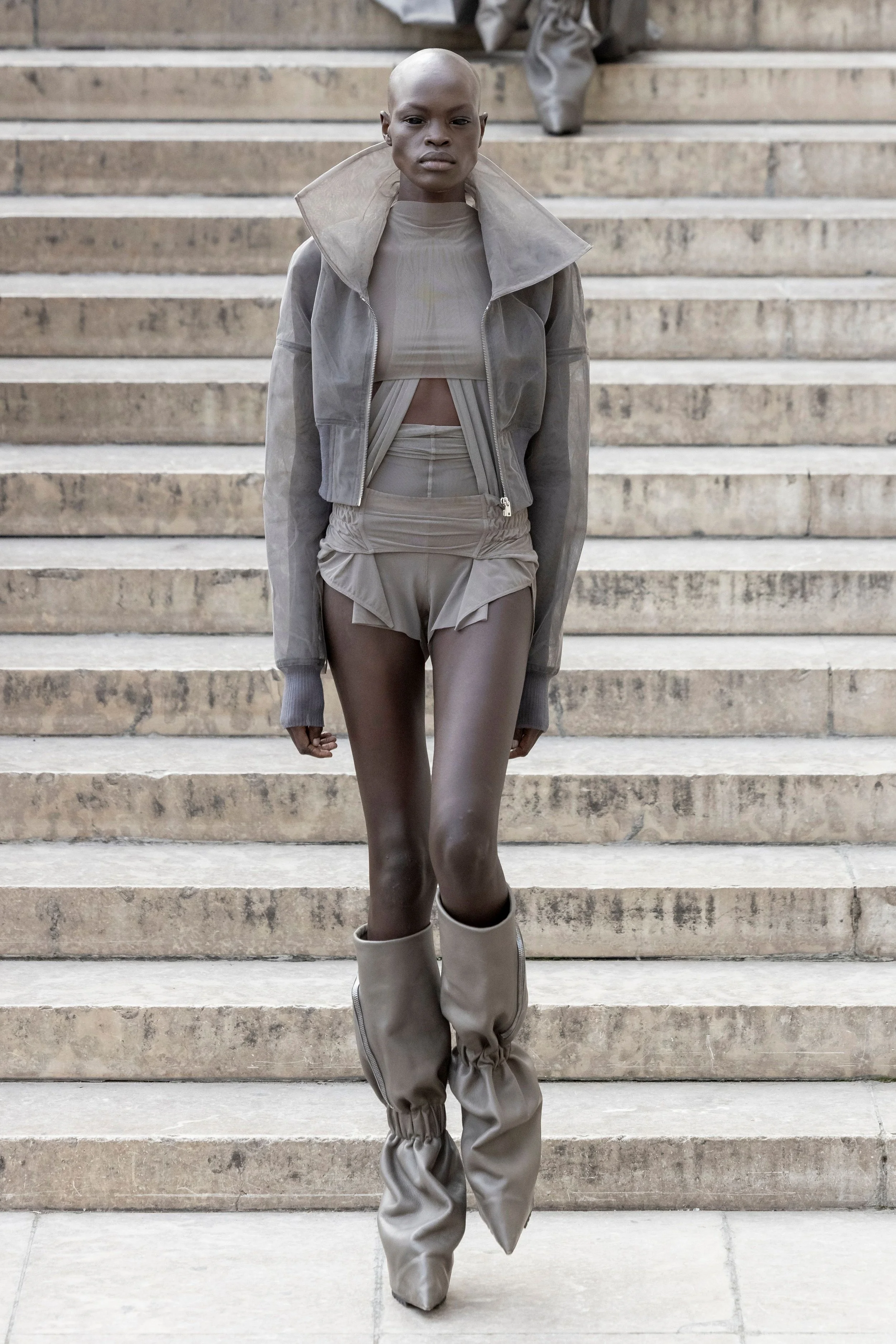 Rick Owens, faithful to his dystopian world, showcased a collection where futuristic, minimalist aesthetics blend seamlessly with artistic vision. The offering feels far sexier and, surprisingly, more wearable and commercial than previous ones, with looks such as leather jackets paired with shorts and boots.