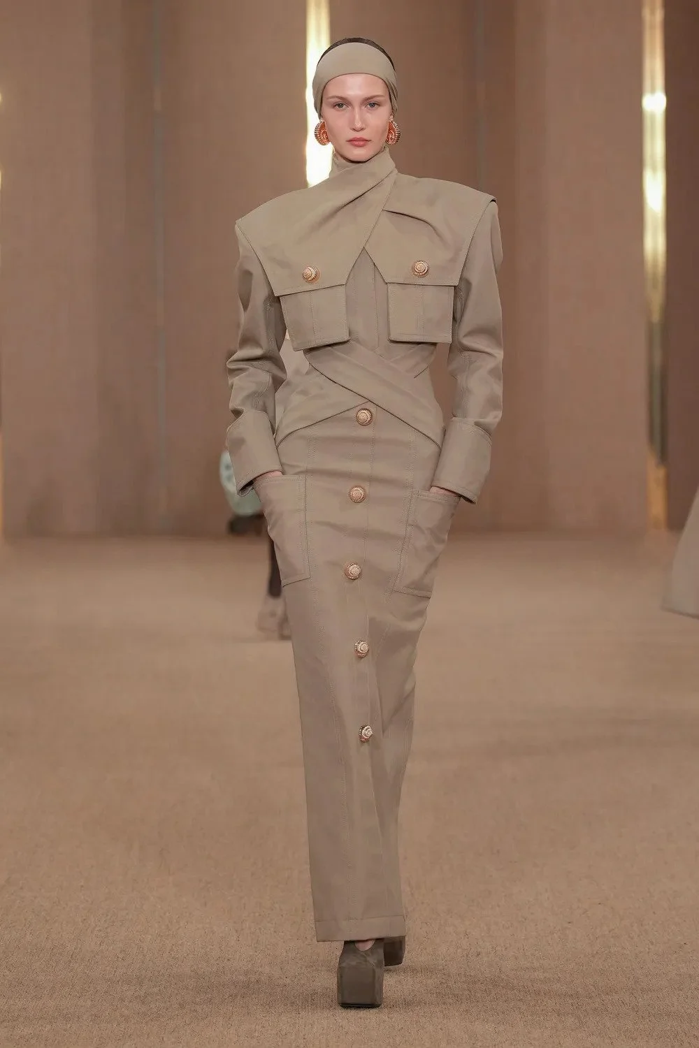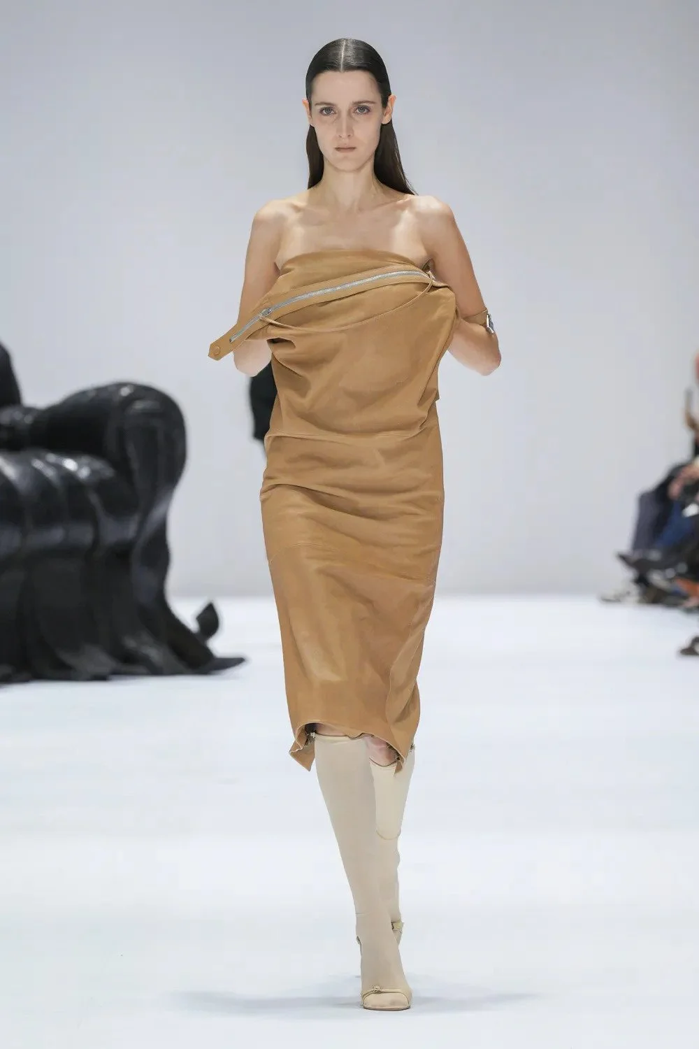 Descending from the spiral staircase came the first looks. Neutral, wearable, and classic; denim was paired with caramel suede and pale yellow chiffon. The signature Ancora red wasn’t just present in the bannisters outside the museum, it was frequently seen as a pop of colour in neutral looks or monochromatic playsuits and full leather sets.