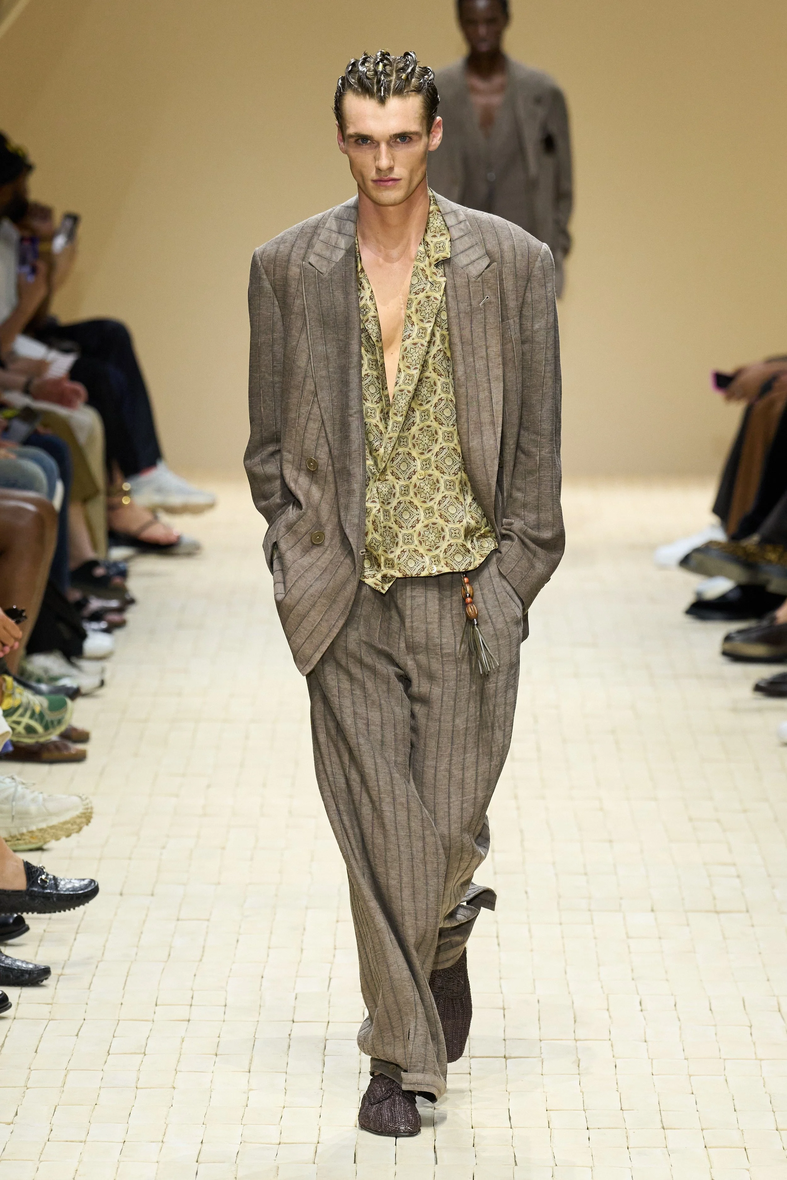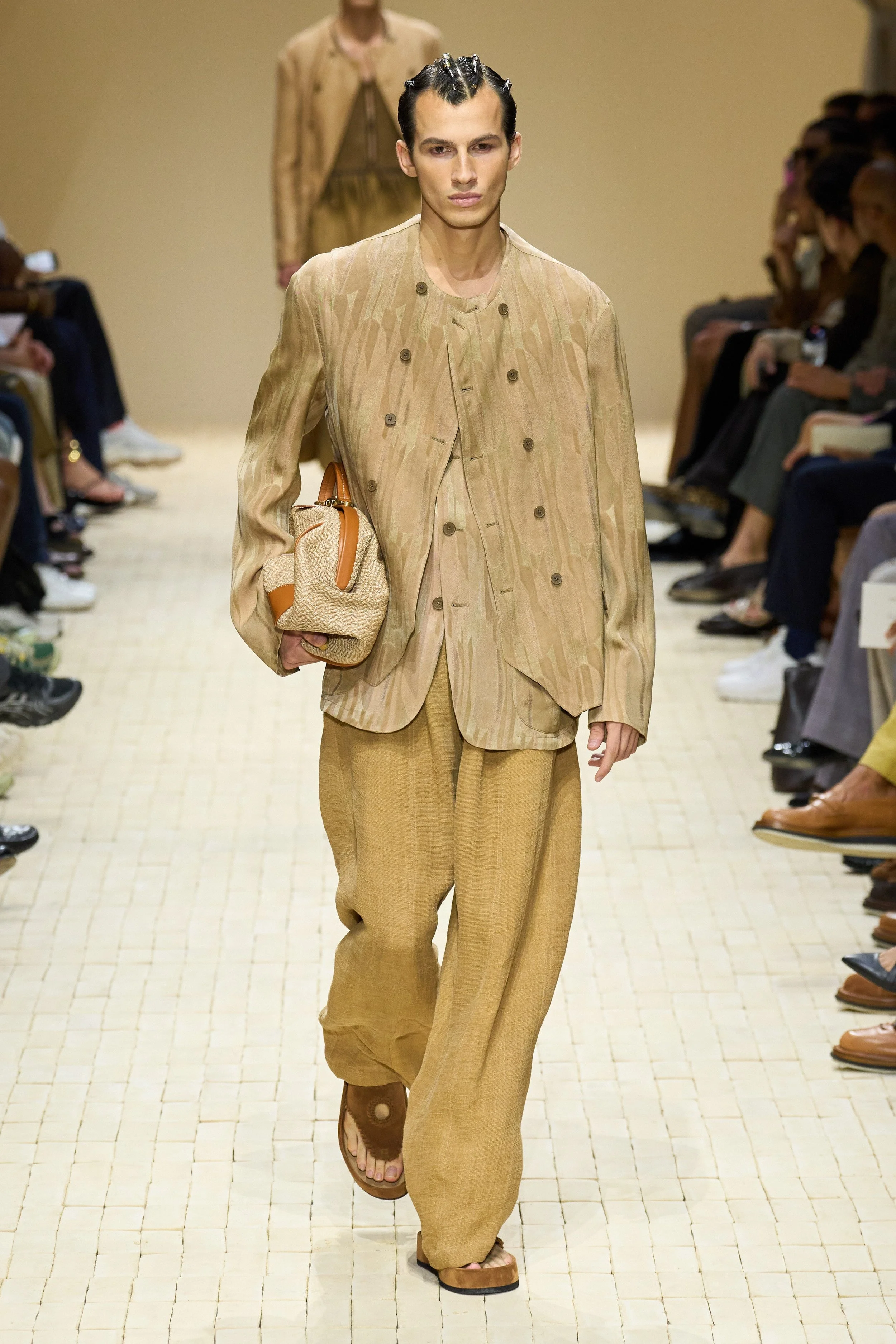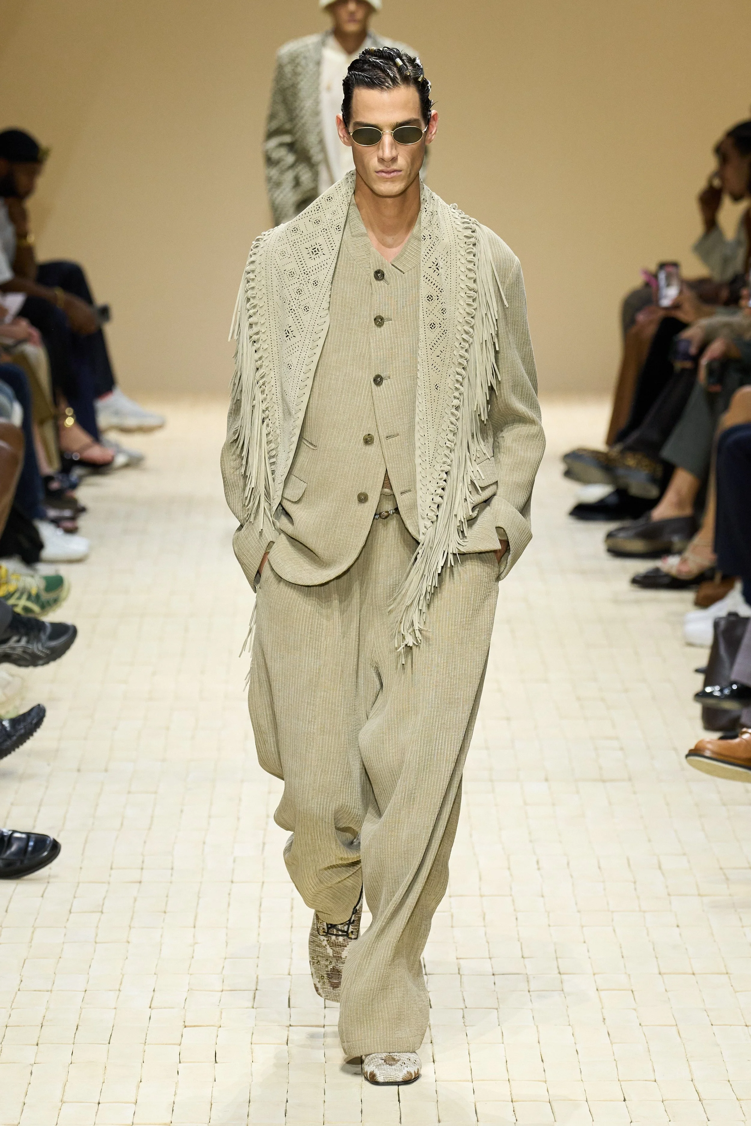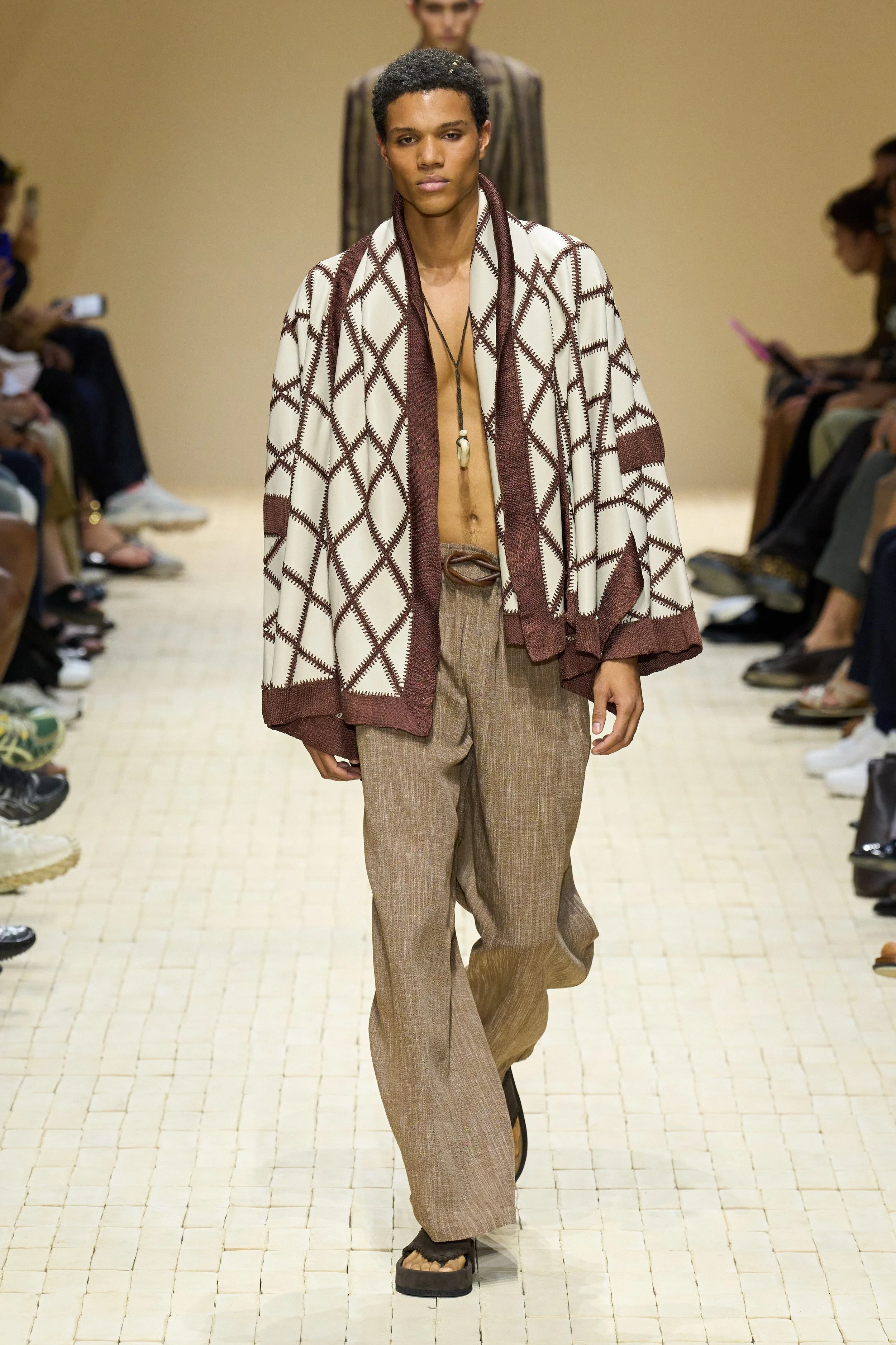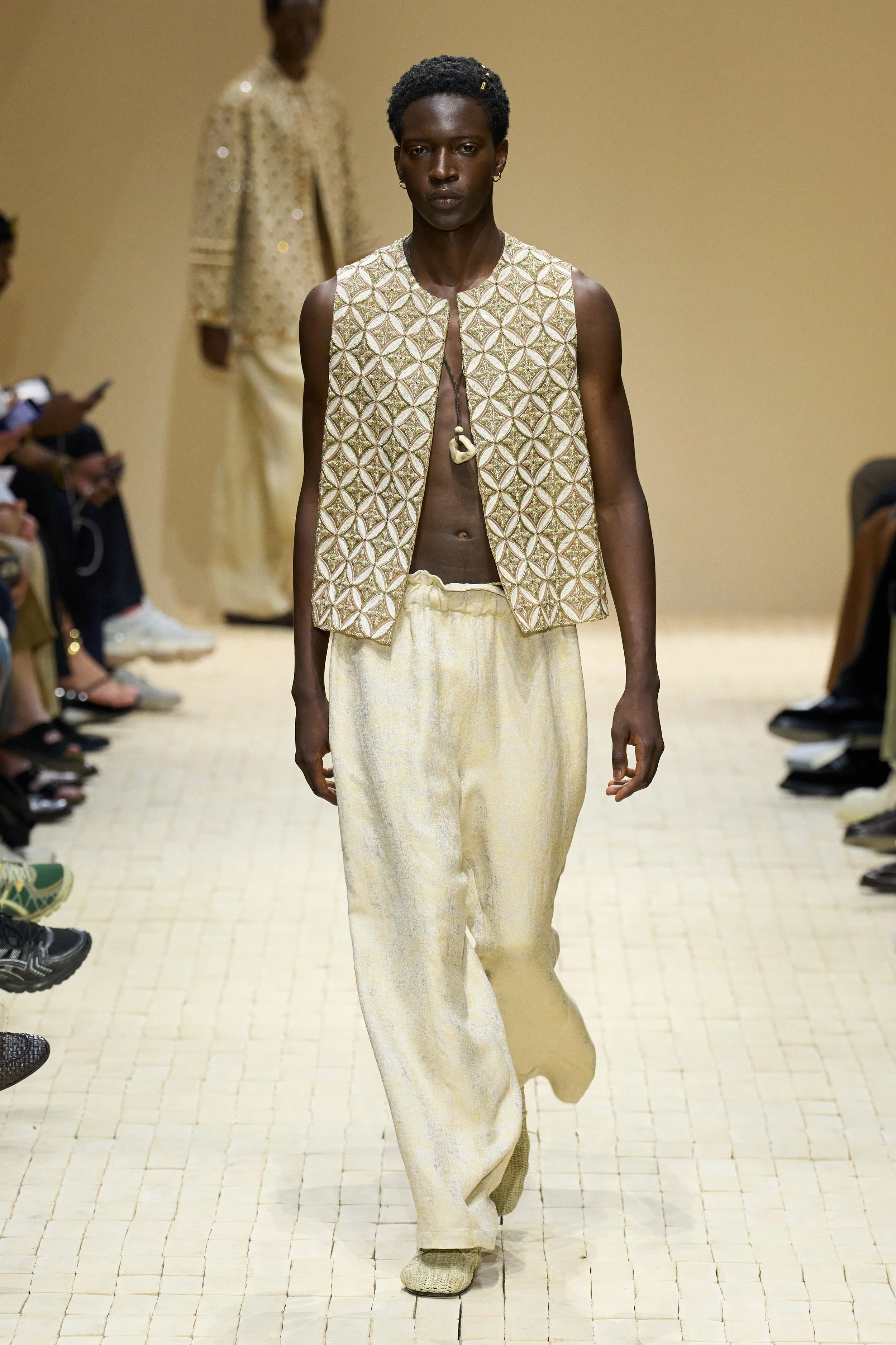 Each season, Owens explores fashion through a concept, turning his shows into a kind of ritual. Central to his events is smoke, which typically creates a dramatic, almost solemn atmosphere. But this time, it was water that served as the catalyst for the showcase. Models descended the stairs to find themselves in the middle of a fountain—water became the runway, a living prompt to display the clothing. Some immersed themselves in the water in what felt like a rebirth ceremony.