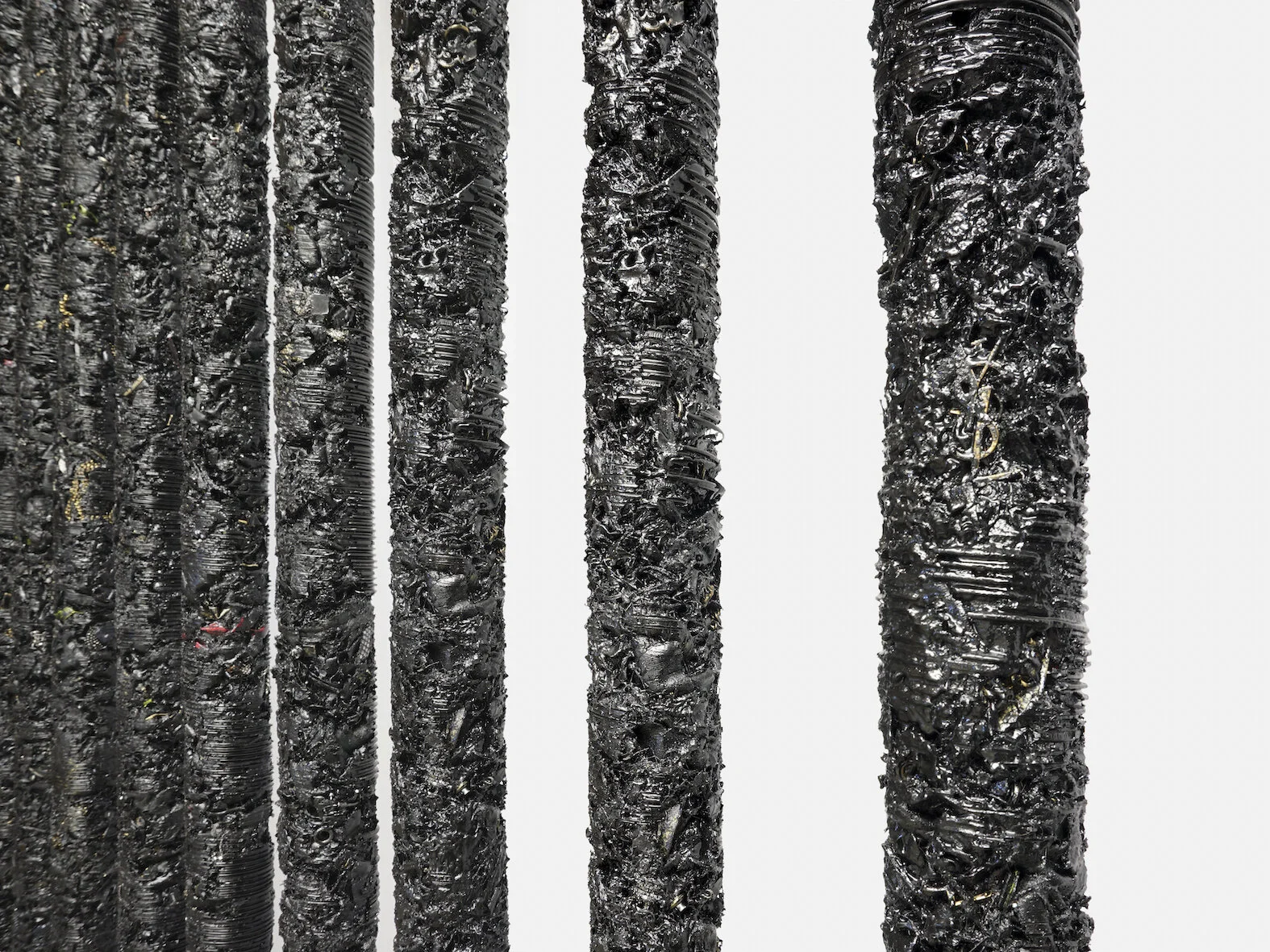 Shredded, mixed with a pigmented resin then molded in aluminum, these former fashion objects will become primal totems with unique textures reminiscing both, a precious past and a promising future.