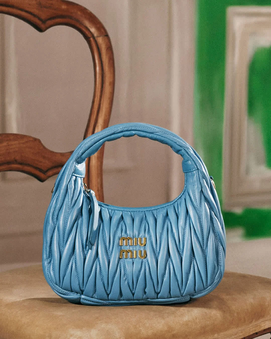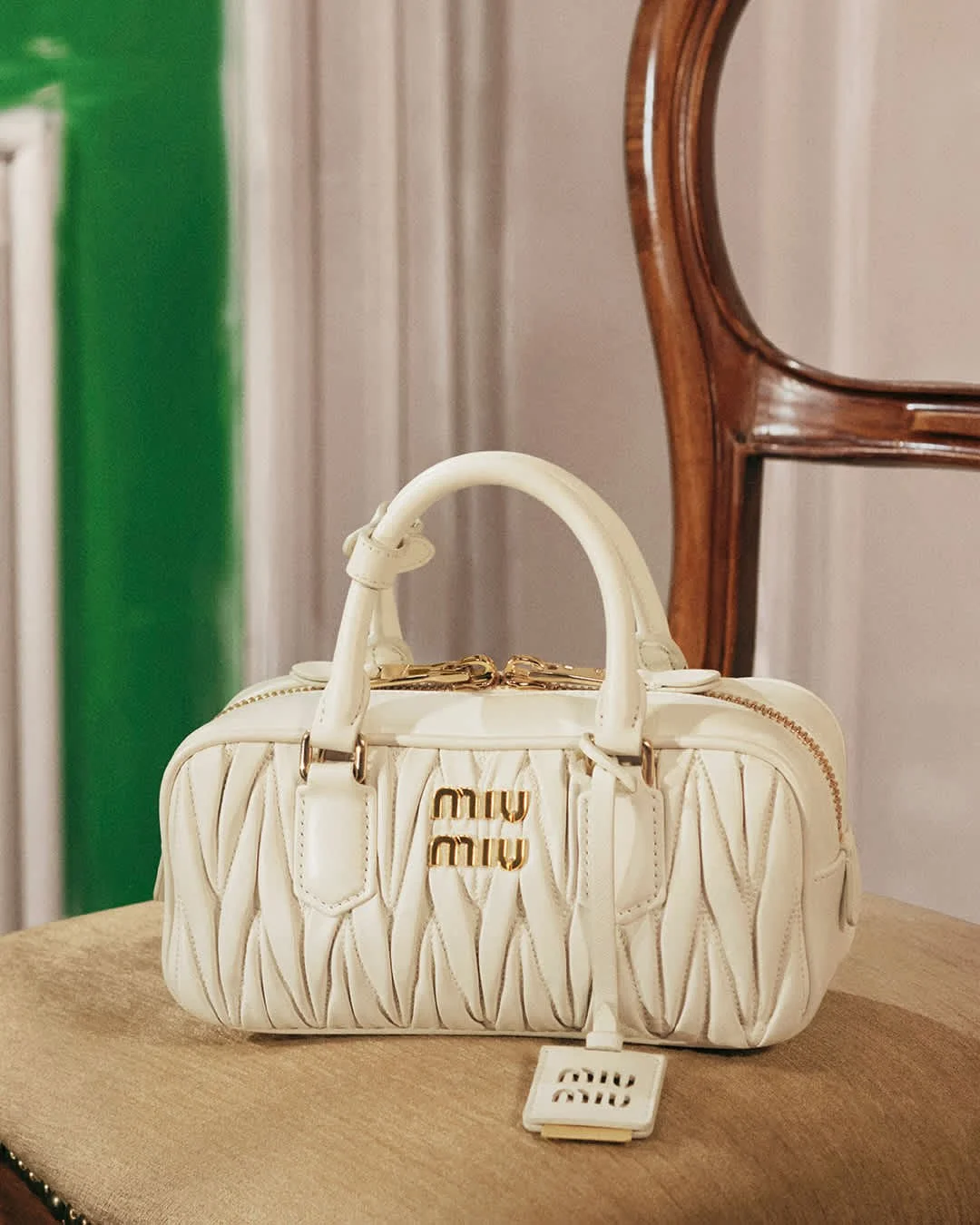 At the center, the Arcadie and Wander bags emerge as both accessories and statements, rendered in Miu Miu’s signature matelassé leather. Their tactile forms and bold palette subtly disrupt the muted décor, reinforcing a dialogue between tradition and individuality.
