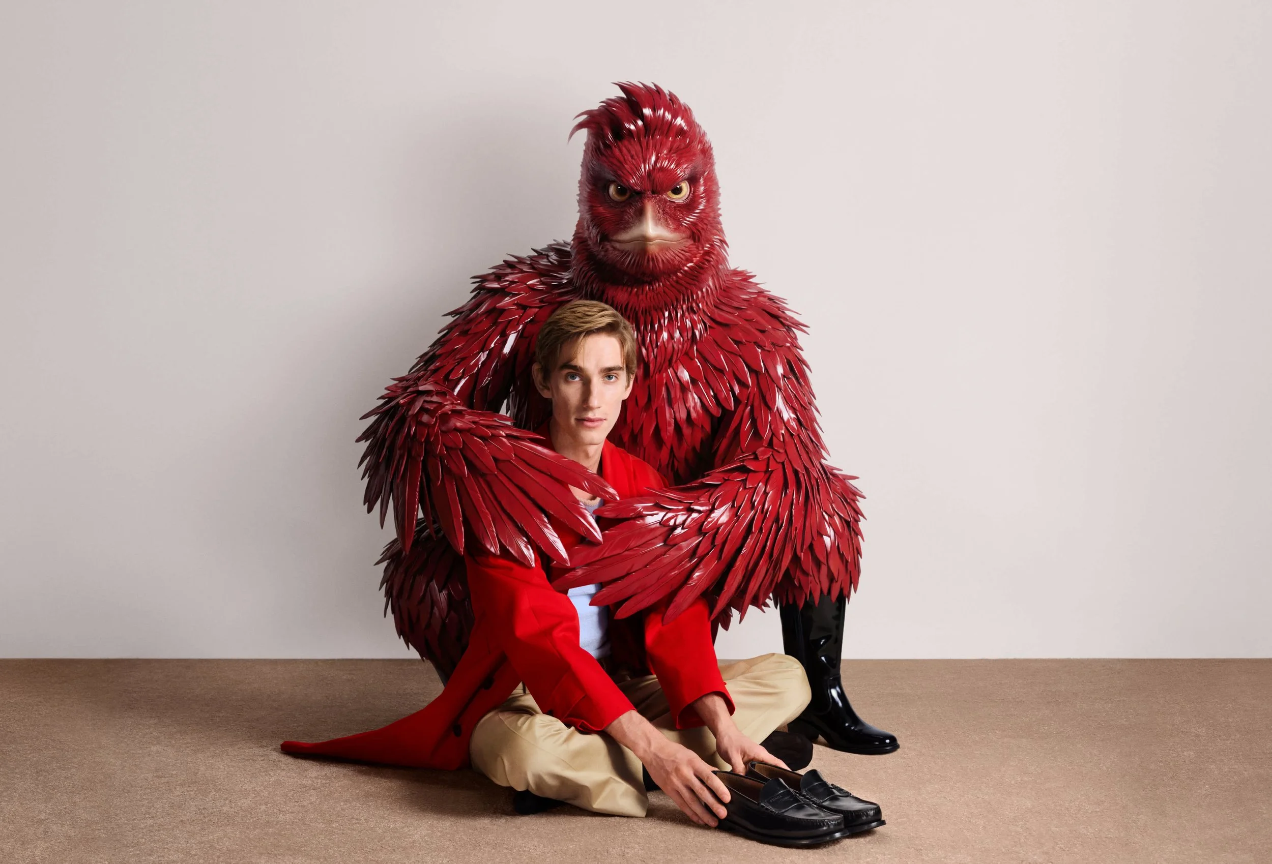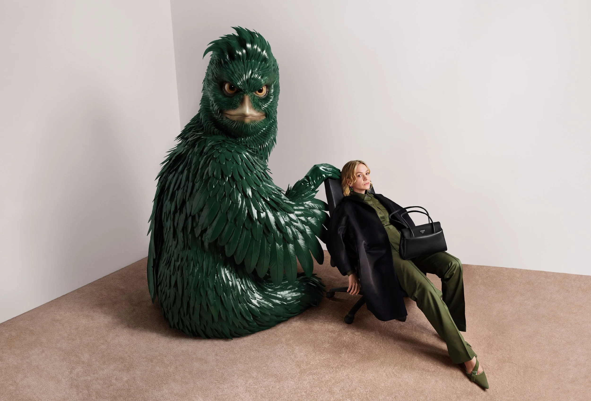 In collaboration with Prada, he creates unnamed creatures that interact with the cast, merging imagination with tangible form. These hybrid figures inhabit both still imagery and film, blurring boundaries between reality and fiction. The campaign culminates in a short film where voices repeat the mantra: “I, I, I, I am…”, a declaration left deliberately unresolved. This open-ended statement invites reflection on identity, perception, and self-definition. Wolfson’s intervention ultimately expands Prada into a space of endless reinterpretation, where meaning remains fluid and continuously questioned.
