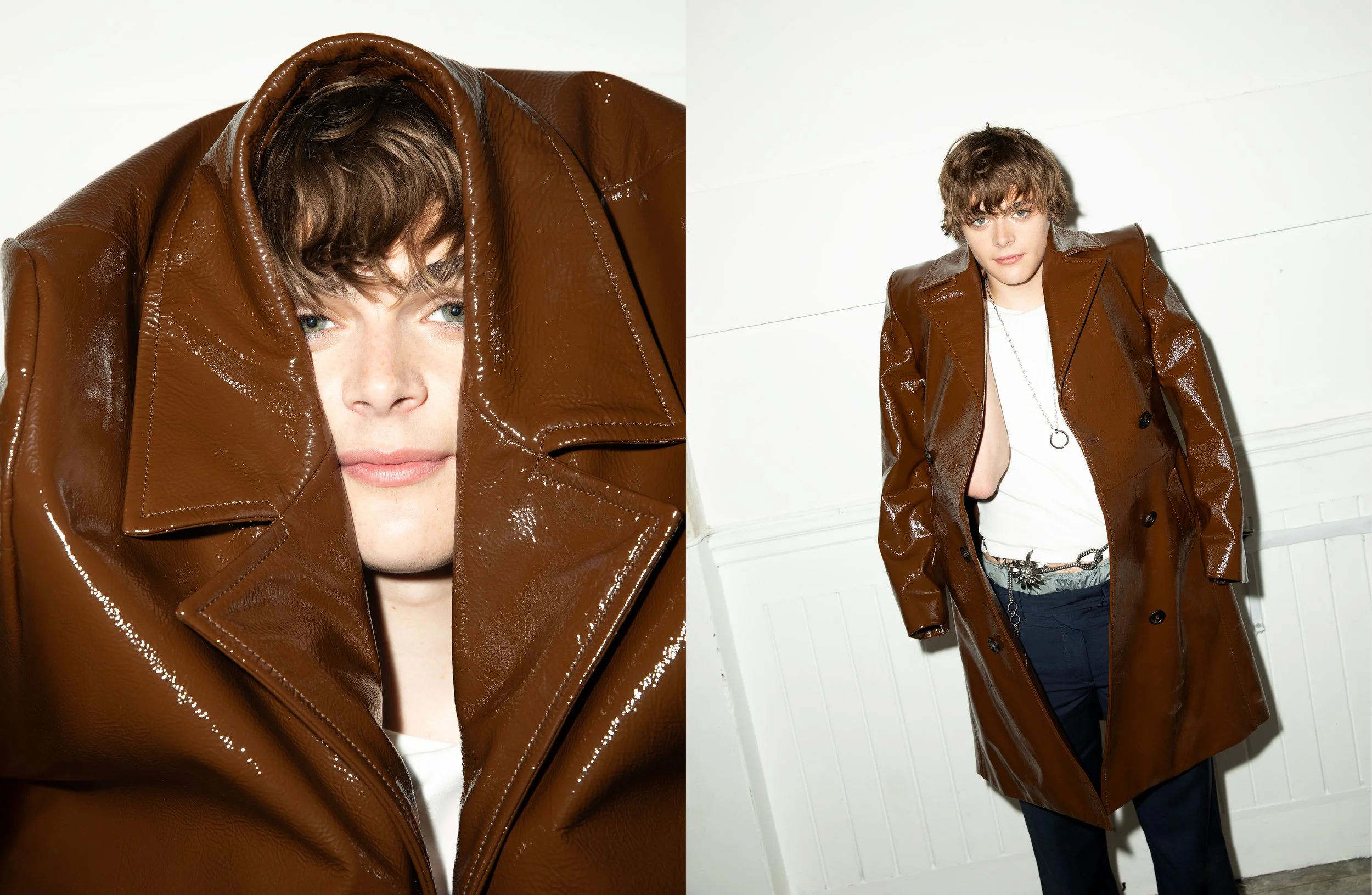 Coat, T-shirt, pants, boxer & belt Miu Miu, shoes Kenzo, necklace & rings Cartier