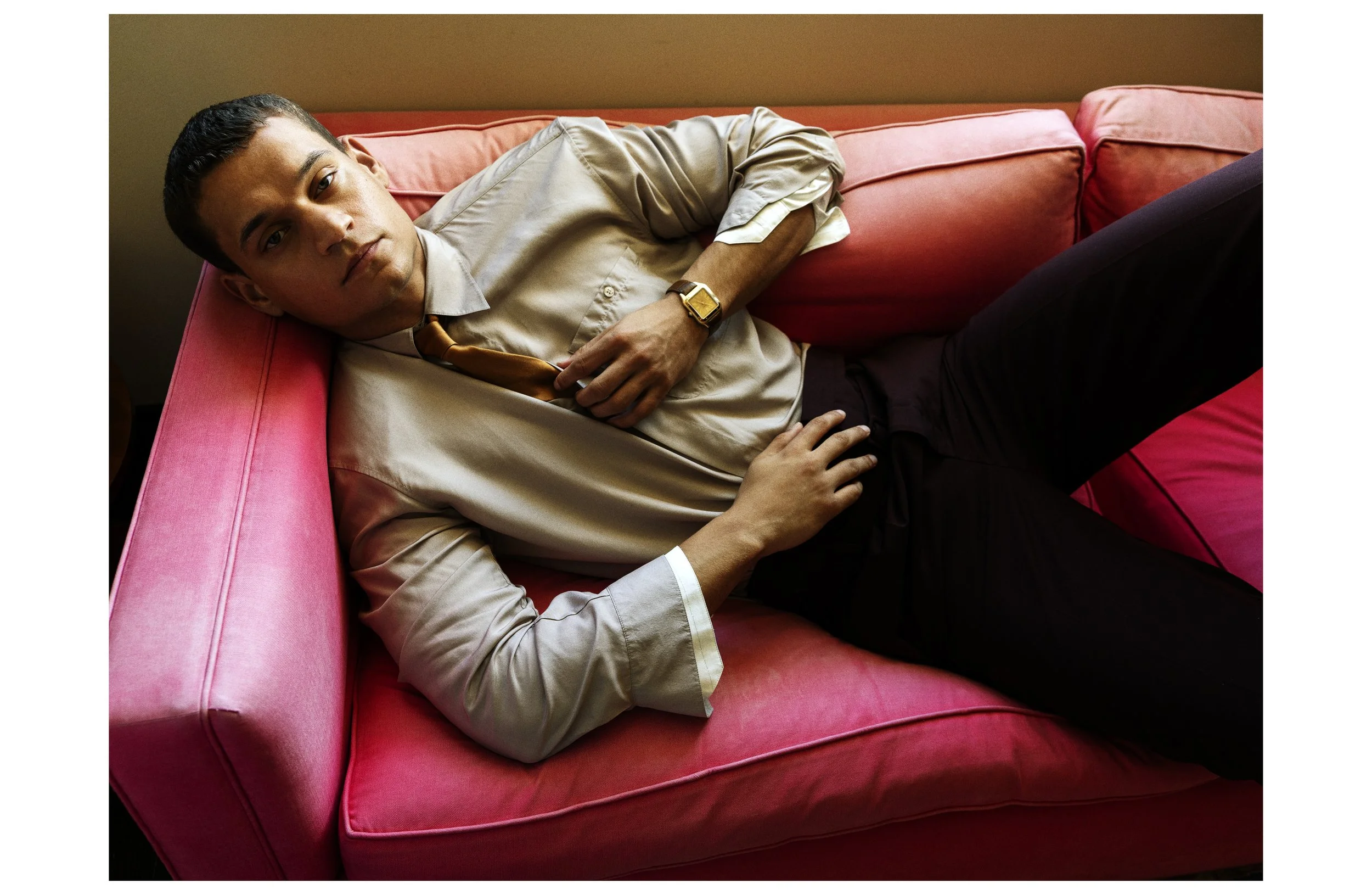 Shirt, tie and pants Saint Laurent by Anthony Vaccarello, watch Cartier