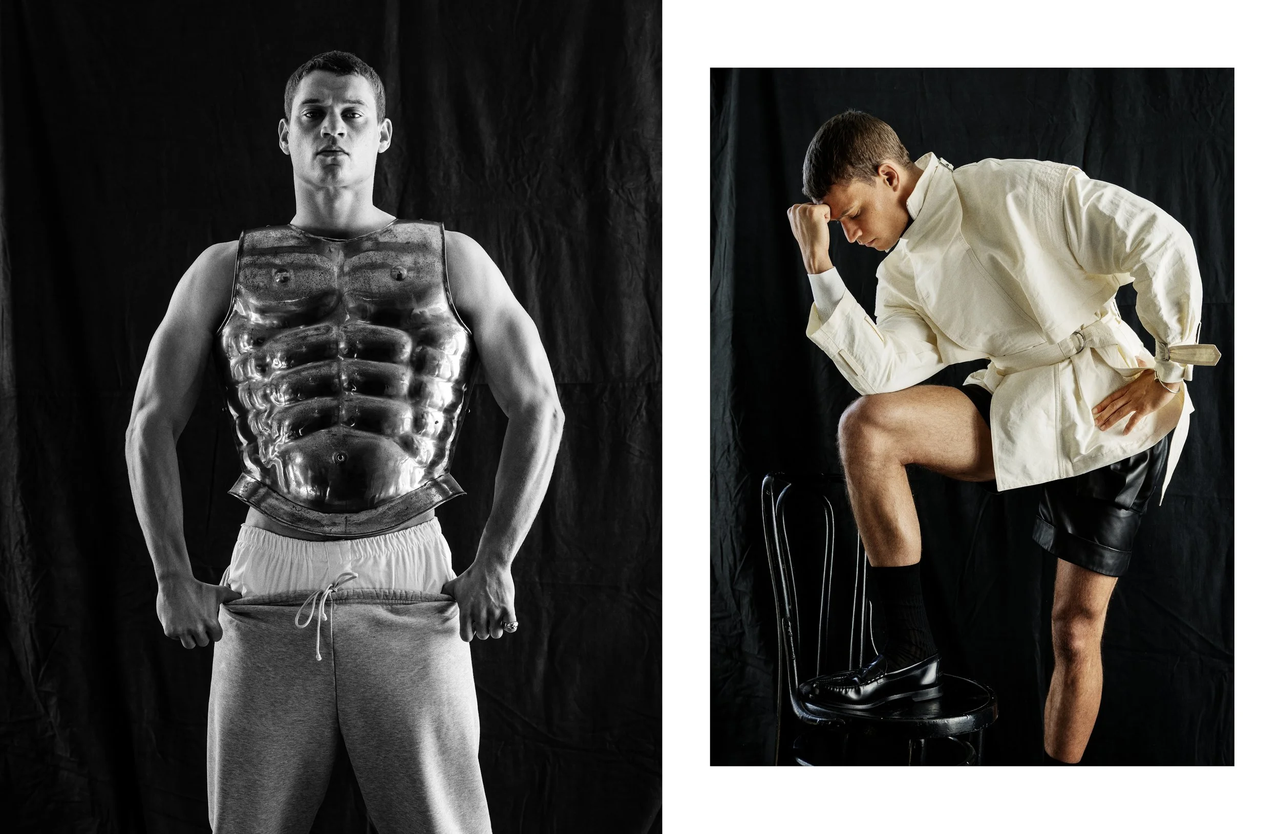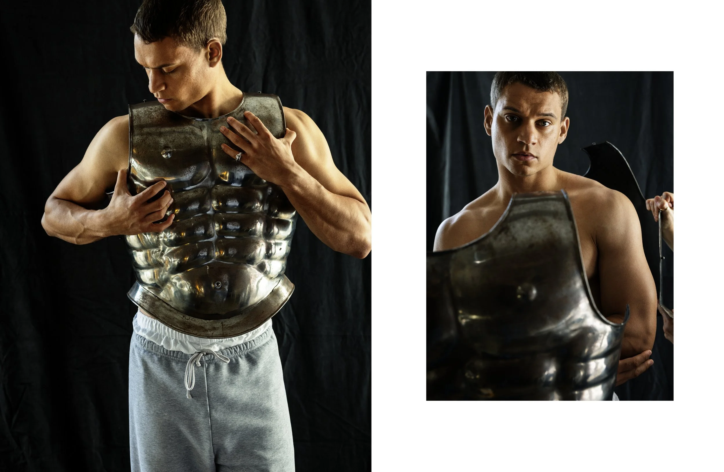 Left Vintage steal body armer, boxers Fruit of the loom, sweatpants Skims
