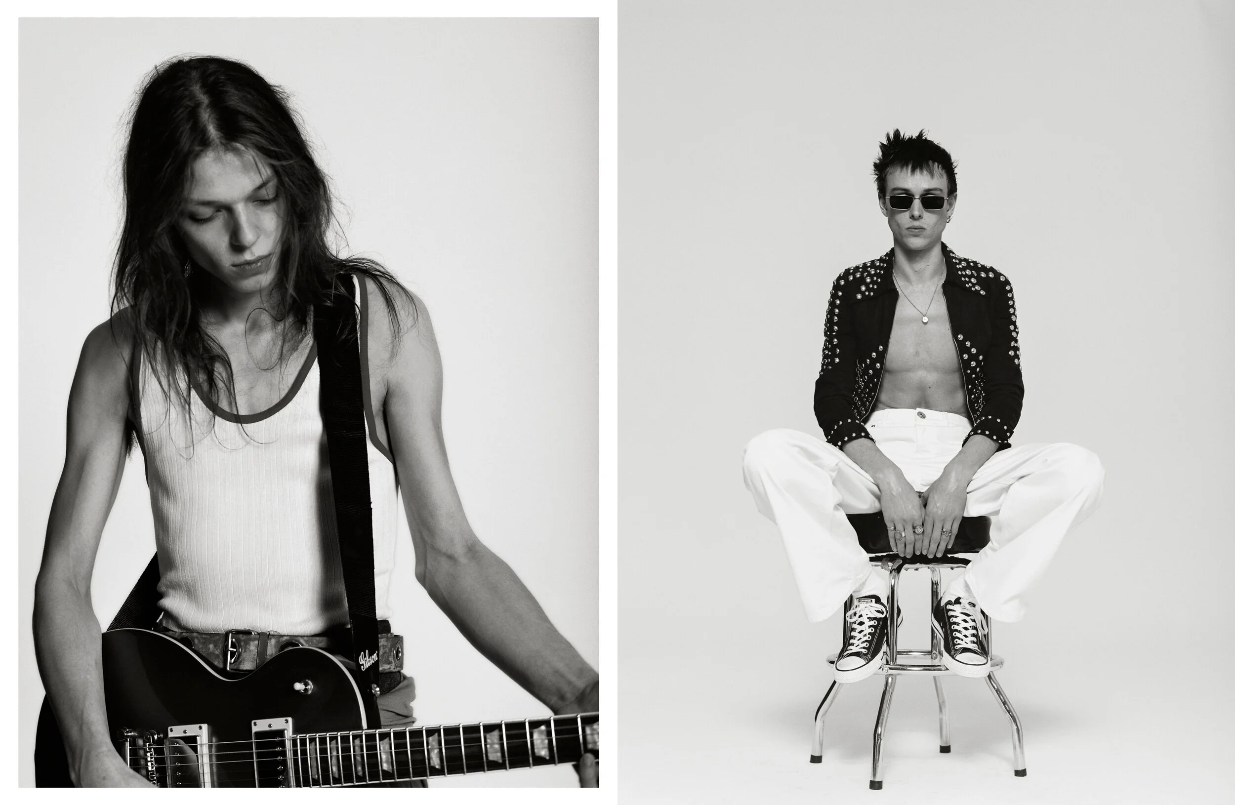 JACKET, BLACK VELVET PANTS & BLACK LEATHER SHOES CELINE HOMME BY HEDI SLIMANE, RING & NECKLACE TANT D’AVENIR, RING WITH CROSS ARCHIVE MAXENCE , BRACELETARCHIVE MAXENCE , SILVER AND ORANGE BRACELET CHLOE VINTAGE, GUITAR Gibson ES-195 Figured Ebony, GIBSON