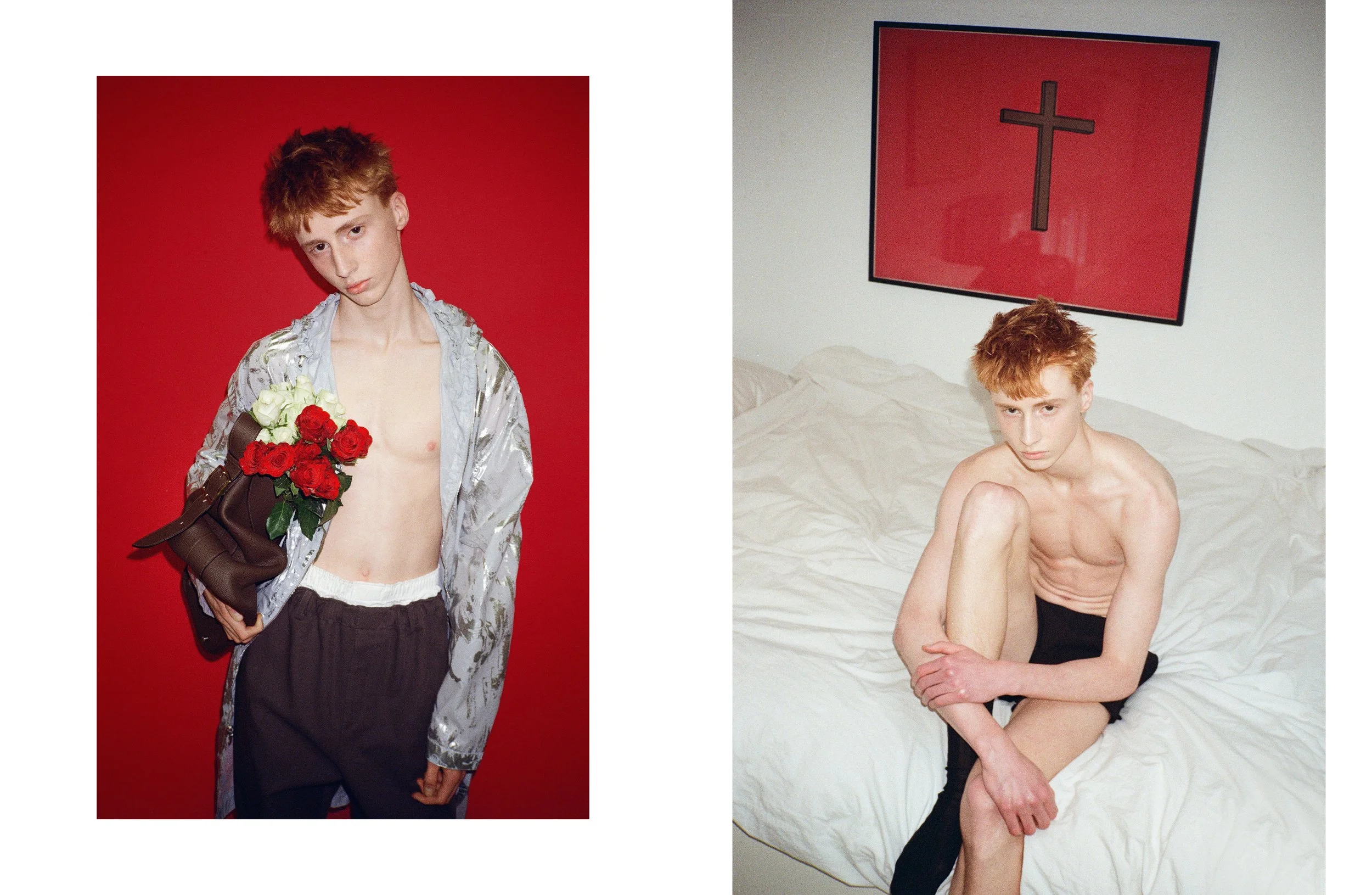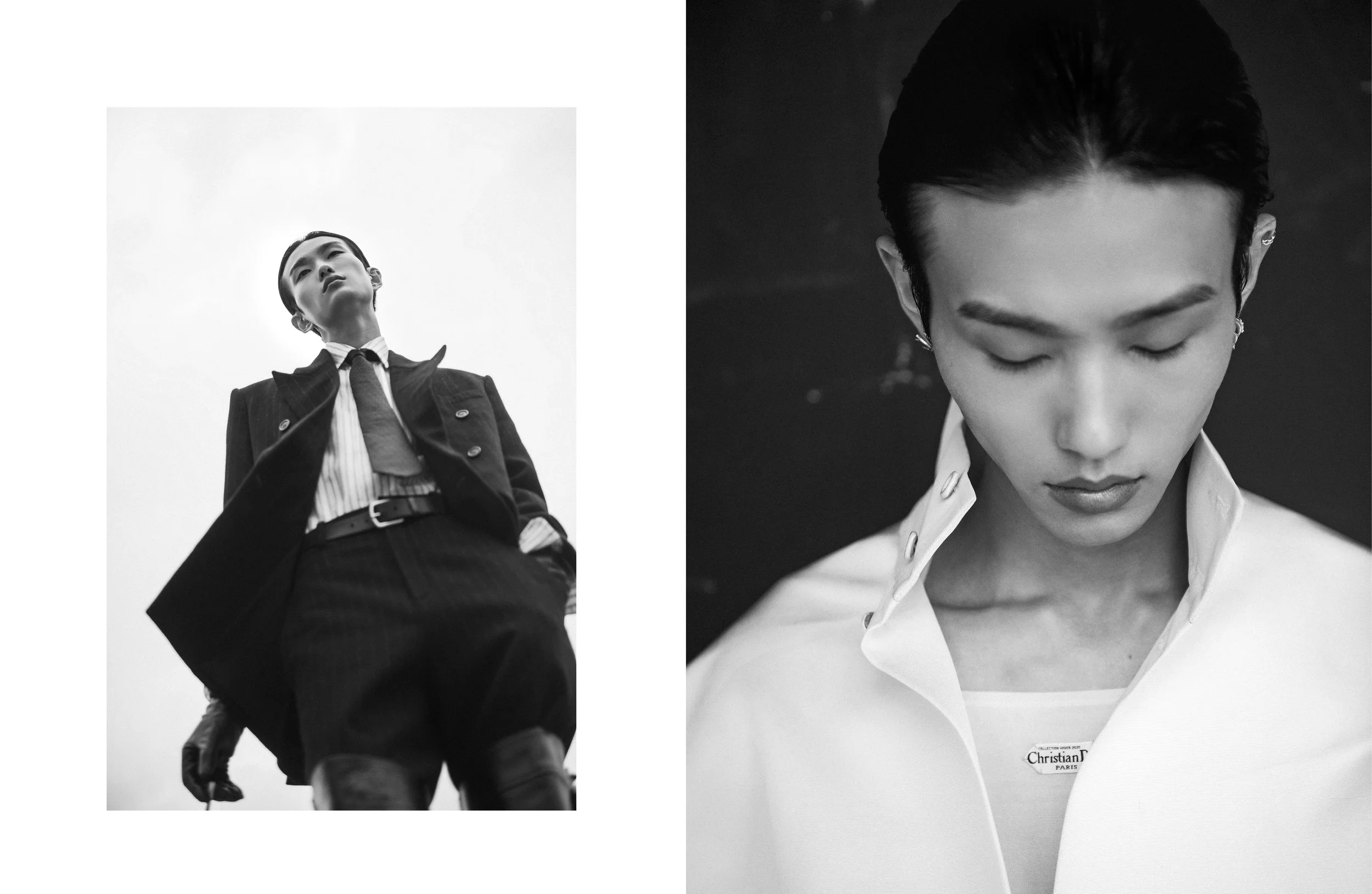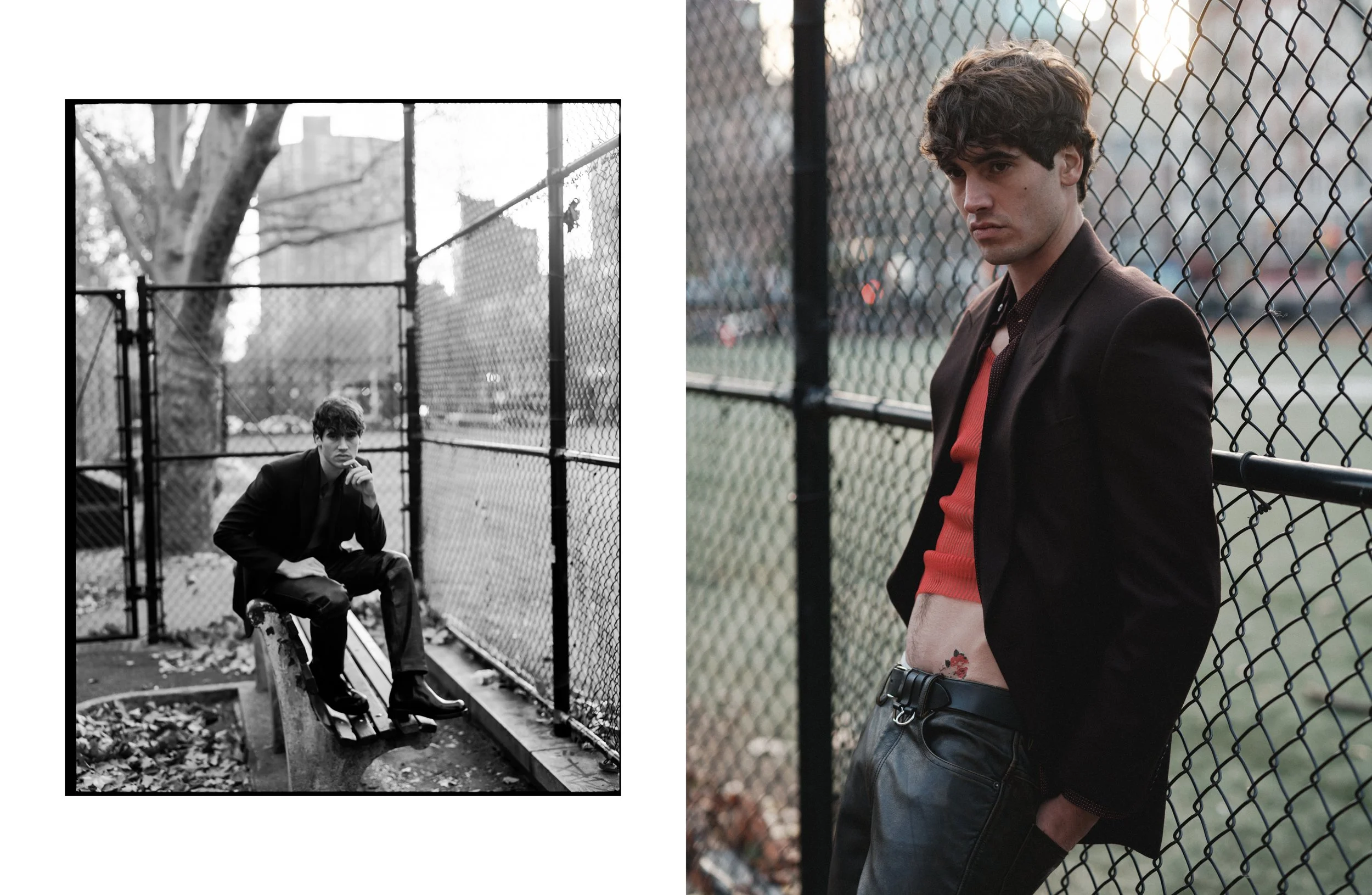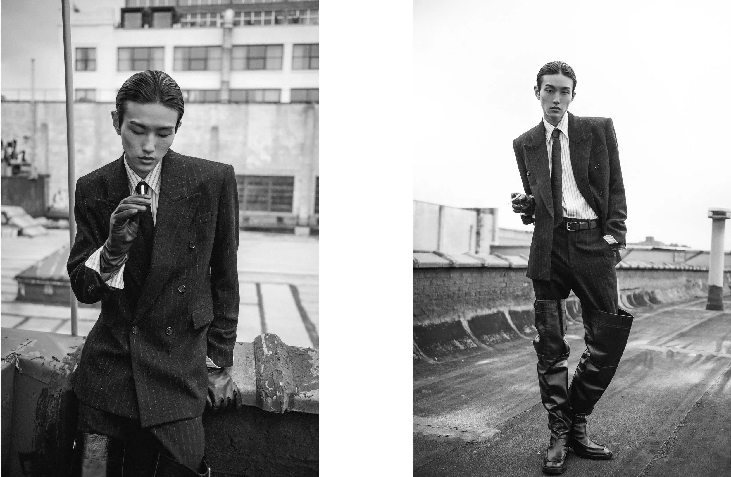 Jacket, shirt, pants, bag, earrings Dior Men, gloves Saint Laurent by Anthony Vaccarello