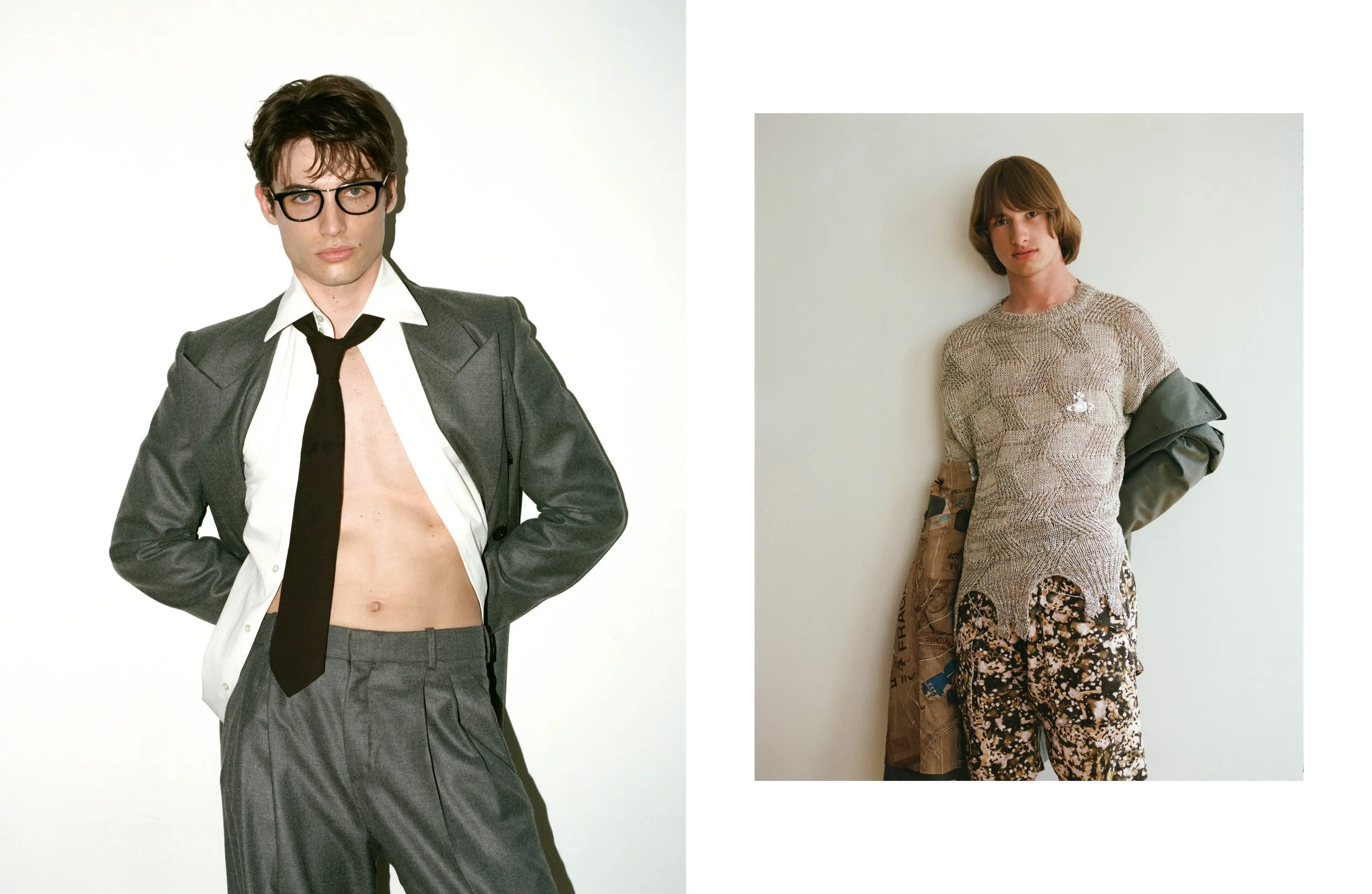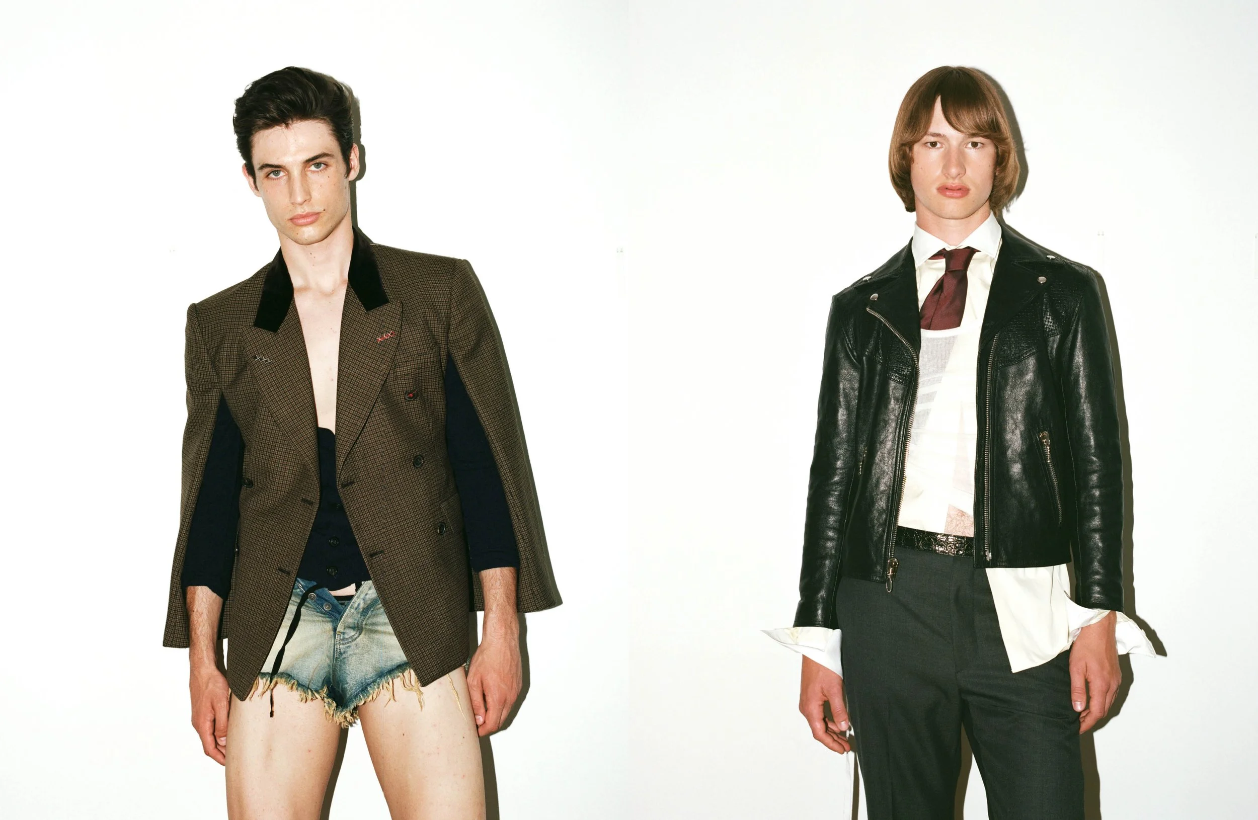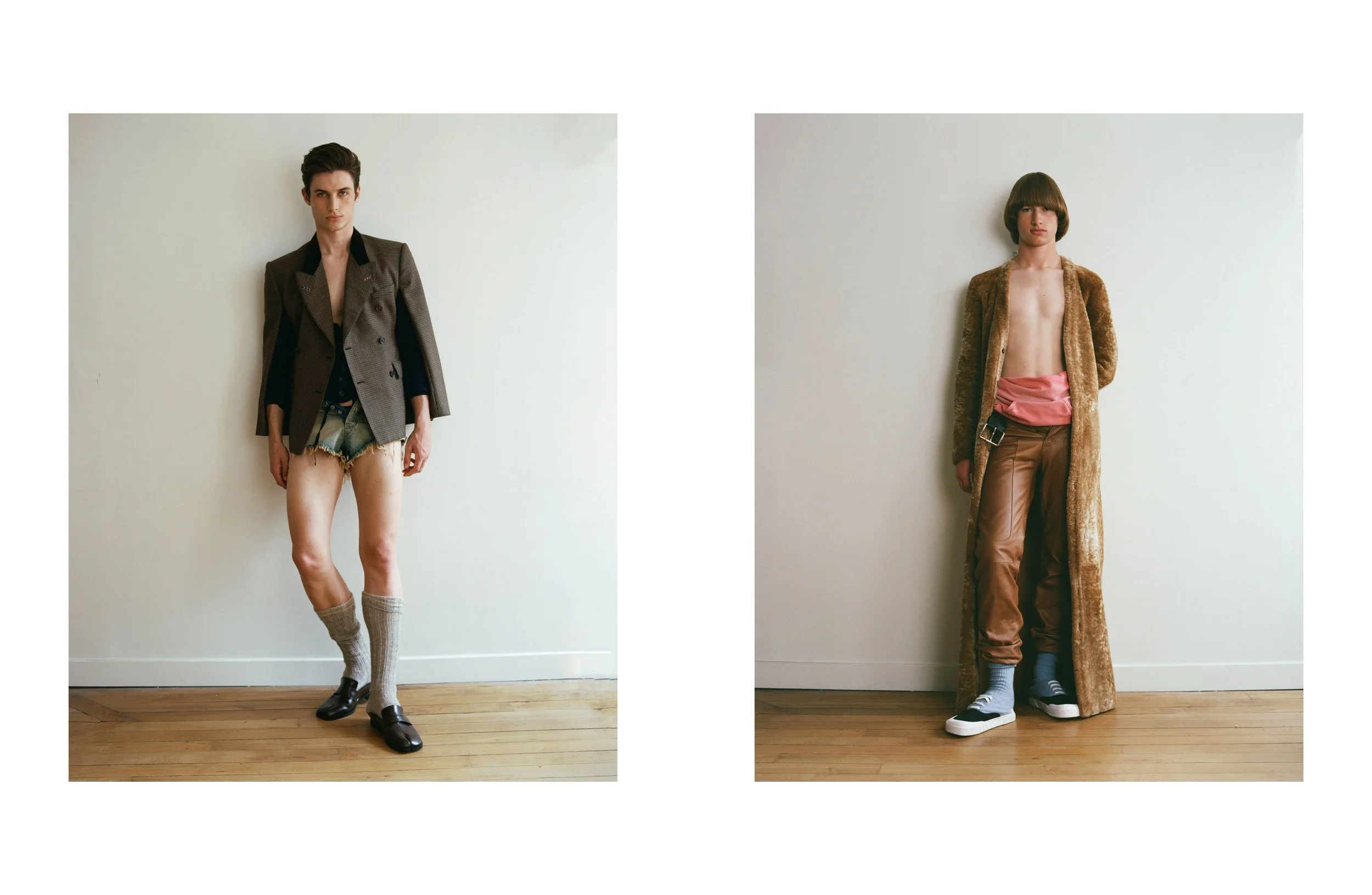 Left From left to right Coat and sweater Vivienne Westwood, shorts Isabel Marant, boots Celine Homme and Full look Maison Margiela