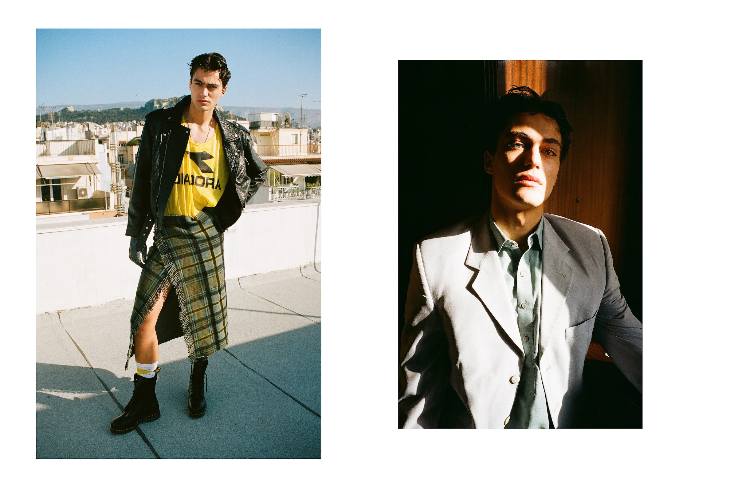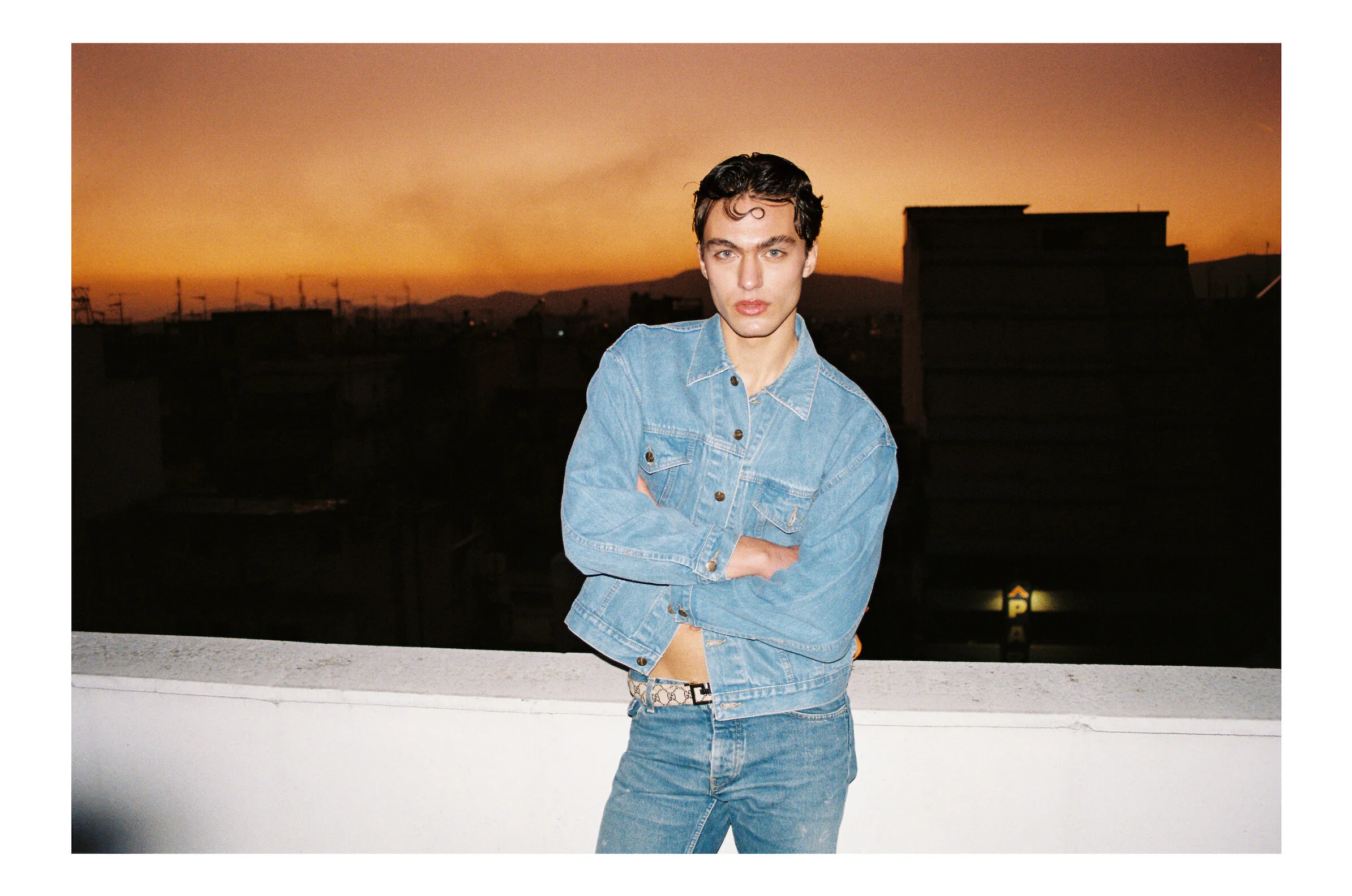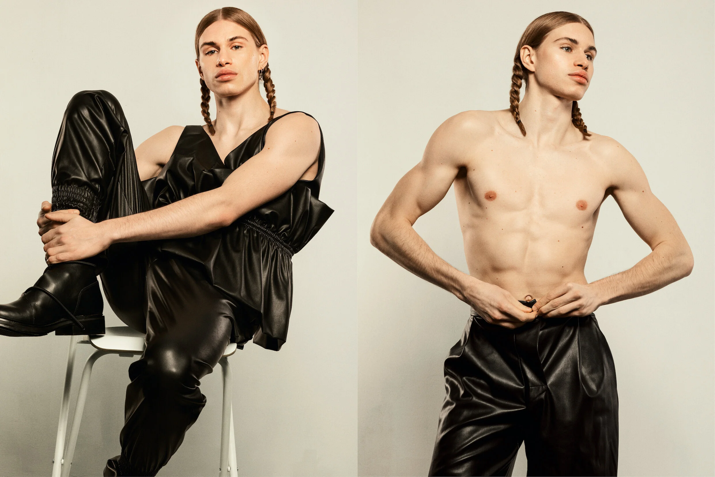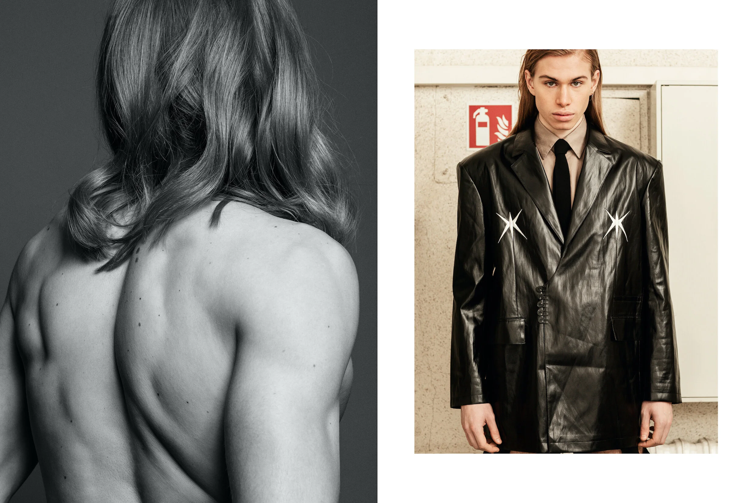 NICOLAS / T-SHIRT with breasts vintage ARCHIVE MAXENCE, CHECK SHIRT (around the hips) GUCCI, BLACK LEATHER PANTS, CELINE BY HEDI SLIMANE, SNEAKERS AMI PARIS, HANDMADE STONES BRACELET ARCHIVE MAXENCE, SILVER BRACELET TANT D’AVENIR, BRACELET LACES ARCHIVE MAXENCE